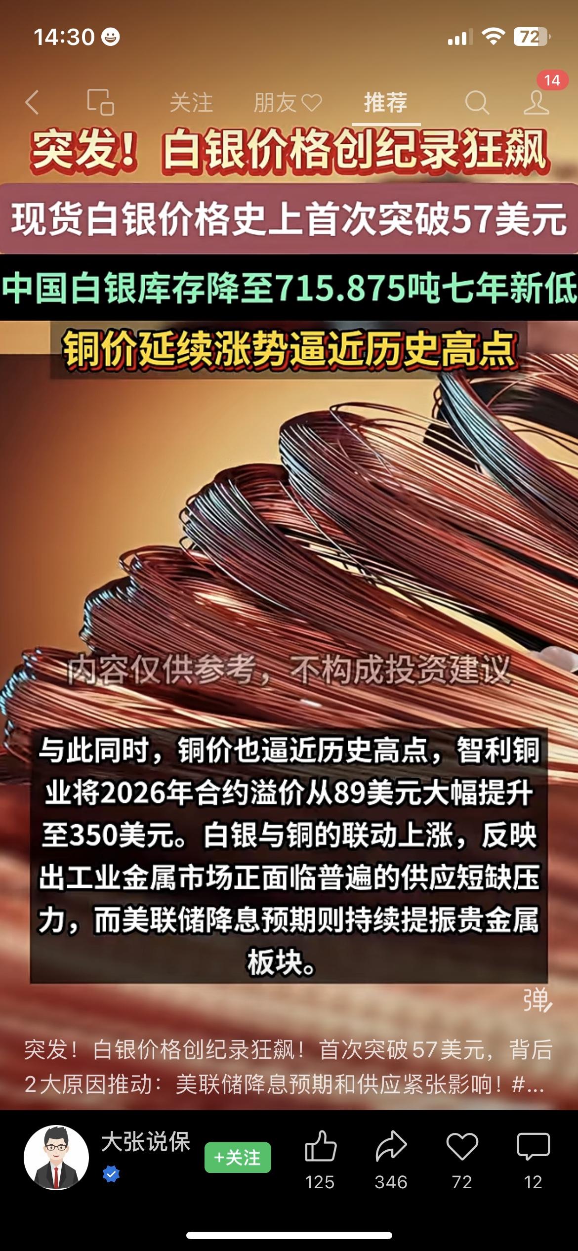 白银和铜彻底疯了!这波行情根本停不下来🚀 现货白银首次突破57美元/盎司,中国库存跌到七年新低;铜价逼近历史高点,智利铜业把2026合约溢价从89美元直接涨到350美元! 一边是美联储降息预期,一边是供应短缺,洪灏都特意提了白银的机会,说中国自古就是“双货币体系”,白银曾是主要储备货币。这波涨势能持续到年底吗?敢追吗?白银 白银价格疯涨