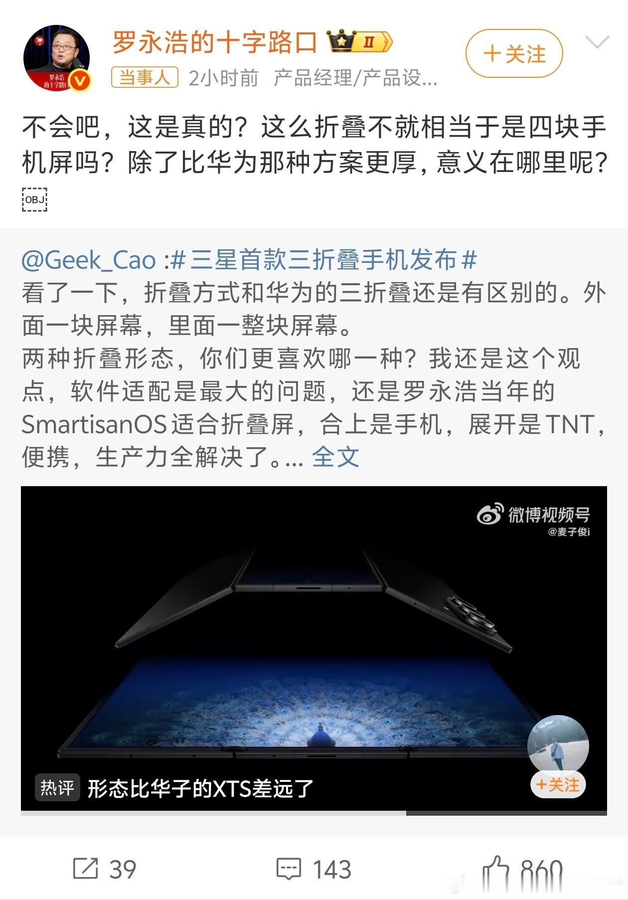 罗永浩谈三星三折叠老罗评价三星首款三折叠屏手机,认为其除了比华为更厚,没啥意义。虽然话说的很直接,但从实用性来看的确需要打个问号。大家是喜欢华为的设计?还是三星的设计?