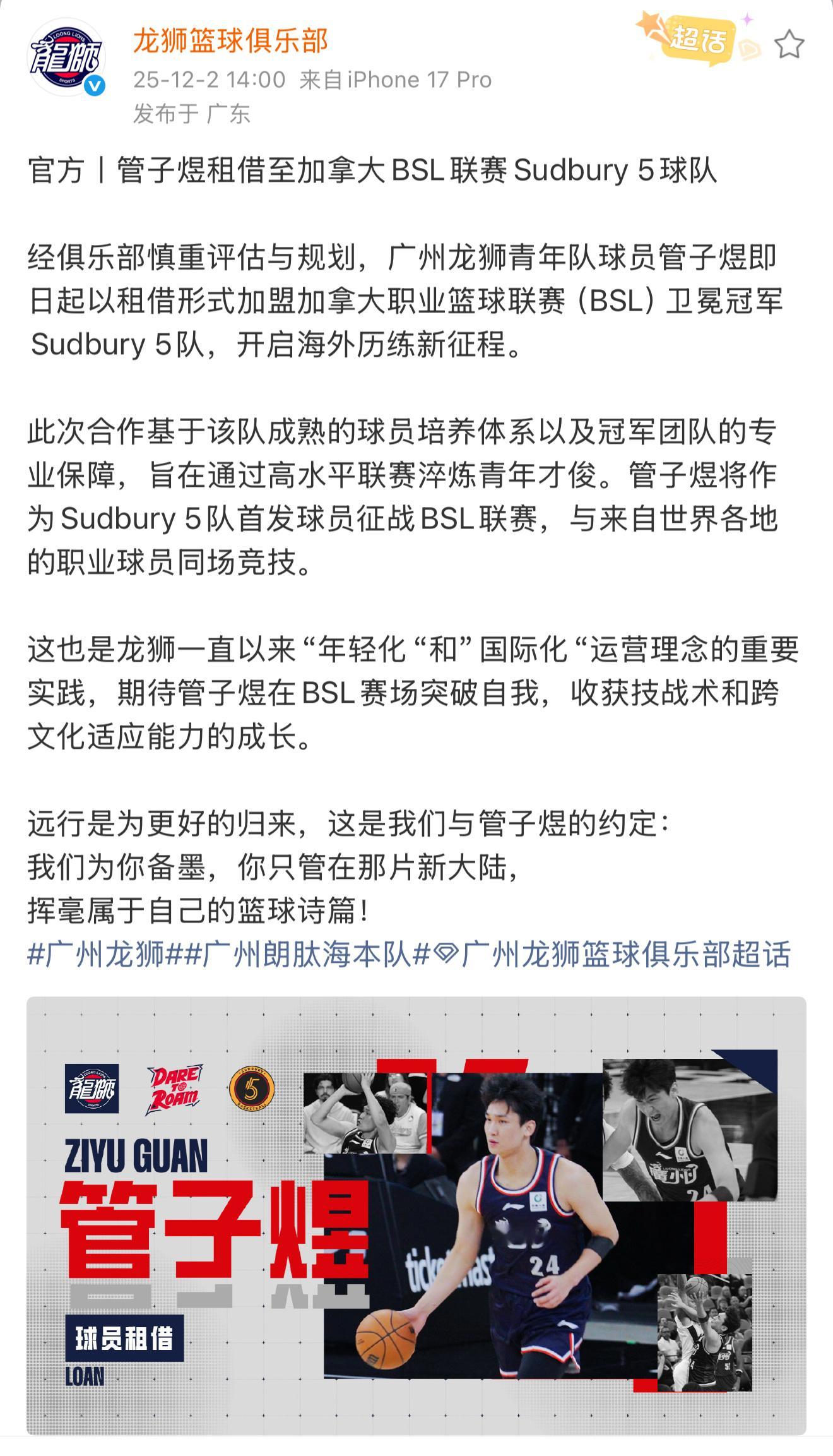 广州龙狮官宣将管子煜外租至海外球队锻炼 cba