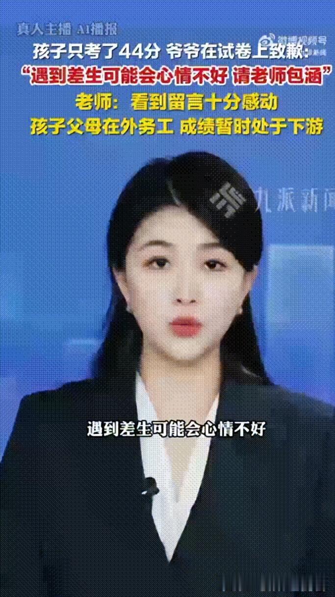 湖北襄阳宜城一个学生语文只考了44分,老师让学生把试卷带回家给家长签字,然后再收回去,谁料老师收回这个学生试卷的时候,在试卷上看到了一句话。 今天要和大家分享一个发生在我们身边的故事。它不是惊天动地的大事,却触动了无数人的心。麻烦各位读者点一下右上角的“关注”,留下您的精彩评论与大家一同探讨,感谢您的强烈支持! 在湖北襄阳宜城的一所乡村小学,一次普通的语文测验后,四年级的老师像往常一样收起学生带回家签字的试卷。 当翻到一张只得了44分的试卷时,老师的目光停住了在试卷角落的家长签字旁,工工整整地写着一行字:“爷爷没文化,爷爷对不起你。” 这句话,是孩子的爷爷用他那双布满老茧的手,一笔一画写下的。 老师轻轻叫来这个叫小杰的孩子,问他这句话是谁写的。孩子小声回答:“是我爷爷。” 孩子接着说,那天爷爷看到分数后,一个人在院子里坐了很久,晚饭也没怎么吃,最后才在试卷上写下了这句话。 这背后的故事,让人心里发酸。 小杰的父母常年在外打工,一年到头只有春节才能回家几天。家里就剩下68岁的爷爷和孙子相依为命。 爷爷小时候只念过几年私塾,认识的字有限,孙子的作业对他来说就像天书。 每次看到成绩不理想,老人除了叹气,真不知道该怎么做。他唯一能做的,就是每天准时在校门口等着,风雨无阻地接孙子回家,然后嘱咐一句:“要好好听老师的话。” 这样的场景,在许多乡村并不陌生。 每到放学时间,学校门口聚集的往往不是年轻的父母,而是一群头发花白的爷爷奶奶。 他们有的手里还拎着刚从地里摘的菜,有的裤脚上沾着泥土,但目光都朝着同一个方向,等待着那个小小的身影出现。 他们或许辅导不了功课,解释不了习题,但他们用自己全部的力量,守护着孩子的衣食住行,守护着这份来之不易的安宁。 那张44分的试卷和那句留言,成了改变的开始。 老师没有责备,而是从此调整了对小杰的关注方式。 每天课前课后,都会多花几分钟时间,给他讲讲基础的字词,听听他的理解。渐渐地,小杰课堂上走神少了,有时还会鼓起勇气举手回答问题。最近一次测验,他的成绩提高到了58分。 虽然还没及格,但这14分的进步,对孩子、对爷爷、对老师来说,都是沉甸甸的希望。 这个故事让我们看到,教育从来不只是分数的较量。 对于千千万万像小杰一样的留守儿童来说,他们缺失的不仅是辅导功课的家长,更是那种随时可以依靠、可以倾诉的陪伴。 祖辈们已经倾尽所有,他们写下的每一个字、等待的每一个黄昏、默默的每一次守护,都是孩子成长路上最朴实也最坚实的支撑。 而那句“爷爷对不起你”,又何尝不是这个时代下,许多隔代抚养家庭的无奈心声?他们拼尽全力托举,却仍感力不从心。这份沉甸甸的爱与愧疚,值得被看见、被理解。 对于老师而言,这张试卷也成了一堂深刻的教育课。 它让人明白,批评与指责往往最简单,但真正的教育,需要的是看见每个孩子背后的故事,给予更多的耐心和引导。 孩子自信的建立、学习动力的点燃,往往就藏在这些细微的理解与鼓励之中。 如今,留守儿童的教育与成长,依然是摆在我们面前的重要课题。如何让这些孩子在缺少父母陪伴的日子里,依然能感受到足够的关爱与支持? 这需要学校的努力,需要社会的关注,也需要我们每个人多一份理解与行动。 你被这个故事打动了吗?你对留守儿童的教育有什么看法? 如果你是家长或老师,你会怎么做? 欢迎在评论区分享你的观点和感受,让我们一起为孩子们的成长出谋划策。