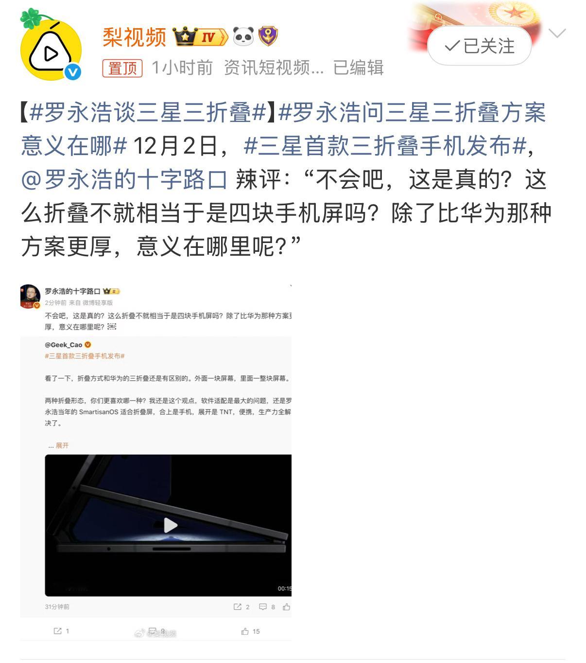 罗永浩谈三星三折叠三折叠本身就是一个秀肌肉大于实用性的产物。存在即合理。