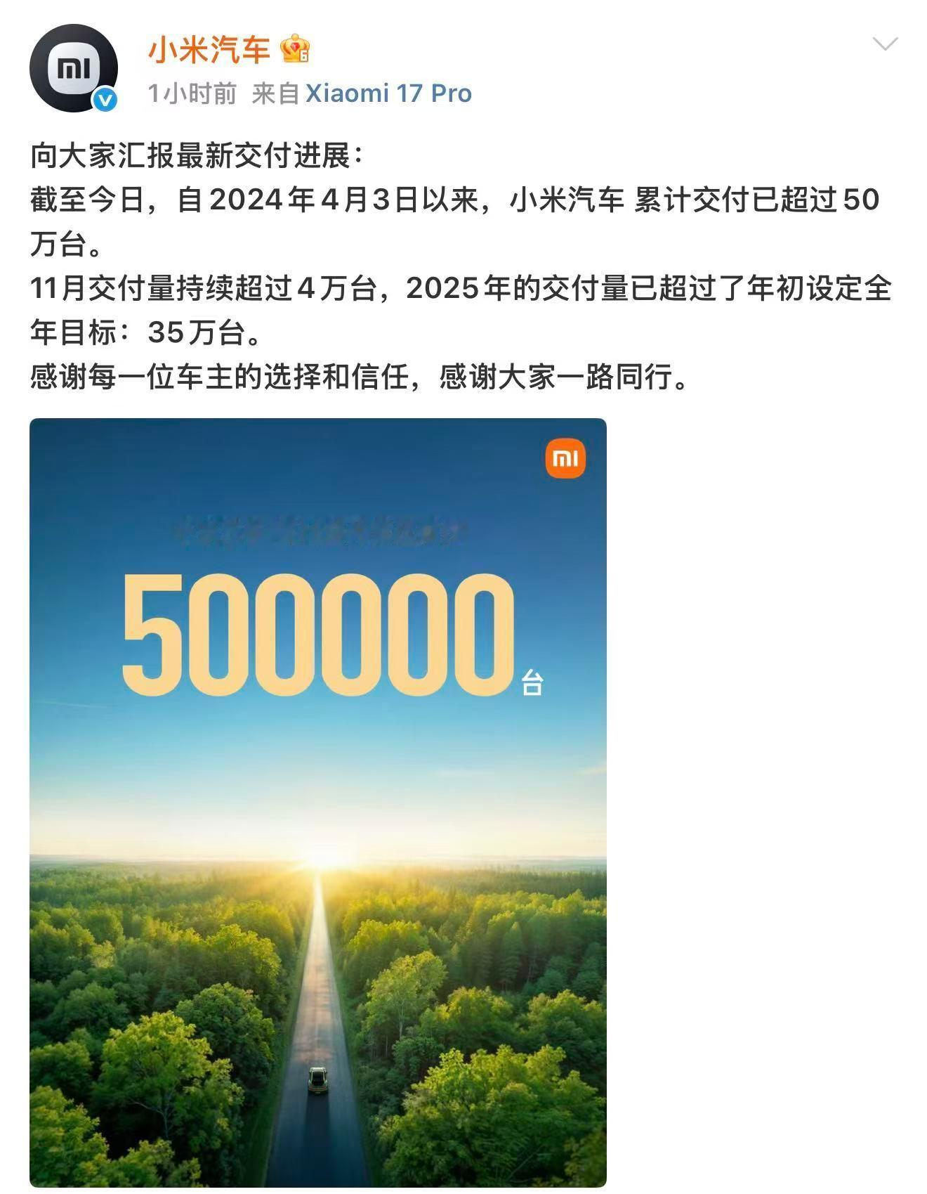 作为小米SU7车主,看到交付量突破50万的消息,小米汽车交付量已超全年目标当初的选择真的很对。身边不少朋友选车时特别理性,反复对比后也选了SU7。不到两年时间,50万车主用行动投票,SU7能成为20万以上轿车销量的冠军,YU7也在10月拿下全品类SUV销冠军,靠的就是产品本身够硬。我们这群车主,最看重的就是这份靠谱。市场认可的速度,真的比想象中还快。这50万份信任,其实更像是社会各领域专业者的一份集体共识。能成为其中一员,非常踏实。