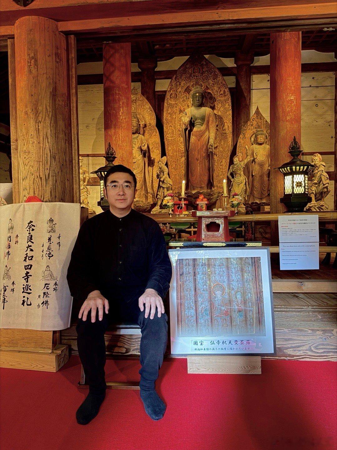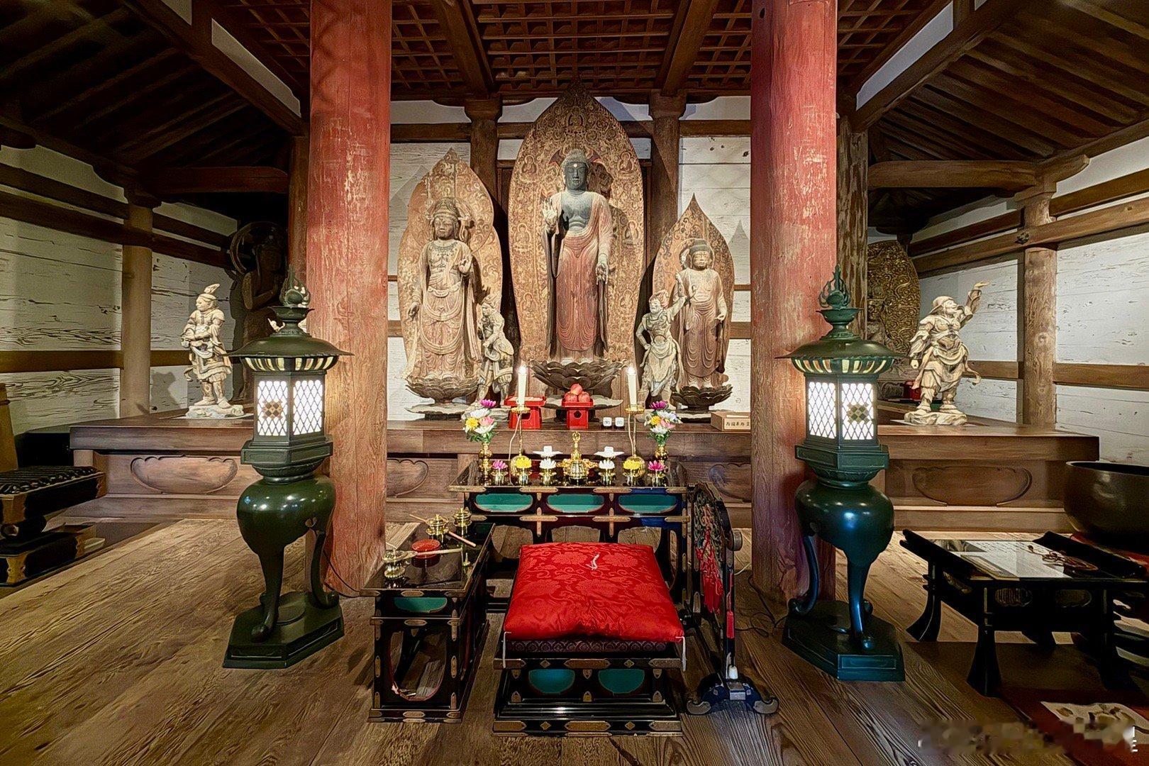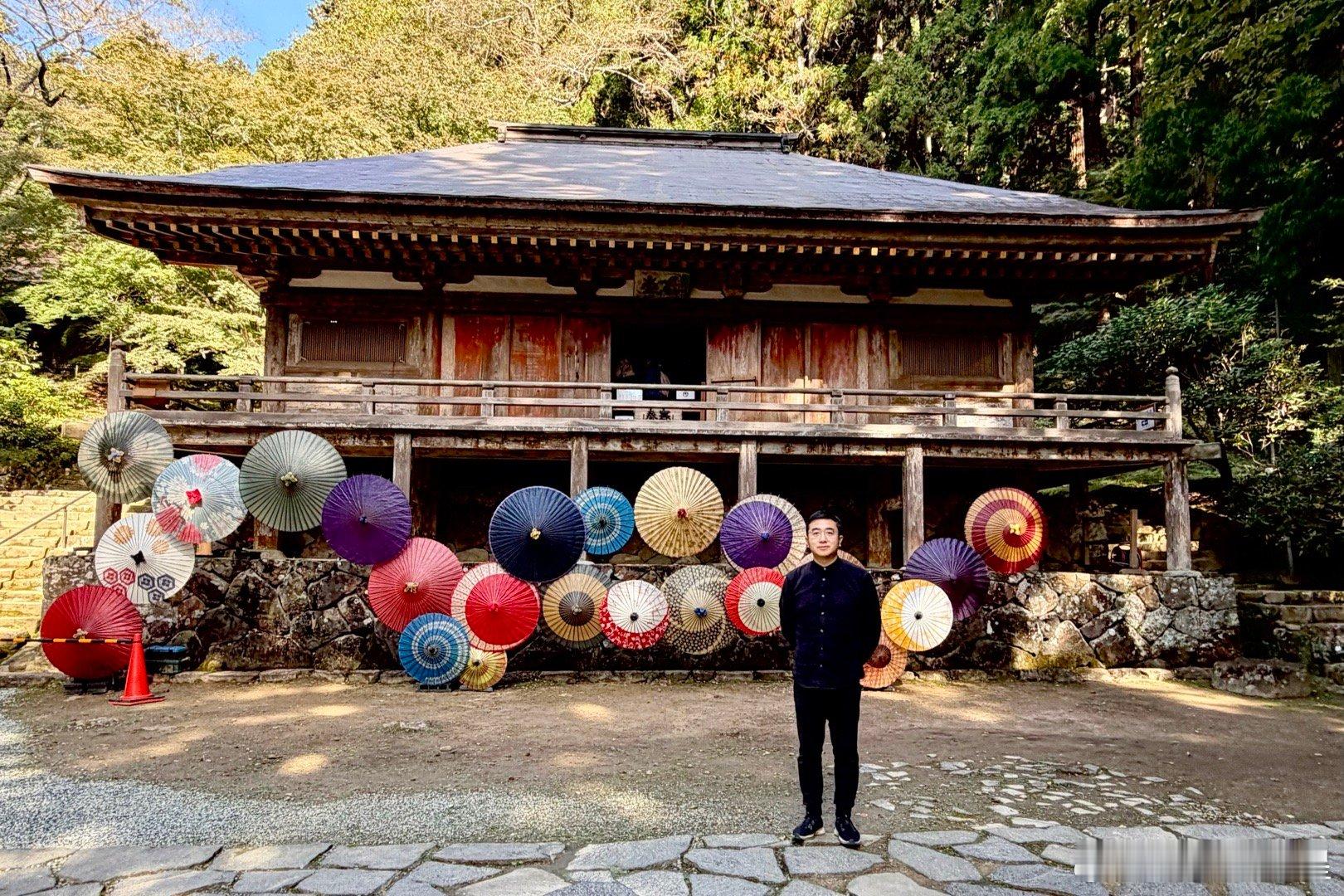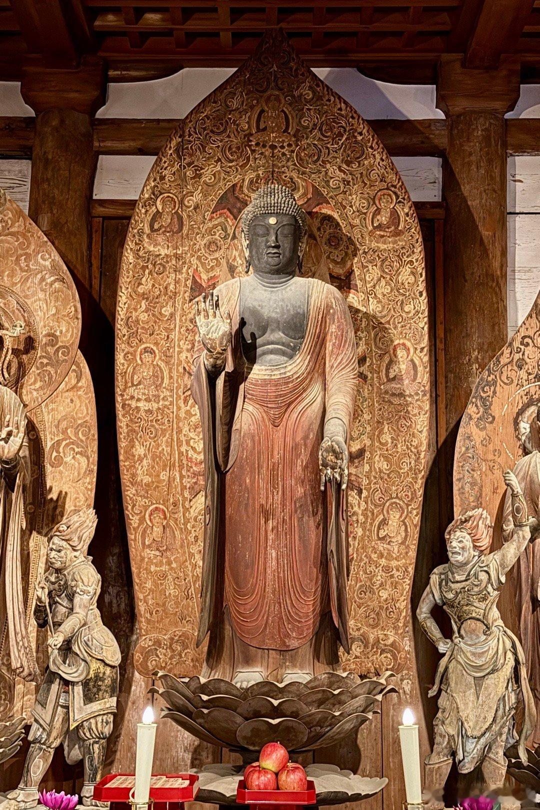 室生寺。在奈良县和山重县交界的地方有座室生山,山中的宀一山室生寺是密宗的山寺。由于火山性地貌特征,室生地区多奇石洞穴,古人认为这里是龙神的栖身之地,因此室生寺也被视为祈雨的神地。室生寺是奈良时代末期的宝龟年间(即770-781年间)由兴福寺的僧侣贤璟所开创,作为避世修行的道场,因此,室生寺有着强烈的远离尘嚣避世的密教色彩。最初的室生寺属于法相宗派系,到了江户时代改为真言宗寺庙。图二是国宝本殿。单层庑殿顶,用薄木板铺顶。面阔5间,进深4间,正殿前方再加一进礼堂作为前檐廊。礼堂部分悬挑于斜坡之上,由长柱支撑于地板下方,称为“悬造”。正殿部分建于平安时代前期(9世纪后期),是日本国内现存唯一平安时代初期的山寺佛堂,但于镰仓时代末期经过大修,许多构件已被更换。礼堂部分则为1672年增建。图3国宝主尊像被称为释迦如来,高2.38米,是由一整棵榧木雕成的、代表平安时代初期的典型造像。其光背绘有七佛药师像,周围的眷属是药师佛十二神将,表明此像原本是作为药师如来像而造立的。佛像后面是日本最难看到的国宝,帝释天曼陀罗,图4能看到一点点。这一堂佛像中还有一尊国宝,就是图8的十一面观音,高1.95米,和本尊一样属于“室生寺样”。宝物亲见,合影留念谢田看宝