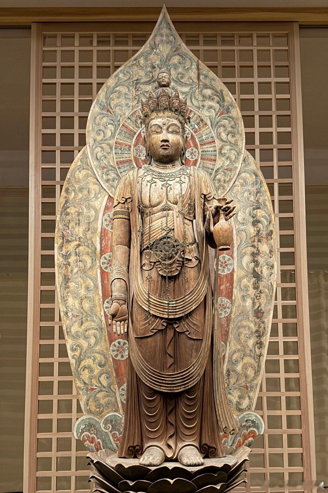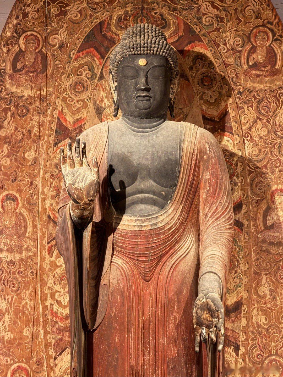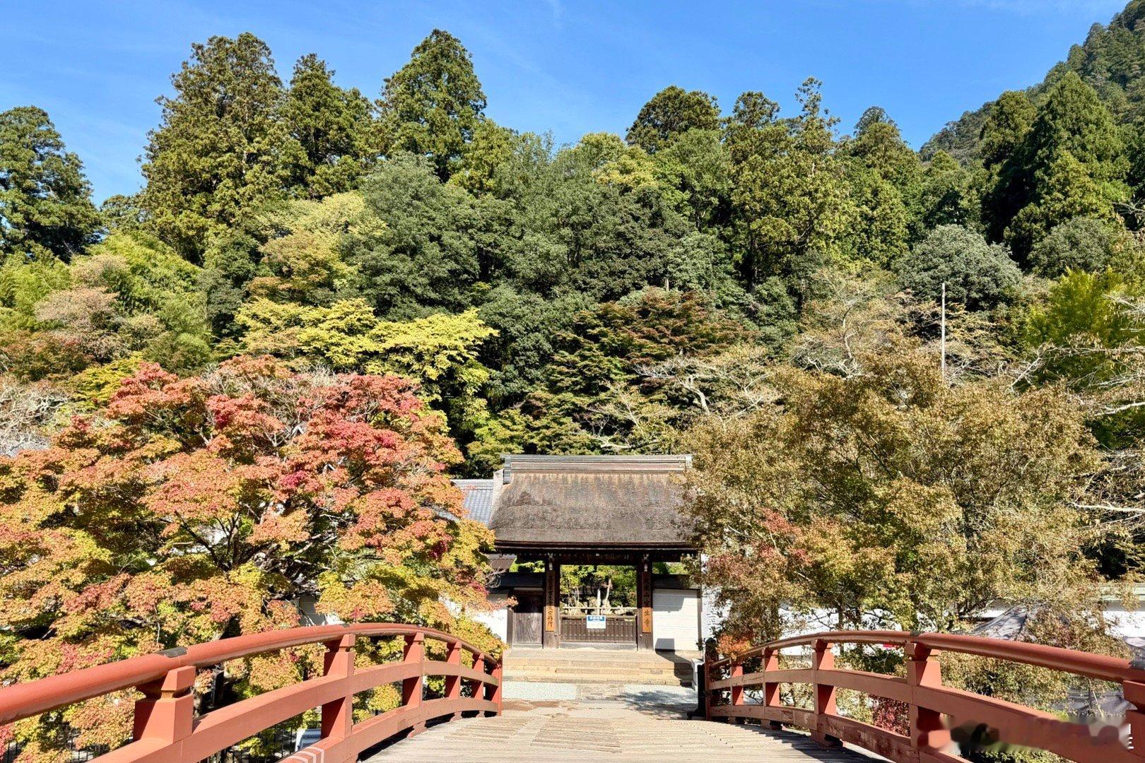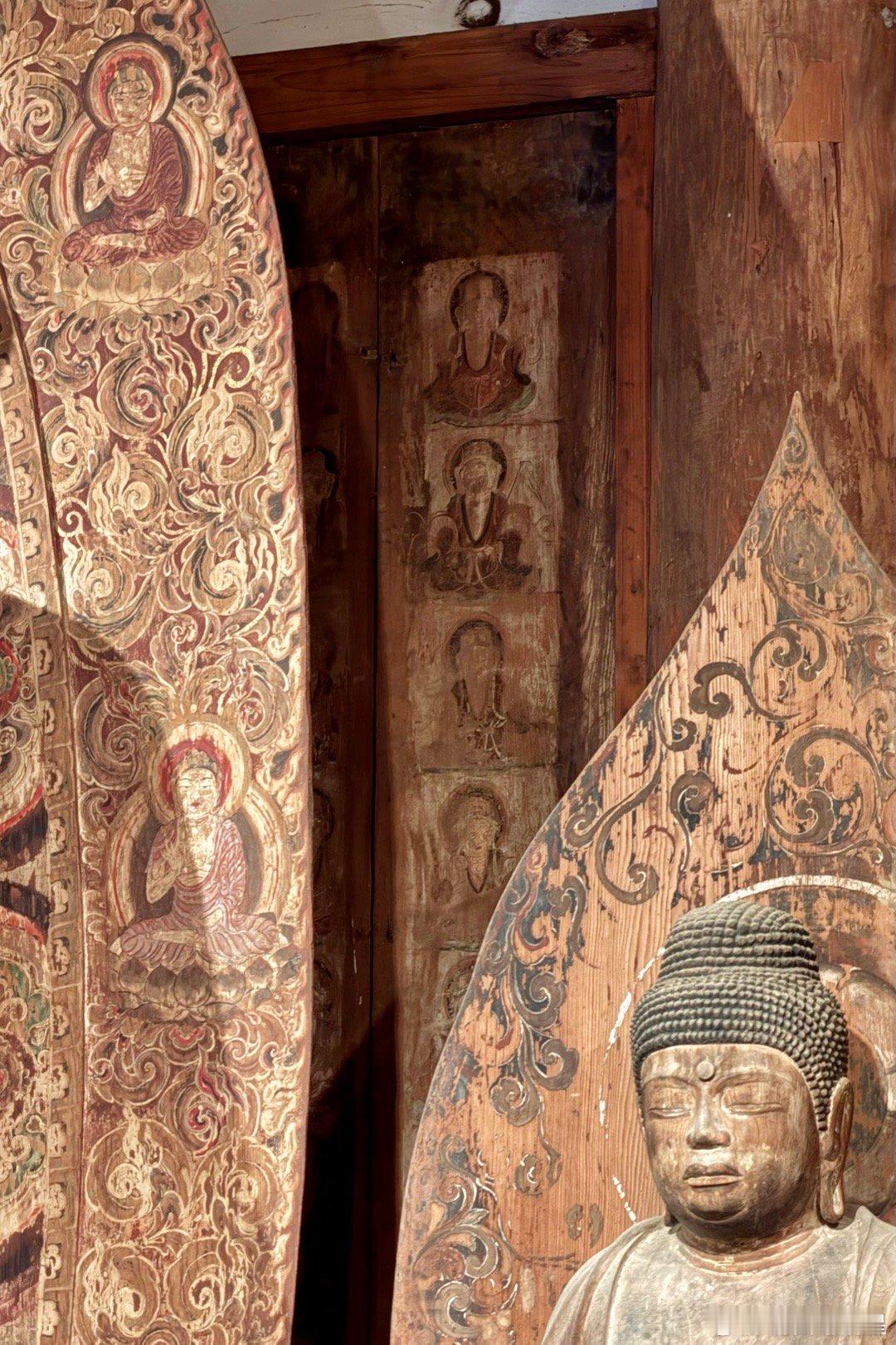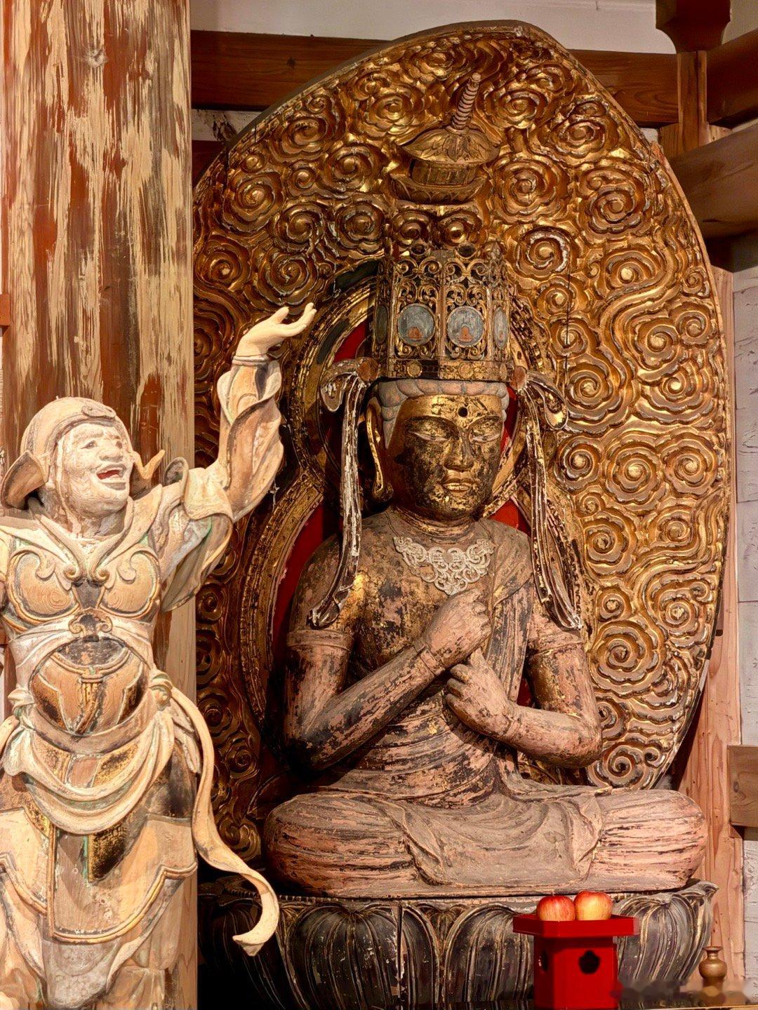 室生寺。在奈良县和山重县交界的地方有座室生山,山中的宀一山室生寺是密宗的山寺。由于火山性地貌特征,室生地区多奇石洞穴,古人认为这里是龙神的栖身之地,因此室生寺也被视为祈雨的神地。室生寺是奈良时代末期的宝龟年间(即770-781年间)由兴福寺的僧侣贤璟所开创,作为避世修行的道场,因此,室生寺有着强烈的远离尘嚣避世的密教色彩。最初的室生寺属于法相宗派系,到了江户时代改为真言宗寺庙。图二是国宝本殿。单层庑殿顶,用薄木板铺顶。面阔5间,进深4间,正殿前方再加一进礼堂作为前檐廊。礼堂部分悬挑于斜坡之上,由长柱支撑于地板下方,称为“悬造”。正殿部分建于平安时代前期(9世纪后期),是日本国内现存唯一平安时代初期的山寺佛堂,但于镰仓时代末期经过大修,许多构件已被更换。礼堂部分则为1672年增建。图3国宝主尊像被称为释迦如来,高2.38米,是由一整棵榧木雕成的、代表平安时代初期的典型造像。其光背绘有七佛药师像,周围的眷属是药师佛十二神将,表明此像原本是作为药师如来像而造立的。佛像后面是日本最难看到的国宝,帝释天曼陀罗,图4能看到一点点。这一堂佛像中还有一尊国宝,就是图8的十一面观音,高1.95米,和本尊一样属于“室生寺样”。宝物亲见,合影留念谢田看宝