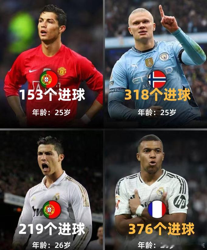 哈兰德和姆巴佩,哪一位最有可能打破C罗的历史进球数?埃尔林·哈兰德和基利安·姆巴佩的进球数都比克里斯蒂亚诺·罗纳尔多在他们这个年龄时多得多。在C罗25岁的时候,他的进球数只有153个,哈兰德的进球总数为318个。在C罗26岁的时候,他的进球数只有219个,而姆巴佩的进球总数为376个。您认为他们能在40岁时达到C罗的948个进球吗?哈兰德姆巴佩