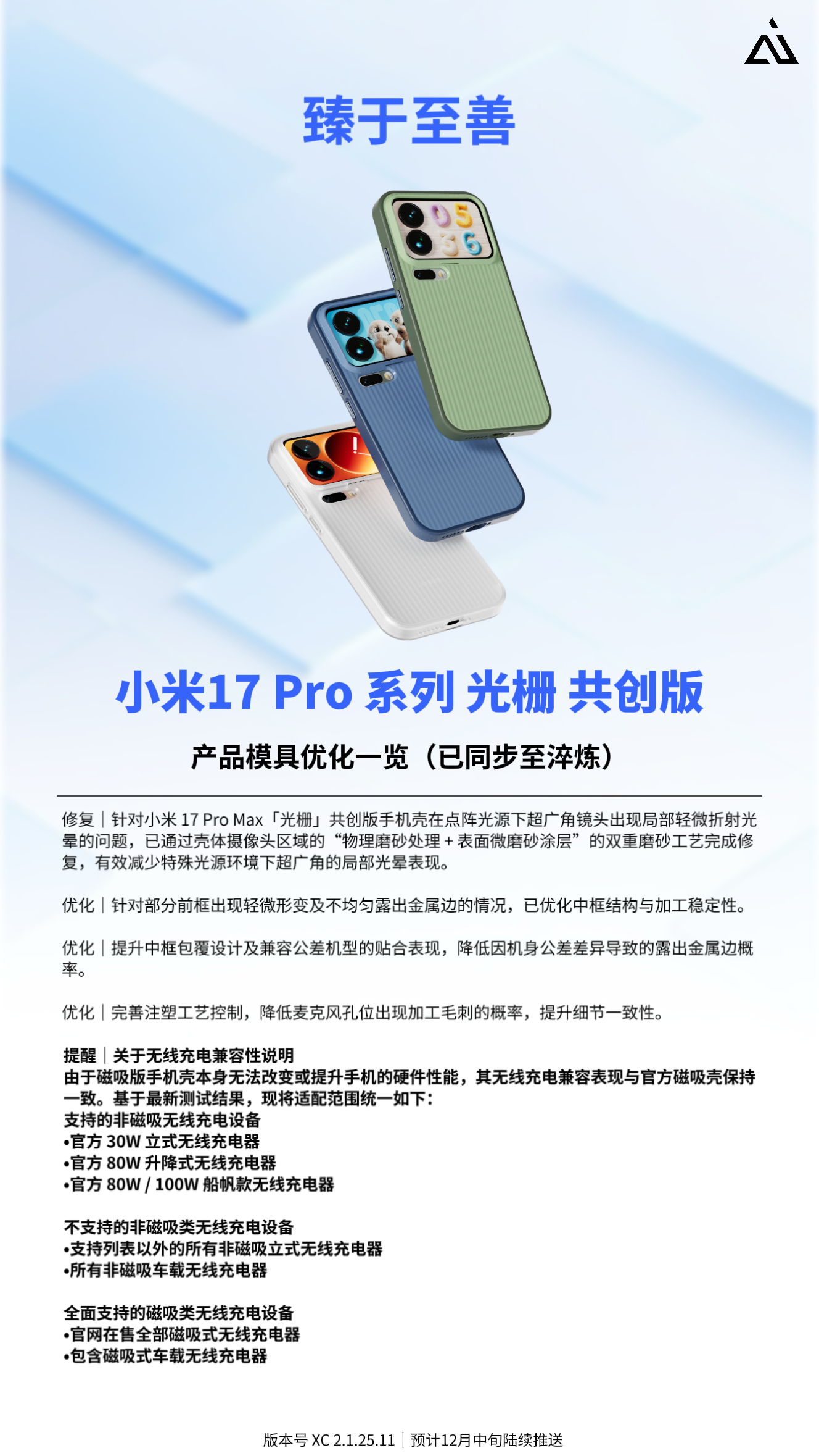 臻于至善小米17 Pro 系列 光栅 共创版|产品模具优化一览(已同步至淬炼)修复|针对小米 17 Pro Max「光栅」共创版手机壳在点阵光源下超广角镜头出现局部轻微折射光晕的问题,已通过壳体摄像头区域的“物理磨砂处理+表面微磨砂涂层”的双重磨砂工艺完成修复,有效减少特殊光源环境下超广角的局部光晕表现。优化|针对部分前框出现轻微形变及不均匀露出金属边的情况,已优化中框结构与加工稳定性。优化|提升中框包覆设计及兼容公差机型的贴合表现,降低因机身公差差异导致的露出金属边概率。优化|完善注塑工艺控制,降低麦克风孔位出现加工毛刺的概率,提升细节一致性。提醒|关于无线充电兼容性说明由于磁吸版手机壳本身无法改变或提升手机的硬件性能,其无线充电兼容表现与官方磁吸壳保持一致。基于最新测试结果,现将适配范围统一如下:支持的非磁吸无线充电设备•官方 30W 立式无线充电器•官方 80W 升降式无线充电器•官方80W /100W 船帆式无线充电器不支持的非磁吸类无线充电设备•支持列表以外的所有非磁吸立式无线充电器•所有非磁吸车载无线充电器全面支持的磁吸类无线充电设备•官网在售全部磁吸式无线充电器•包含磁吸式车载无线充电器预计12月中旬陆续推送届时上架后,将面向首批因概率性工艺差异出现超广角光晕的共创版用户,提供换货服务。