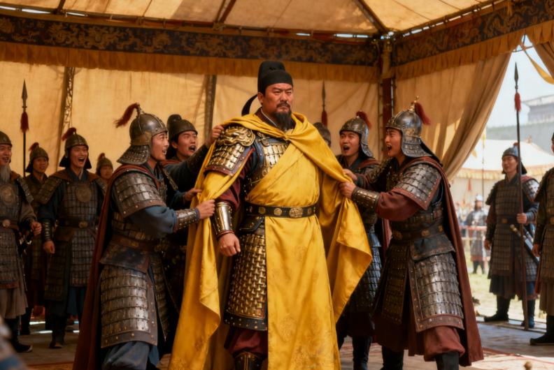 赵匡胤陈桥驿兵变,究竟是将士临时起意,还是赵匡胤蓄谋已久? 公元960年的正月,后周都城开封传来北汉联合契丹南下入侵的急报,执政的符太后匆忙命赵匡胤率军北上御敌。 当大军行至开封东北二十公里的陈桥驿时,一场改变中国历史走向的兵变爆发了。 将士们将黄袍披在醉酒未醒的赵匡胤身上,拥立他为天子,随后回师开封,顺利取代后周建立宋朝。 千百年来,关于这场兵变是临时起意还是蓄谋已久的争论从未停歇,而梳理历史脉络便会发现,这绝非一场偶然的军事哗变,而是赵匡胤精心策划的权力夺取大戏。 兵变的伏笔早在几年前就已埋下。赵匡胤凭借高平之战的战功崭露头角后,不断在军中培植自己的势力。 他一手提拔了石守信、高怀德等一批心腹将领,这些人后来都成为陈桥兵变的核心力量。 更关键的是,赵匡胤担任殿前都点检这一职务,掌控了后周最精锐的禁军,这为兵变提供了坚实的军事基础。 要知道,在古代军队中,将领的忠诚度往往与个人恩义绑定,赵匡胤多年经营的人脉网络,早已让禁军成为他可以信赖的力量。 兵变过程中的诸多细节,更暴露了精心策划的痕迹。 北汉联合契丹入侵的消息,在兵变结束后便销声匿迹,从未有过实际的军事对抗,这很可能是赵匡胤集团为调动军队而编造的借口。 大军行至陈桥驿时,军中就开始流传“主少国疑,点检当为天子”的谣言,这种舆论造势显然是有组织的行动。 当将士们拥立赵匡胤时,他起初假意推辞,甚至强调“你们自贪富贵,立我为天子,能从我命则可,不然,我不能为若主矣”。 这番说辞既保全了自己的名声,又借机确立了对军队的绝对控制权,一套流程行云流水,绝非临时起意所能做到。 兵变后的局势掌控,更印证了事前的周密安排。赵匡胤率军回师开封时,城门早已被他的亲信石守信等人打开,整个入城过程没有遇到任何有效抵抗。 对于后周的宗室和大臣,赵匡胤采取了安抚政策,封周恭帝为郑王,对反对者也只是短暂关押后释放,这种稳定局势的手段,需要提前制定详细的预案。 更重要的是,赵匡胤登基后迅速推行“杯酒释兵权”,解除了开国将领的兵权,这一举措看似是为了巩固统治,实则也可能是为了掩盖兵变的策划痕迹,避免核心机密泄露。 纵观中国历史,权臣通过兵变夺取政权的案例并不少见,但像陈桥兵变这样兵不血刃、井然有序的,却极为罕见。 赵匡胤从掌控军权、制造借口、舆论造势,到最终登基、稳定局势,每一步都环环相扣,逻辑严密。 这场兵变看似是将士们的自发行为,实则是赵匡胤多年苦心经营的必然结果,所谓的“临时起意”,不过是为这场权力交接披上的一层温情面纱罢了。