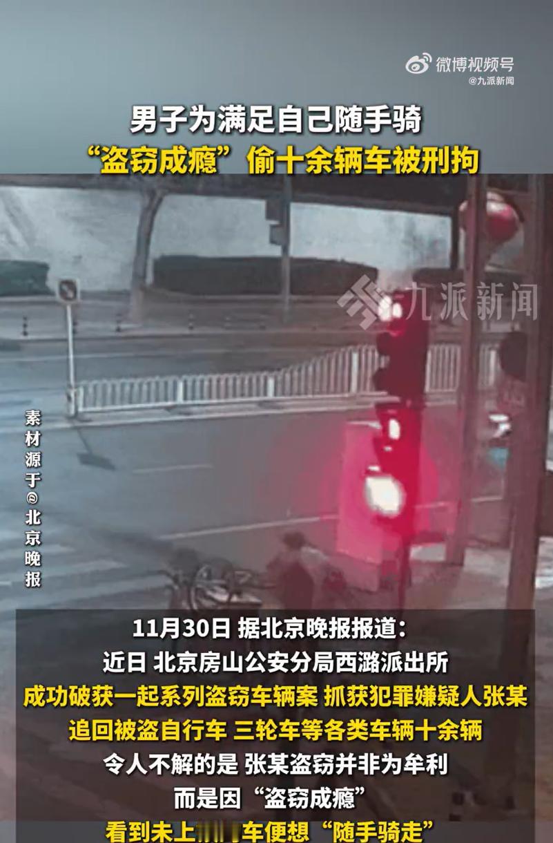 男子想随手骑偷十余辆车被刑拘 11月24日清晨,房山一家五金店店主站在门口跺脚——停在台阶旁的红色三轮车不见了,车斗里还放着昨天刚进的扳手。 西潞派出所民警调取监控时,发现一个穿灰色夹克的身影:凌晨三点,他推着三轮车走了两百米,突然把车往绿化隔离带一扔,转身走进了地铁站。 这个身影叫张某,今年26岁,大专毕业证揣在兜里四个月了。 8月坐火车来北京时,他拖着半人高的行李箱,想着“凭学历总能找份正经工作”。 现实却给了他一记闷棍:投出的37份简历,要么石沉大海,要么面试时被一句“我们要本科”挡回来。 积蓄在交完两个月房租后见了底,11月的北京开始降温,他攥着皱巴巴的矿泉水瓶蹲在路边,盯着招聘启事上“本科以上”的字样发呆。 捡废品成了他的日常,每天走两万步,换来的钱只够买两个馒头和一瓶矿泉水。 转折点发生在11月初的一个雨夜。 路过小区车棚时,他看见一辆蓝色自行车没上锁,车座还套着防雨罩。 “就骑一次,明天还回来。”他这样告诉自己,跨上去的瞬间,车轮碾过积水溅起的水花,竟让他觉得“久违的轻松”。 那次之后,他像发现了新大陆。 超市门口没锁的共享单车,菜市场旁随意停放的电动三轮车,甚至小区楼下的儿童平衡车——只要没上锁,他都想“借来”骑骑。 骑到半路觉得麻烦了,就随手丢在路边:公交站长椅旁,地铁口栏杆边,甚至垃圾桶旁边。 “没想偷,就是想骑的时候有车骑。”面对民警讯问,张某低着头,手指抠着夹克袖口的破洞。 有人或许会问,为何不联系家人? 他手机通讯录里存着父母的号码,却三个月没敢拨号——怕听见那头的叹息。 口袋里最后一张10元纸币花完那天,他盯着超市玻璃倒影里的自己,突然觉得“偷辆车骑”和“捡个瓶子”没什么不同。 那些被他随手丢弃在街角的自行车——车筐里还留着前主人没喝完的豆浆,车把上缠着褪色的丝巾——成了城市里沉默的线索。 民警顺着这些线索追查时,发现他两个月内偷了至少12辆车,从儿童车到货运三轮车,品类齐全。 “有的车刚骑过一个路口,他嫌碍事就扔了。”办案民警无奈地说,追回的车辆里,有辆白色自行车车胎还是瘪的,显然被丢弃时没气了。 现在,这些车停在派出所院子里,车座上还留着不同程度的磨损,像主人各自的生活痕迹。 张某因涉嫌盗窃罪被刑拘的那天,北京刮起了大风。 他戴着手铐被带出派出所时,脚边还落着半瓶没喝完的矿泉水,瓶身上的标签被风吹得哗啦作响。 失主们陆续来领车,五金店店主摸着失而复得的三轮车车斗,嘟囔了一句:“这小伙子,看着不像坏人啊。” 或许,在生存的窄缝里,有些人的底线会被一点点磨掉——从想找份工作,到想有辆车骑,再到“随手”拿走不属于自己的东西。 而那些被丢弃的车,像一个个问号,悬在城市的上空。