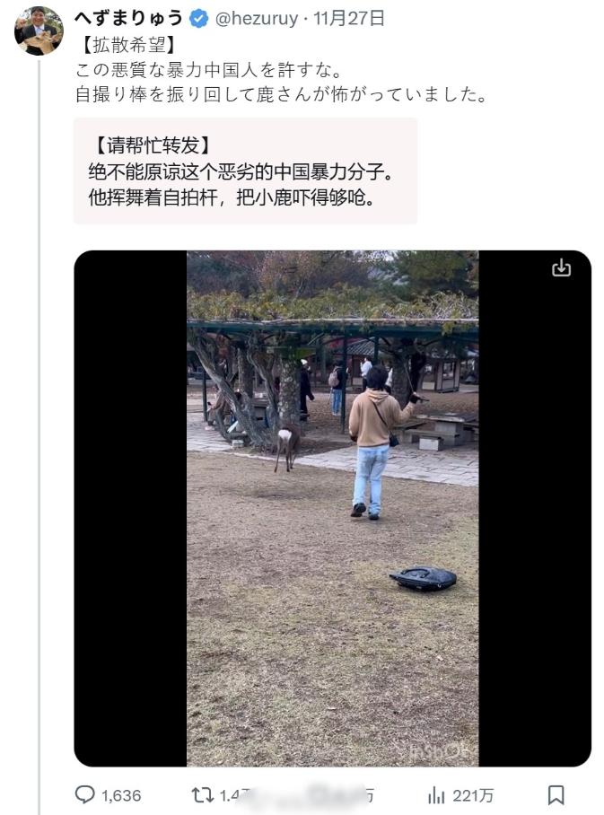 日本现在改变策略了,为对付中国,他们开始剑走偏锋了。11月29日,根据日本《朝日新闻》报道,东京警察厅抓捕了两个中国人,理由是涉嫌操纵股市。日本媒体的新闻标题是:东京警视厅逮捕了两名涉嫌操纵股市的“中国人”。 在这起案件里,标题里“中国人”三个字被特意突出,仿佛这才是案件的核心标签。 可鲜有人提及的是,这类证券账户被盗用的非法交易案在日本早已成灾,相关案件不是少数,其中绝大多数案件的涉案人员都是日本人。 偏偏这起案子,日本媒体集体对可能存在的日本同伙视而不见,一门心思把焦点锁在“中国人”身上,这种刻意的选择性报道,早已不是第一次上演。 最典型的莫过于奈良“护鹿”闹剧。 去年7月起,奈良市议员原田将大就带着团队在公园蹲守,只要镜头里出现中国游客。 哪怕是正常喂鹿、不小心碰到鹿角,都会被他剪辑成“暴力虐鹿”的视频,配上“中国人行为恶劣”的解说发上网。 他靠这套虚假素材涨粉造势,甚至以8320的票数成功当选奈良市议员。 更荒诞的是,日本自民党还把这出戏搬上全国选举辩论台,播放的所谓“证据”不是2023年已被证实是日本人踢鹿的旧视频,就是原田的摆拍作品。 可奈良县厅查遍所有记录,压根没收到过一起“外国游客虐鹿”的正式投诉,反倒是2024年有日本人用斧头砍鹿的案件记录在案。 从网红到政客,都把“抹黑中国人”当成流量密码和政治筹码,这套操作已经形成了完整的利益链条。 如果说舆论抹黑还只是口头上的冒犯,如今这种操作已实实在在转化为针对中国人的暴力伤害,在日本街头掀起一股危险的暗流。 中国驻日大使馆11月27日紧急发声,明确提醒在日中国公民注意安全。 因为从7月开始,华人被歧视、辱骂甚至殴打的求助案件就持续增加,11月更是集中爆发。 这些暴力事件从不是平白出现的,一件件的背后,离不开日本舆论和政客的长期煽动。 当媒体反复把“中国人”和“犯罪”“麻烦”捆绑报道,当政客为了选票公然渲染“中国威胁”,极端情绪自然会在民间蔓延。 就像东京股市操纵案,日本媒体绝口不提本国泛滥的金融犯罪问题,只盯着“中国人”大做文章,本质上是把中国当成了转移国内矛盾的替罪羊。 中国在经济、科技等领域的反制让日本束手无策,拿不出像样的应对手段,就只能抠着“中国人”这个标签搞小动作,用这种上不了台面的方式寻求心理平衡。 更讽刺的是,日本社会曾有过“集体辟谣”的清醒时刻。 今年9月有人炒作“中国游客虐鹿”时,奈良县厅、日本学者和网友集体发声,拿出“三年零举报”的证据戳破谎言。 因为他们清楚,极端排华情绪一旦转化为政策,会重创依赖中国游客的旅游业和双边贸易,最终损害普通人的利益。 可这种清醒终究抵不过政治操弄的诱惑,政客需要话题,媒体需要流量,倒霉的却是在日无辜华人。 当暴力袭击得不到严惩,日本所谓的“文明社会”面具,正在被自己亲手撕碎。 而那些被当作棋子的普通中国人,却成了这场危险游戏中最直接的受害者。