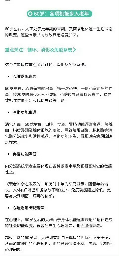 【#人在3个年龄会明显变老# 】#断崖式衰老一般发生在几岁# 总有那么一瞬间,我们会觉得自己“一下子变老了”。医学研究发现,衰老虽然持续进行,但并非匀速发展,这3个年龄段易断崖式衰老⬇️ (生命时报)