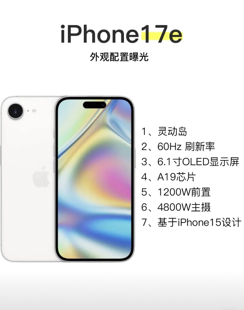 iPhone17e将是最强版廉价iPhone iPhone17e外观配置爆光 这次基于iPhone15的设计,6.1寸灵动岛屏。 还升级了处理器和电池续航,对于拍照要求不高的宝子们,简直是性价比拉满满 预计在明年3月份上市 (以上数据整理自机友)