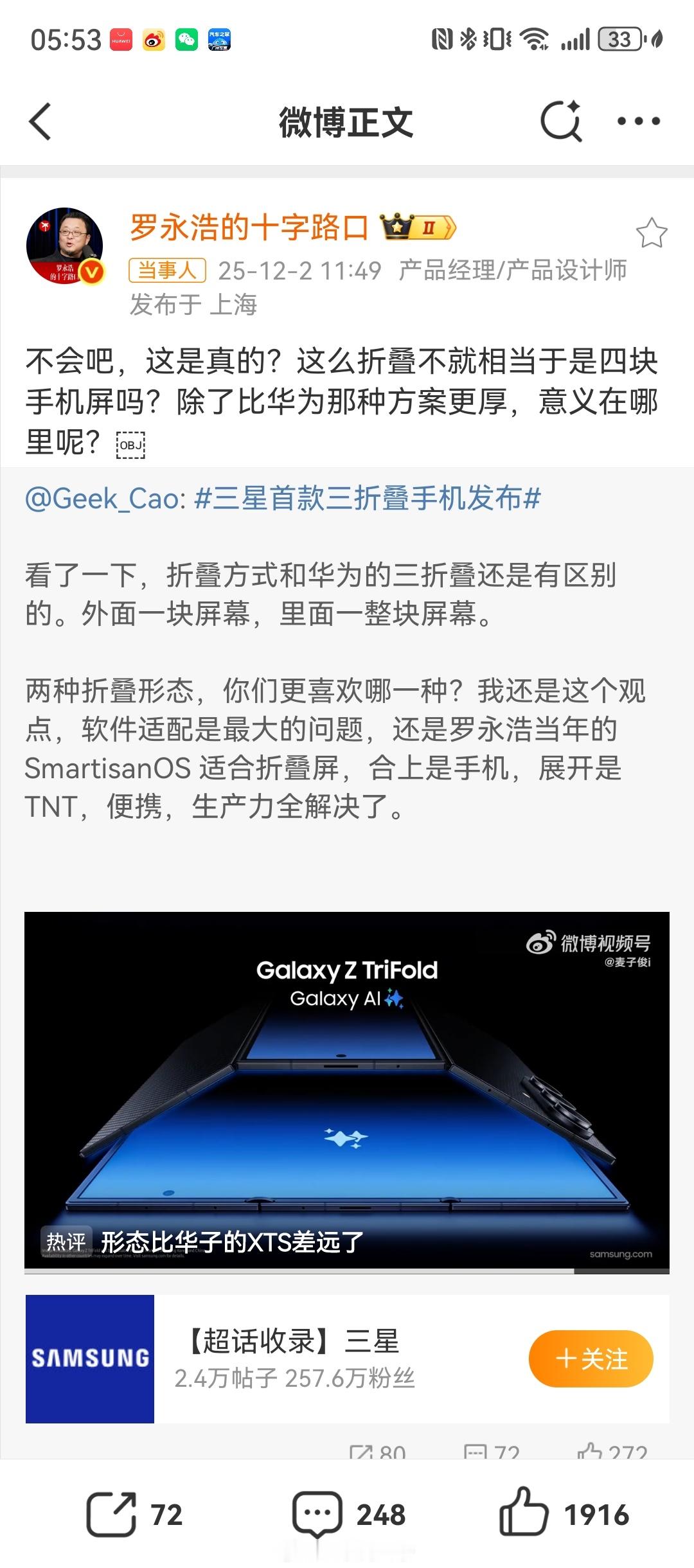 三星首款三折叠手机发布抄了个四不像,这块背屏放中间,那岂不是用不了双屏模式……