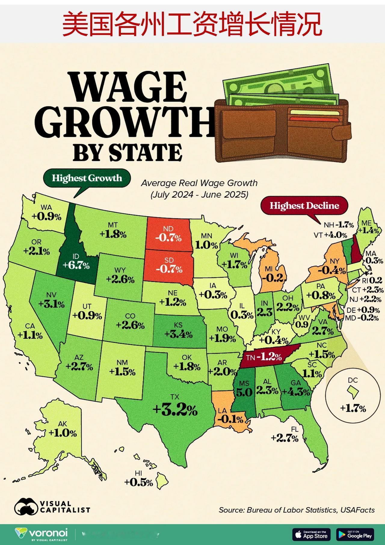 图说美国各州工资增长情况(2024 - 2025 年),哪些州工资增长,哪些州工资呈负增长? 美国的实际工资增长情况已成为美国人关注的焦点,因为通货膨胀和新的关税政策持续削弱了美国人的购买力。 在全美范围内,从 2024 年 7 月至 2025 年 6 月,名义平均工资从每周 1200 美元上涨至 1250 美元,增加了 50 美元,即增长了 4.2%。经通货膨胀调整后,实际工资增长了 2.5%,使工人的每周购买力增加了约 30 美元。 这张地图清晰地展示了美国各州在截至 2025 年 6 月的 12 个月期间的工资增长情况,显示了哪些地区工人的购买力有所提升,哪些地区则仍处于落后状态。该图表的数据来源于 USAFacts。 ——各州工资增长情况 爱达荷州和密西西比州位居全美之首,其实际工资分别上涨了 6.7% 和 5.0%。这两个州都经历了人口大量流入和劳动力市场紧张的局面,从而导致了工资上涨压力增大。 其他表现优异的州,如佐治亚州、佛蒙特州和堪萨斯州,其增长率也超过了 3%。 ——大部分地区实现了适度但积极的增长 大部分州的实际工资都有所增长,增幅在 1% 至 3% 之间。这一群体包括像得克萨斯州、佛罗里达州、弗吉尼亚州和科罗拉多州这样的主要人口聚集地。 稳定的就业增长以及通胀的缓和使得这些地区的工资水平超过了消费价格水平。 ——工资增长落后的州 有八个州的实际工资出现了负增长,这意味着通货膨胀的速度超过了工资的增长速度。新罕布什尔州、田纳西州以及北达科他州的降幅最大,这反映出当地劳动力市场状况较为疲软。 纽约和密歇根州的经济数据也出现了小幅下滑,这表明持续的经济转型正在对收益造成影响。这些局部的下滑情况与全美整体向好的趋势形成了鲜明对比。