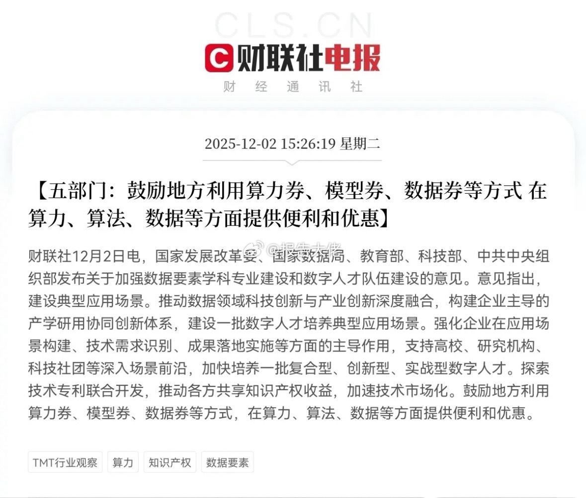 盘后大利好!五部门突发大利好消息了预计明日算力板块又要火力全开了,今日割肉算力概念的,此刻估计又要拍大腿了下午3点26分,国家发改委等五部门发布了关于加强数据要素学科专业建设和数字人才队伍建设意见,其中强调鼓励地方利用算力券、模型券、数据券等方式在算力、算法、数据等方面提供便利和优惠,此消息出来后,股民们又议论开了,认为五部门发布的太及时了,难怪尾盘算力算力硬件股异动了,菲菱科思尾盘拉升涨停,这个消息对于算力板块显然是重大利好,算力是数据要素建设中最重要的基础设施,是支撑人工智能发展、驱动经济增长和赋能千行百业的核心引擎,只有加速算力的发展,才能取得人工智能的突破,意义重大,算力即国力,未来的发展空间巨大股民们,坐稳扶好,受此利好消息影响,明日算力板块有望继续大爆发,满仓算力概念的,明日有大鸡腿吃了!