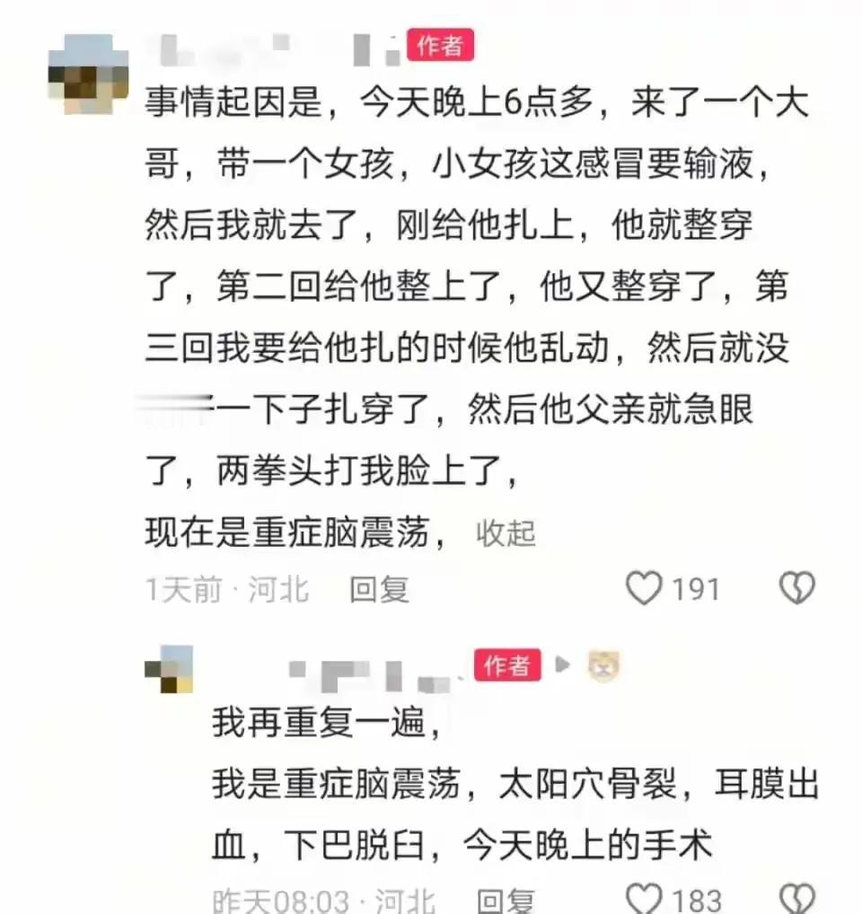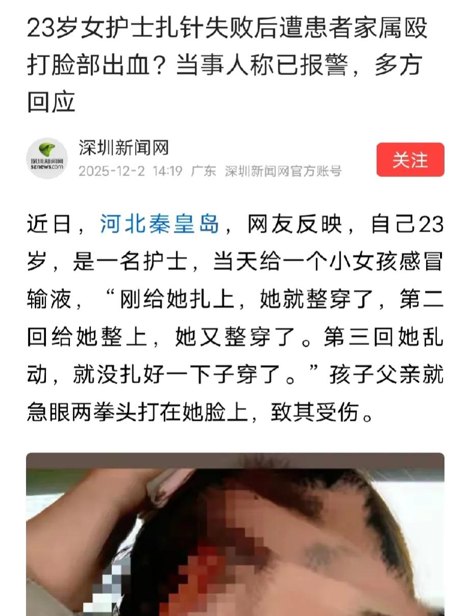 河北秦皇岛,女子是护士,给一女孩输液时,刚扎上针没几秒,孩子乱动,针穿了,女子再次给她扎针,谁料,刚扎进去,孩子还是乱动再次穿了,第三次扎针前,女子提醒孩子父亲看好孩子,并安抚女孩别乱动,没想到,第三次还没扎进去,因为孩子乱动再次扎穿。孩子父亲暴跳如雷,冲动下,两拳挥到女子脸上,导致她重度脑震荡,太阳穴骨裂,耳膜出血,下巴还脱臼了。网友:坚决不和解。 一女子在网上发文称,她今年23岁,是某儿科医院的护士,11月30号晚上,她在给孩子输液时,因为孩子乱动扎针的时候整穿了,孩子父亲冲动之下打了她。 事后,女子就医,经医生诊断,她重度脑震荡,太阳穴骨裂,耳膜出血,下巴还脱臼了。 据悉,女子刚生完孩子不久,她的宝宝才一个多月大,但是因为最近流感高发期,医院接了不少病患。 女子为了缓解病患的就诊压力,主动提出提前回来上班,可她才回来没多久就被打伤住院了。 11月30号那天下午,大概6点多,一名男子带着一个小女孩来输液,男子又高又壮,应该是女孩的父亲。 女子看到他们过来后,就主动走过去,要给女孩输液。 女孩看到护士过去后,显得很紧张,一直躲到她父亲身后。 女子轻轻安抚女孩,不用害怕,我们要做一个勇敢的小朋友。 女孩听了非但没有安静下来,反而是边哭边喊,不要、我不要打针,爸爸我要回家。 男子安慰女儿,打针后病毒就死了,病就好啦,要不感冒会加重哦,爸爸抱着你,你把眼睛闭上就不疼了,好吗? 在男子的安慰下,女孩终于安静、顺从了一些,虽然还是很害怕,但是她没那么闹人了。 女子看女孩安静了,就拿出输液需要用的东西,做好准备。 之后,女子轻轻拉着女孩的手给她消毒,准备扎针,女孩一看,又开始害怕了,她不停地乱动,显得有些抗拒。 女子安慰女孩,很快就好了,闭上眼睛,几秒钟就完成了。 女孩听着女子的话乖乖闭上眼睛,谁料,女子刚给她扎上针,因为女孩乱动,针给扎穿了。 女子只好轻轻拔出针头,准备第二次扎针,女孩一看更加害怕了,她动来动去,腿还一蹬一蹬的,这一次她不再相信不疼这说法了。 男子一看女儿那么闹腾,主动抱紧她,女子也配合地摁住女孩。 可让她没想到的是,第二次扎针,好不容易扎上,又因为女孩乱动再次整穿了。 女孩吓得大哭,嘴里一直喊疼,男子一看也很着急,可他又不知道该怎么办。 女子觉得孩子这么动来动去的,很难打上针,决定这一次要把孩子摁牢了,她提醒男子要看好孩子,别让她乱动。 两人好不容易把孩子摁好,试图不让她乱动,没想到,女子刚扎进去,还没找到血管,孩子又动起来了,这一次她动得更厉害,导致还没扎上,就扎穿了。 孩子吓得哇哇大哭,这一次男子不淡定了,他觉得女子要么就是故意的,要么就是她没经验,冲动之下,他站起来直接两拳挥到女子脸上。 女子还没反应过来,就被打得两眼冒金星,她捂着脸,疼得差点晕过去,最后还是有人拉开劝架了,男子才停手。 之后,有人报了警,男子被警方带走。 而女子在同事的协助下去看医生,经过检查,查出她严重脑震荡,太阳穴骨裂,耳膜出血,下巴还脱臼了。 有人说,孩子父亲心疼女儿哭闹的心情可理解,但因情绪失控挥拳伤人,导致护士重度脑震荡、骨裂等重伤,完全突破情理底线,坚决不和解。 护士履职尽责却遭暴力对待,既违背职业尊重的公序良俗,也辜负其产后返岗的担当。 父亲以bao力宣泄不满,不仅无法解决问题,更给他人造成严重身心伤害,于情于理都应被谴责,网友“坚决不和解”的呼声,本质是对暴力行为的抵制和对从业者的共情。 那么,从法律角度,如何看待这件事呢? 《刑法》第234条规定,故意伤害他人身体的,处三年以下有期徒刑、拘役或者管制;致人重伤的,处三年以上十年以下有期徒刑。 本案中,孩子父亲因三次扎针未成功,主观上明知挥拳打人会伤害护士身体,仍故意实施殴打行为,造成护士重度脑震荡、太阳穴骨裂、耳膜出血等重伤后果。 他的行为完全符合故意伤害罪的构成要件,并非简单的情绪失控,应当以故意伤害罪追究其刑事责任,且需在三年以上十年以下有期徒刑幅度内量刑。 另外,结合《关于依法惩处涉医违法犯罪维护正常医疗秩序的意见》相关规定,在医疗机构内故意伤害医务人员造成轻伤以上严重后果的,应依照刑法有关规定定罪处罚。 这个事件发生在儿科医院这一医疗机构内,护士是履职的医务人员,其提前产后返岗支援流感救治,无任何过错。 孩子父亲的bao力行为不仅伤害个人,还破坏了正常医疗秩序,属于典型的涉医违法犯罪,依法应从严惩处,不能以“心疼孩子”为由减轻责任,这也与网友“坚决不和解”的呼声背后的法律精神相符。 最后,心疼孩子没问题,但不能拿暴力解决事儿!护士产后还主动上班救急,没半点错,被打成这样也太冤了,这父亲必须为自己的冲动买单。 大家认为呢? 关注@猫眼学法 品读案例故事,学习法律经验。