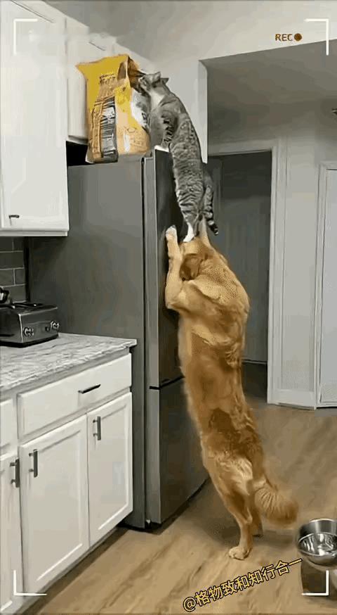 笑不活了!这对“猫狗盗窃团伙”也太会整活了吧!主人家猫粮消耗神速,原来竟是金毛和猫咪联手作案——金毛当“人肉支架”头顶猫咪,毛茸茸的小猫咪化身“偷粮小贼”,趁主人不注意偷偷伸爪够猫粮,那鬼鬼祟祟的模样,像极了在说“快拿快拿,主人没发现!” 被逮个正着时,俩小家伙还一脸无辜装可怜,谁能想到大金毛竟是为了贪嘴猫粮,才想出这“不择手段”的办法!明明有专属狗粮,却偏被猫粮香味勾得神魂颠倒,这跨物种的“吃货联盟”,也太可爱了~