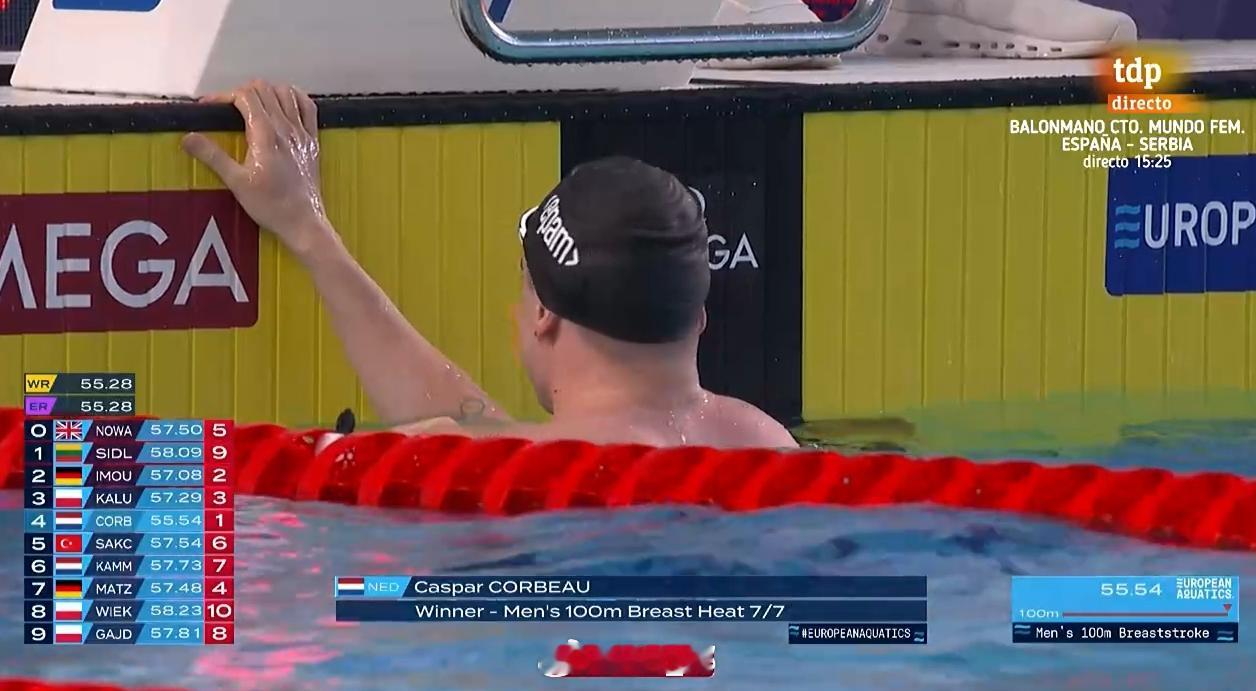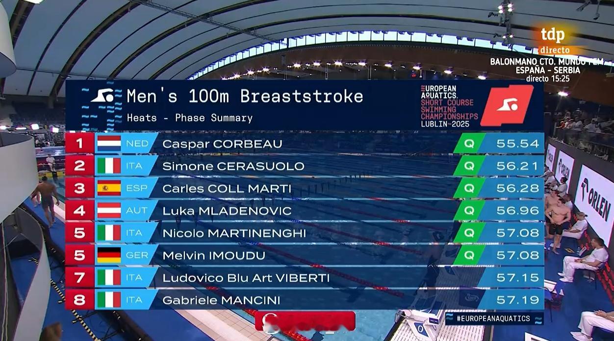 欧洲短池游泳锦标赛 男100蛙预赛 Corbeau 55.54 PB预赛就巨猛!