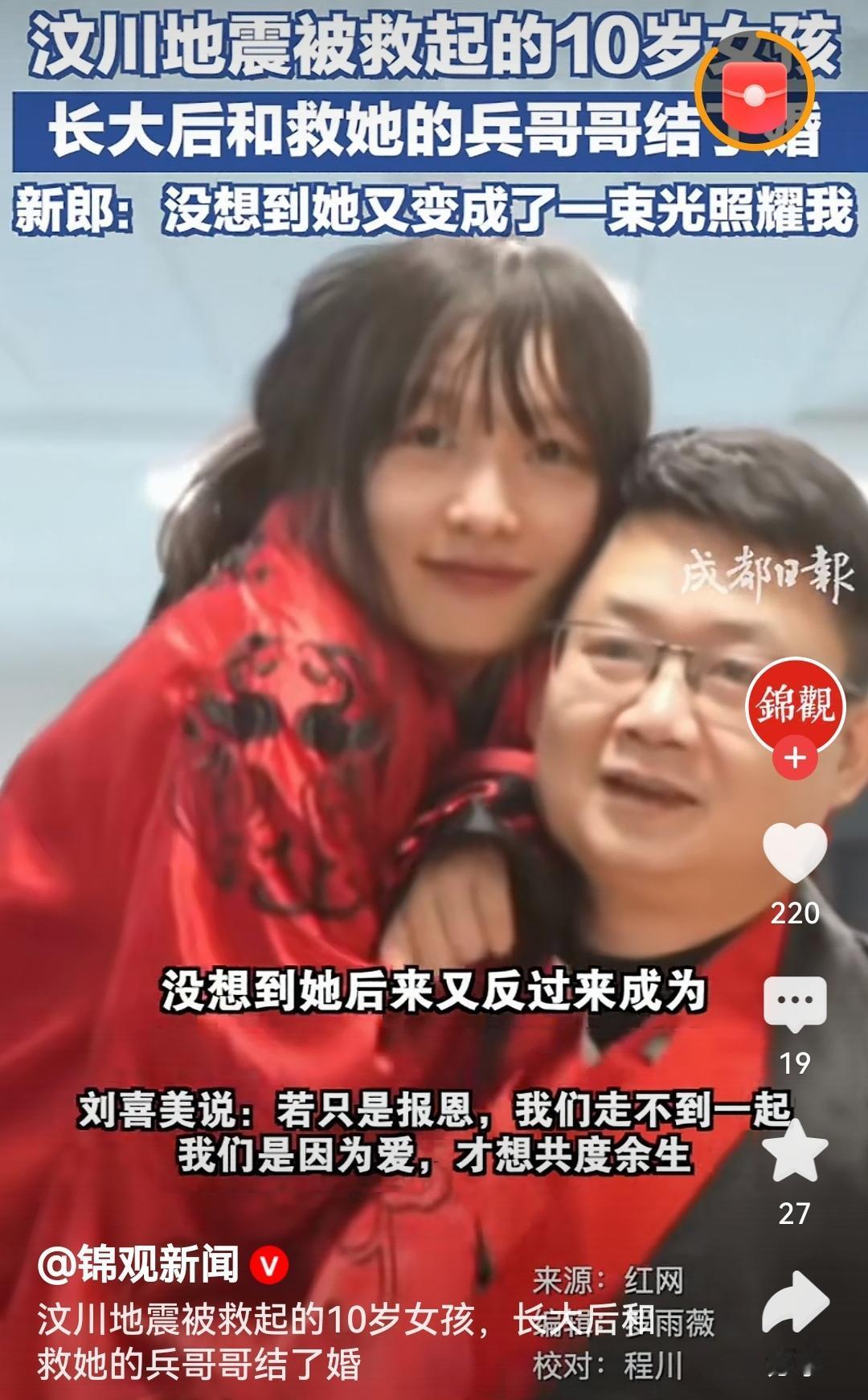 汶川地震被救女孩与施救军人结婚从地震里的生死救援,到12年后的汉服婚礼——这是灾难里开出的爱之花!被救的光长成了光,双向奔赴的缘分太戳心,愿这份善意与深情,岁岁皆安![心][心][心] 汶川地震新娘 评论打卡任务
