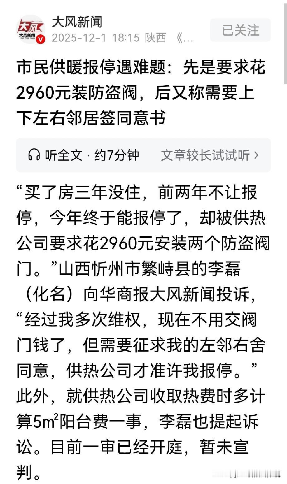 山西忻州,男子新房未入住,却白白交了2年后取暖费,今年终于可以报停,供热公司却要求安装两个指定阀门,收费2960元,后经协商,不收阀门费了,却要求所有邻居签字同意,男子停止供暖后,如导致邻居室内温度下降,邻居不予追究,不签字不给办。男子:供热公司不履行责任,反而转移矛盾,甩锅停暖用户? 李先生有一套房子,面积为89.54平。 2023年交房当年开始供暖,李先生没有入住,他去供热公司办理停暖。 但供热公司表示:房子哪怕空着也要交钱,而且少交也不行。 虽然觉得收费要求不合理,但胳膊扭不过大腿,李先生只好交了全款取暖费。 钱虽然交了,但心里不痛快。 第二年,李先生再次去供热公司交涉,但仍没成功。 房子一天也没住,白白交了两年取暖费,李先生觉得当了冤大头,他多次投诉维权。 今年9月份,李先生再次到供热公司要求停暖,得知可以办理了。 9月17日,李先生去办理手续,万万没想到,供热公司又出新招。 对方要求,必须安装两个公司指定的防盗阀门,才给办理停暖手续。 两个阀门,张口就要2840元,还要加60元的安装费,而且还不给开发票。 工作人员称,安装防盗阀门,是为了防止业主私开阀门,这款阀门业主无法私自打开。 无奈之下,李先生同意安转防盗阀门,但要求对方开发票,并出示相关文件。 供热公司始终拿不出相关文件,也不开发票,李先生和其他报停的业主开始维权。 经过协调,供热公司把阀门的收费标准,降到了870元,但业主们仍不同意。 11月3日,终于给出了答复,可以不收阀门费,但仅限于9月底之前申请报停的业主。 11月19日,李先生突然发现,供暖井内自家的原装阀门不见了。 后来得知,竟是供热公司工作人员卸掉后拿走了。 李先生认为,这套阀门并不是供热公司的,而是开发商安装,应属于业主本人。 供热公司没经业主同意,私自拆走阀门,侵犯了业主的权利。 而且,供暖公司拆走阀门,没有任何手续和书面证明。 李先生担心,将来自家需要恢复供暖时,对方会不会再让求交一次阀门钱,或者收取安装费。 再说,如果到时候供暖公司不认账,业主又该怎么办? 李先生把这些问题反馈给供热公司,希望对方给出明确的答复。 但供热公司理都不理他,没有做任何正式的答复。 李先生担心没有手续,将来说不清楚,就专门找到拆走阀门的工作人员,强硬的把自家阀门要了回来。 可供暖都已经开始了,李先生家的报停手续还没有办妥。 明明新房没有入住,不但白交了两年的取暖费,办个报停手续,却要耗费大量的时间和精力,李先生心力憔悴。 经过多次维权后,供热公司终于不收阀门费了,但又提出了新的要求。 停暖户人手一份《知情通知书》,必须让上下左右的四邻在知情书上签字。 而且要注明:同意该用户暂停供暖,并对因暂停供暖导致的自家室内温度下降等影响不予追究。 而所有的邻居,没有一个敢签字的,因为一旦签字,就意味着如果家里温度不达标,和供热公司没关系了。 供热公司的用心很明显,邻居肯定不会同意签字,但凡有一个邻居不签字,就不给办报停手续。 转了一圈皮球又踢回来,李先生因邻居不签字,仍然要交取暖费。 而供暖公司,不但有理由的甩锅,还合理的转移了矛盾。 不是我们不给办报停,而是你的邻居不同意。 除了报停办不了,供暖费的缴费也有问题。 前两年收取的取暖费,是按房本上的89.54平,收费1612元。 而今年收费,突然加收了5平方,要缴费1692元,理由是加收阳台面积。 但房本上没有这个数,且加收费后,供热公司却拿不出收费依据。 李先生不服气,将供暖公司告上法庭,目前一审已开庭,尚未宣判。 那么从法律的角度,如何看待此事? 供热公司与业主之间,形成合同关系,供热公司应按照合理、合规的标准提供服务并收取费用。 供热公司要求,空房必须全额交取暖费、强制安装高价指定阀门、私自拆走业主所有的原装阀门、随意加收阳台面积费用。 因无依据违反了按规定和约定提供服务、合理收费的原则,属于违约行为。 业主有权拒绝不合理收费,并要求其履行合法合规的合同义务。 《消费者权益保护法》第10条:消费者享有公平交易的权利。 消费者在购买商品或者接受服务时,有权获得质量保障、价格合理、计量正确等公平交易条件,有权拒绝经营者的强制交易行为。 李先生作为接受供暖服务的消费者,享有公平交易权。 供热公司强制空房业主全额缴费,以邻居不签字为由,拒绝办理报停、强制购买指定阀门,且收费无依据等。 均属于强制交易,或不公平交易行为,侵犯了李先生的公平交易权。 供热公司不能通过转嫁矛盾,或设置不合理条件逃避自身责任。 李先生可向当地供热主管、物价部门投诉,要求查处乱收费和不合理条款。 目前,李先生的取暖费报停、阀门收费问题仍未解决。 对此你怎么看?