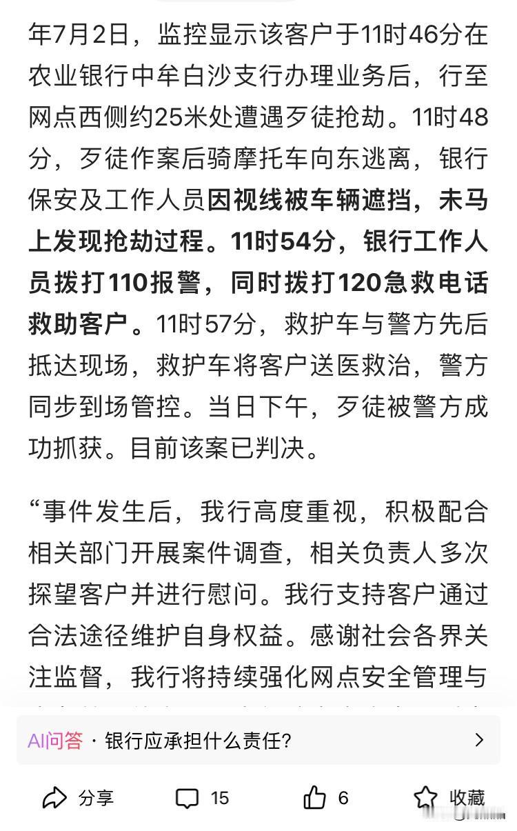 男子取170万现金,刚出银行就被歹徒抢劫,搏斗近20分钟,银行工作人员和门卫无动于衷?银行最新回应 去年7月,倪先生在河南郑州一银行存款170万现金,没想到一出银行就被一名歹徒持枪抢劫。倪先生称跟歹徒缠斗20分钟,朝他开枪,最后歹徒抢劫未遂,开摩托逃跑了。歹徒当天下午被捕,而后被判死刑缓期。 倪先生受重伤,左眼失明,称银行需要担责,提前预约了大额取钱,银行应该做好安保保障工作,表示在歹徒抢劫过程中,银行冷眼旁观,全程未参与制止和保护客户。最后是路人帮忙报警。 而银行最新回应,抢劫位置被遮挡,工作人员未及时发现,监控记录此外倪先生11:46分办完业务,11:48分歹徒已经逃离现场,11:54分银行报警和拨打120急救电话。11:57分救护车和警方抵达现场。 在银行门口发生抢劫,银行应该早发现,早干预,避免客户损失。银行该担部分责任。 原因有二: 一、银行监控是对准银行里里外外的,监控画面应该有员工全程值守,在银行25米处抢劫,为何监控没有第一时间发现? 二、客户提前预约大额取钱,银行方面是知道的,为何没有做好安保保障,难道真的客户离柜就概不负责了吗? 倪先生和银行各执一词,孰是孰非暂无定论,且关注后续进一步调查结果。