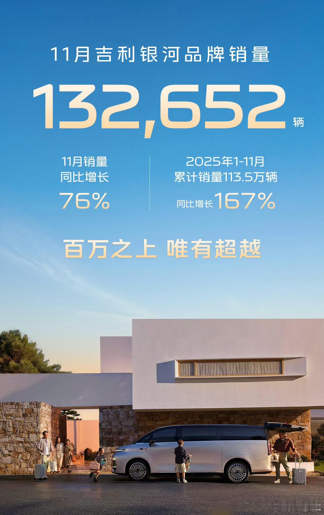 吉利高管称百万银河只是起点谁能想到,上一年还在为突破苦恼的吉利银河,今年竟能杀出重围。年初他们把“年销百万”写在台面上时,外界更多是当成一句狠话。结果呢?10 个月就提前完成,成为继特斯拉、比亚迪之后,全球第三个做到年销百万的新能源品牌。从去年下半年开始连续做出 E5、星愿、星舰 7 等爆款,再到今年的全矩阵开花,可以看出吉利银河已经形成了稳定制造爆款的能力。百万不是终点,而是他们真正开始加速的起点。吉利高管称百万银河只是起点