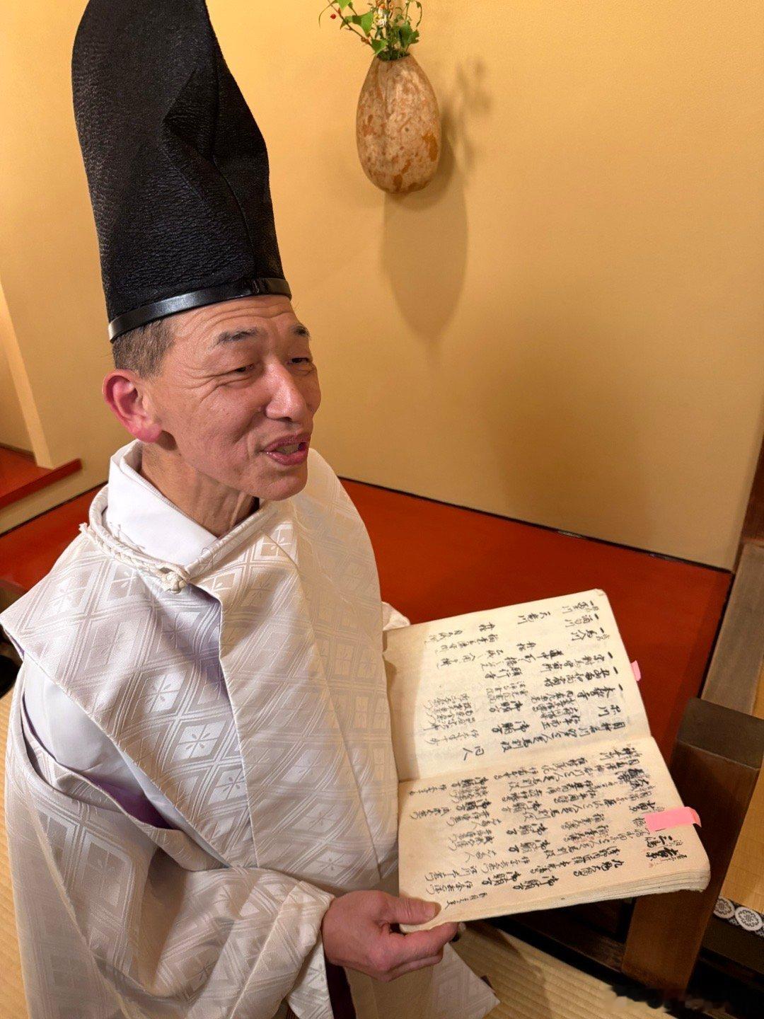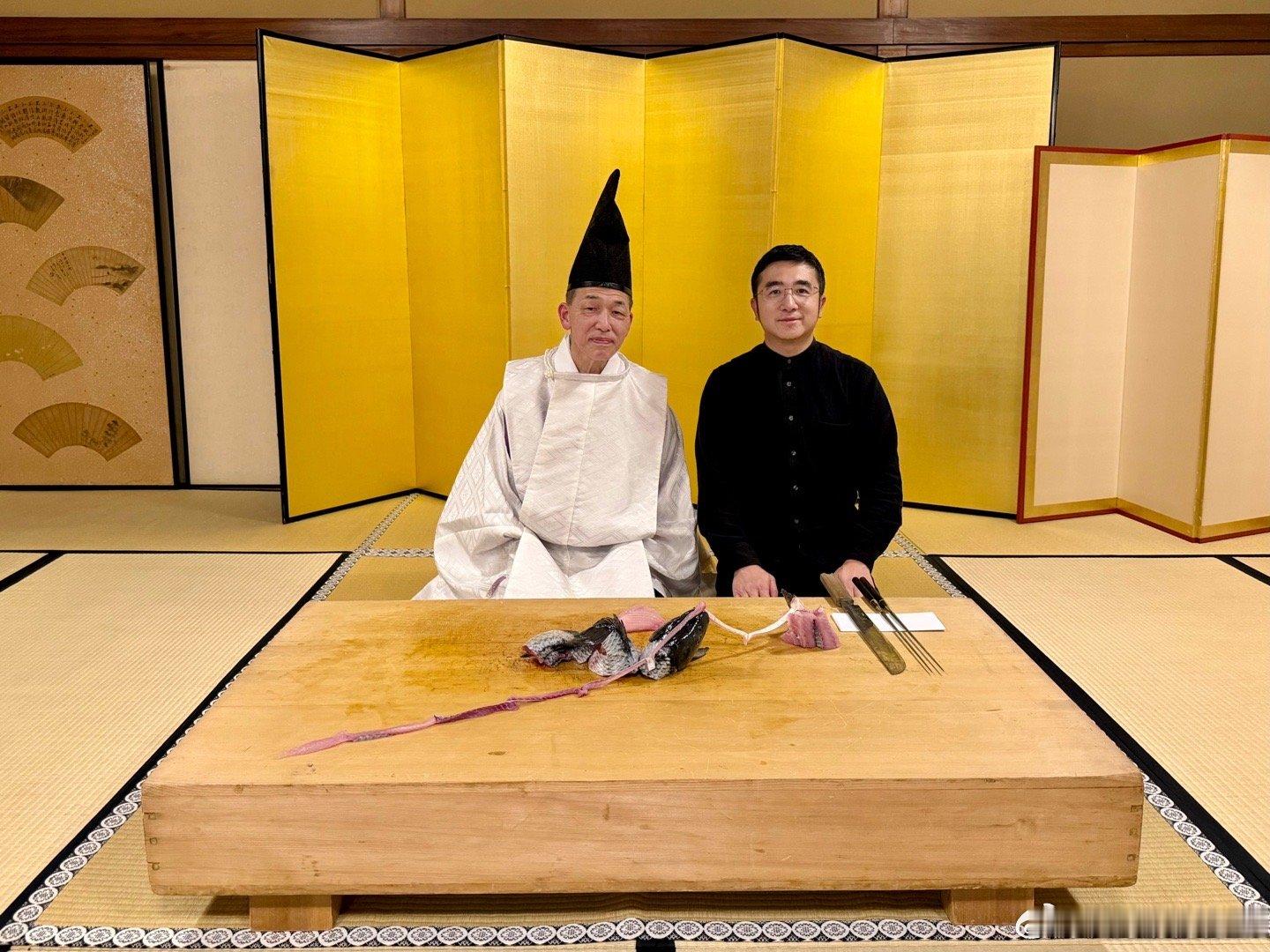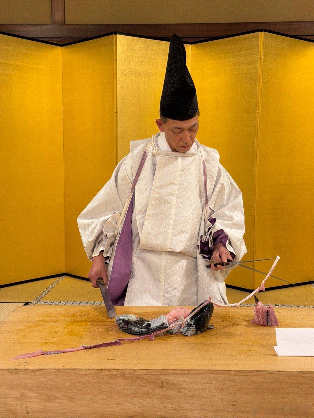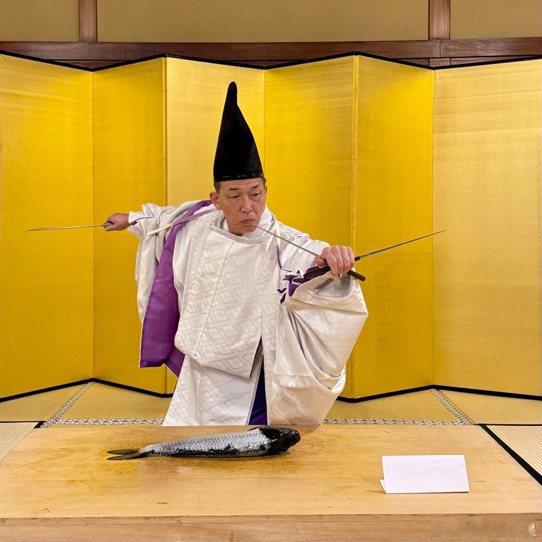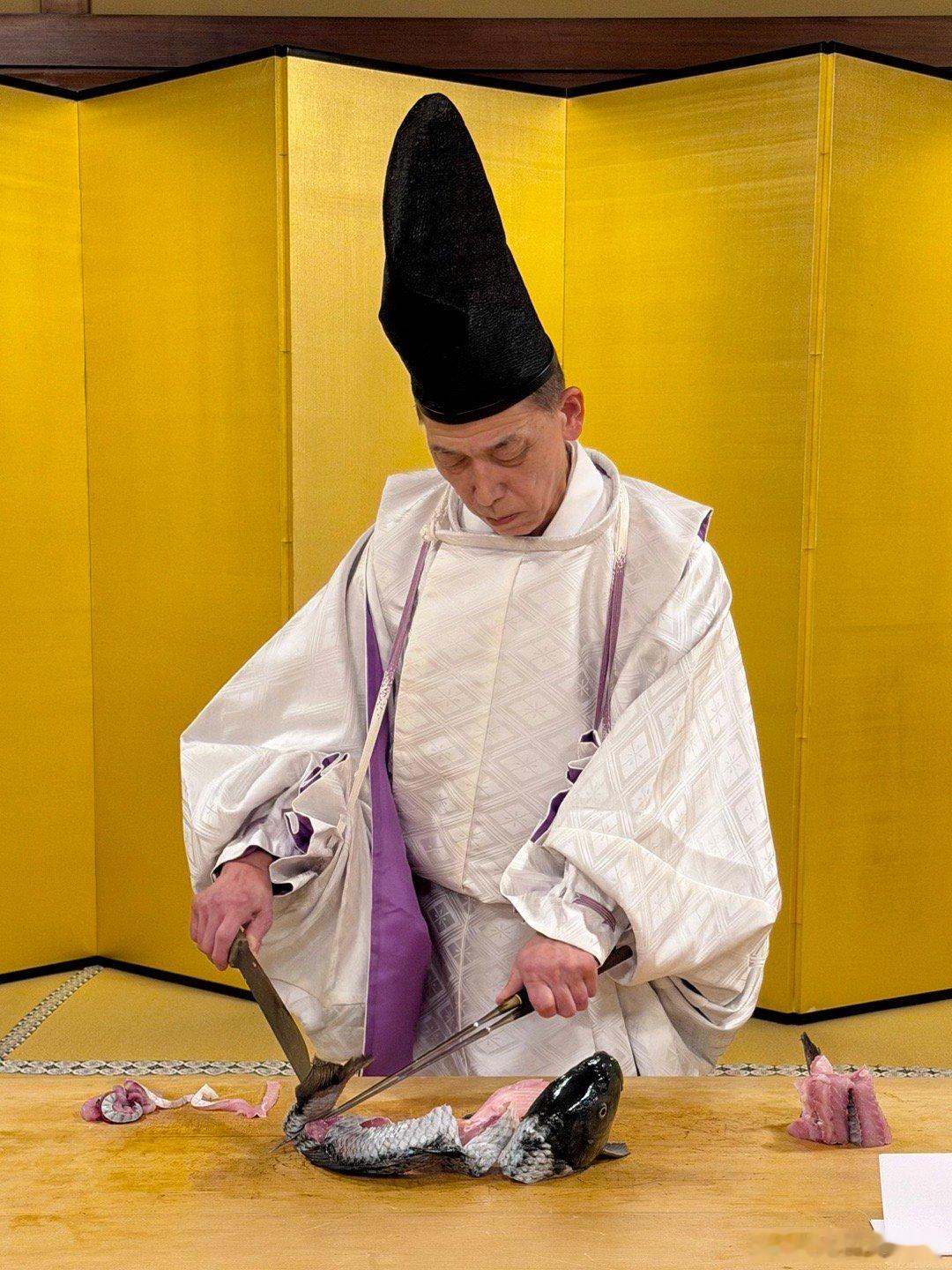 世界非物质文化遗产,和食生间流式庖丁,京都万龟楼。这是日本御膳的特殊仪式,创立于九世纪清和天皇贞观时期(859-877),当时的中纳言藤原政朝奉敕命制定宫廷餐饮礼仪,确立了名为“式庖丁”的仪式。此仪式创立至今一千一百余年,在日本宫廷之中每逢重大典礼,必于御膳前行此仪式。藤原政朝后裔侍奉镰仓幕府,被源赖朝赐姓“生间”,改名为生间五郎左卫门尉兼庆,并受赐三藤家纹,担任幕府仪典之长。后世子孙相继侍奉足利氏、织田氏,后为丰臣秀吉家臣。至第十六代生间三郎左卫门尉兼长时,受命主持后阳成天皇的“聚乐第行幸”,并将式庖丁之仪进呈后阳成天皇御览,因此获得赏赐。后成为丰臣秀吉养子八条宫式部卿一品亲王的家臣,官拜从五位式部典膳出云守。至今传于生间家的《桂宫别业记》,是记载当时宫家事迹的唯一珍贵史料。江户时代的日本国宴主要招待朝鲜使节,都要以生间流餐膳之仪,行七五三之礼调理御膳。操刀者是生间流第三十代家主生间正保,他也是京都米其林二星餐厅万龟楼的第十代主人。这个仪式的操刀者必须左手持一双特制的长筷子,右手持一把形似长剑的雕刻刀,以规定的刀法切割鱼肉或禽类,摆出吉祥造型,全程双手不得接触食物。今天摆出的造型是伊势的夫妻岩。据说有好几千种造型,他自己也并不都会。为了招待贵客,生间家拿出了家传的珍贵资料,都是原件。图7是16世纪天正年间织田信长在安土城招待德川家康的菜单。图8是后水尾天皇二条城行幸时,德川秀忠和德川家光两代将军招待天皇的菜单。图9的书是江户时代的日本国宴菜单,是用来招待朝鲜国使节团的。这些都是生间家主持的宴饮,祖宗传下来备料的菜单,三十代日本御厨真不是吹的。