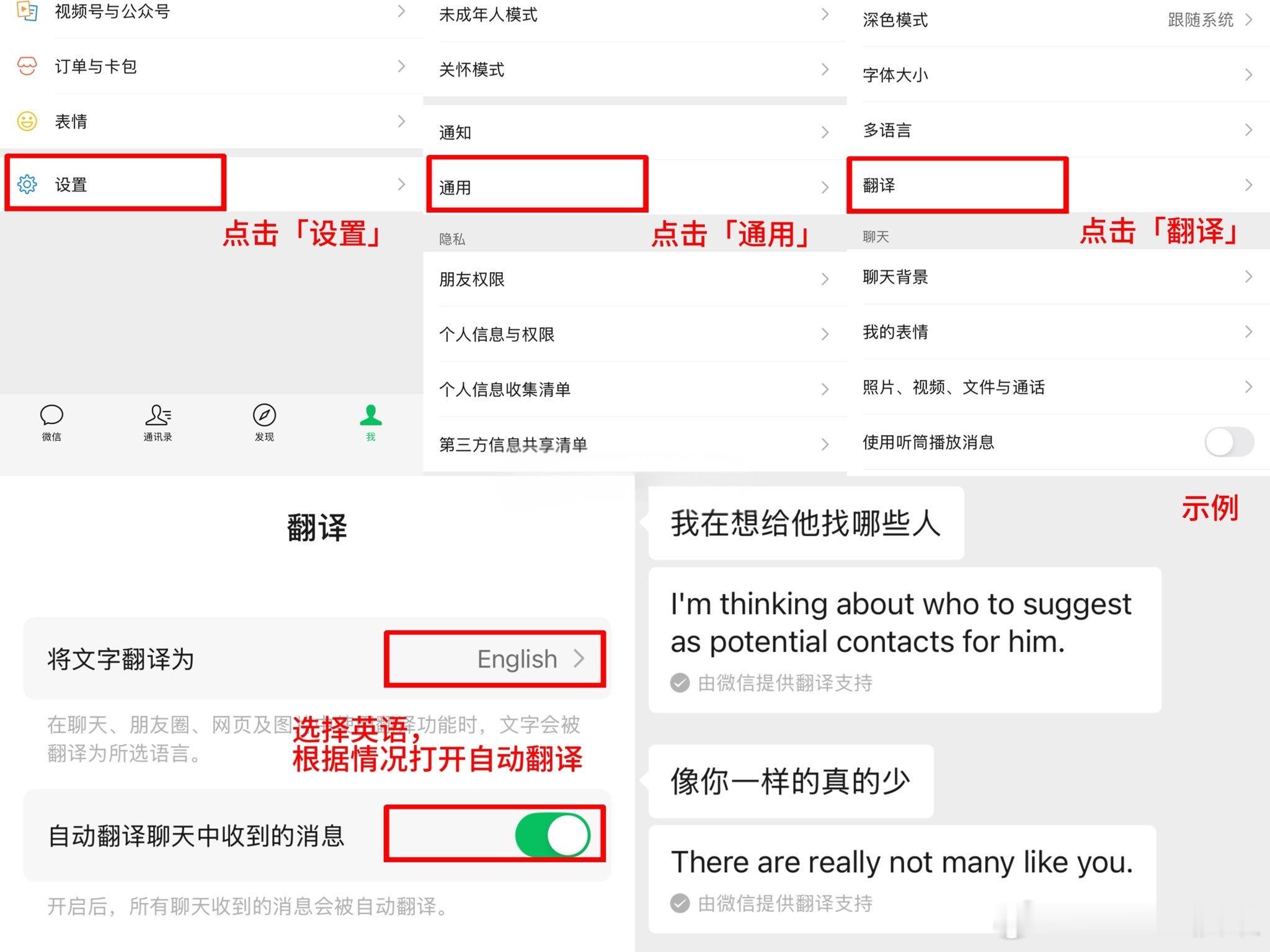 我一当了英语老师的高中同学分享的,微信其实可以极大地帮助你快速提升日常英语交流能力,前往:【我】—【设置】—【通用】—【翻译】—【将文字翻译为英语,并打开自动翻译】就行了,从下一条信息开始,只要有人给你发消息,它就会自动翻译,包括一些方言也能正确翻译。我自己用了两三天感觉效果真的不错,至少很多日常用到的一些词和表达你都可以看到。