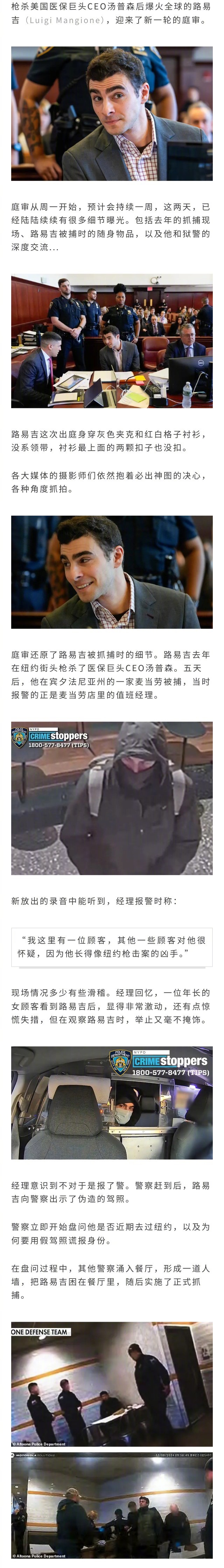 枪杀美国医保CEO的枪手路易吉最新出庭,现场曝光了大量新细节:抓捕现场相当抓马,路易吉在狱中和看守热聊社会、人性,还深度讨论文学...