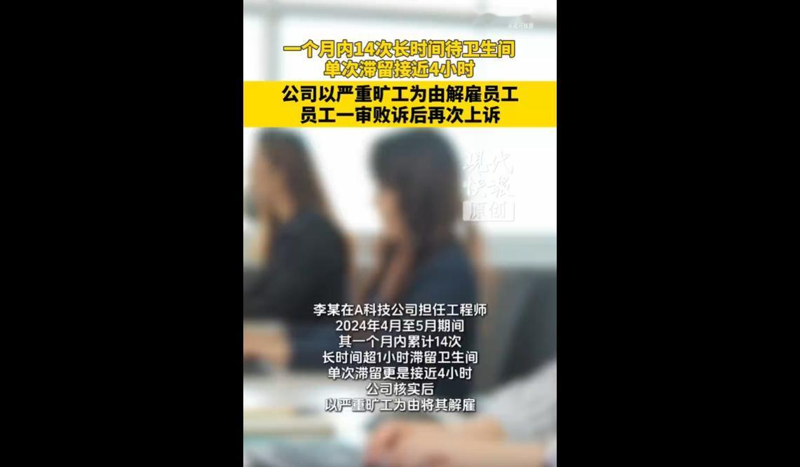 苏州工程师李某入职 10 年签了无固定期限合同,却在一个月内 14 次长时间待在卫生间,单次近 4 小时,远超合理范围,还没提前说病情或请假。 公司按他签过字的《员工手册》,以严重旷工为由解雇了他。 李某不服,两次上诉要求 32 万赔偿金,最终法院调解,公司给了他 3 万元补助。 这事也引发热议,南京有家企业曾规定如厕超 15 分钟罚 450 元,还装监控,被质疑违规。 这事看着复杂,其实核心就是劳资双方得守规矩、讲情理。 李某一个月十几次长时间泡在厕所,不跟公司报备,岗位还需要随时响应,这明显耽误工作,违背了员工该尽的责任,公司按规定解雇没毛病。 但反过来,南京那家企业限 15 分钟如厕、装监控罚款,也太离谱了。 如厕是基本生理需求,这么管控不仅不人道,还涉嫌侵犯隐私,完全不符合法律规定。 好的管理该是 “有规矩也有人情”:员工得遵守公司合理制度,有健康问题早沟通;企业制定规定也得合情合法,不能搞 “一刀切” 的奇葩要求。 这次调解给 3 万补助,既顾了法律规矩,也考虑了李某多年的工龄,算是情理法兼顾。 希望不管是员工还是企业,都能互相体谅,别把好事办歪。