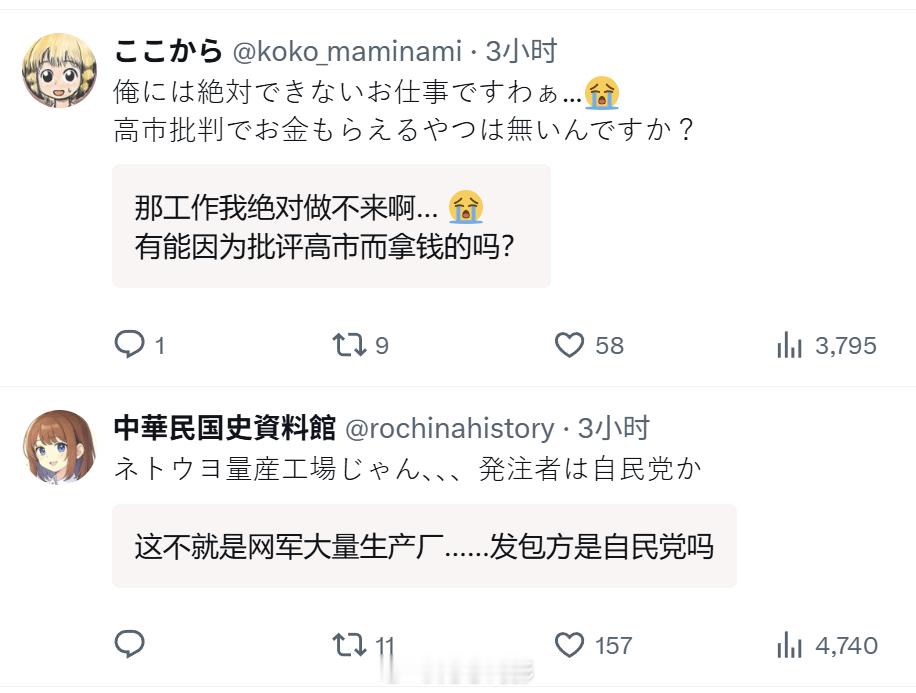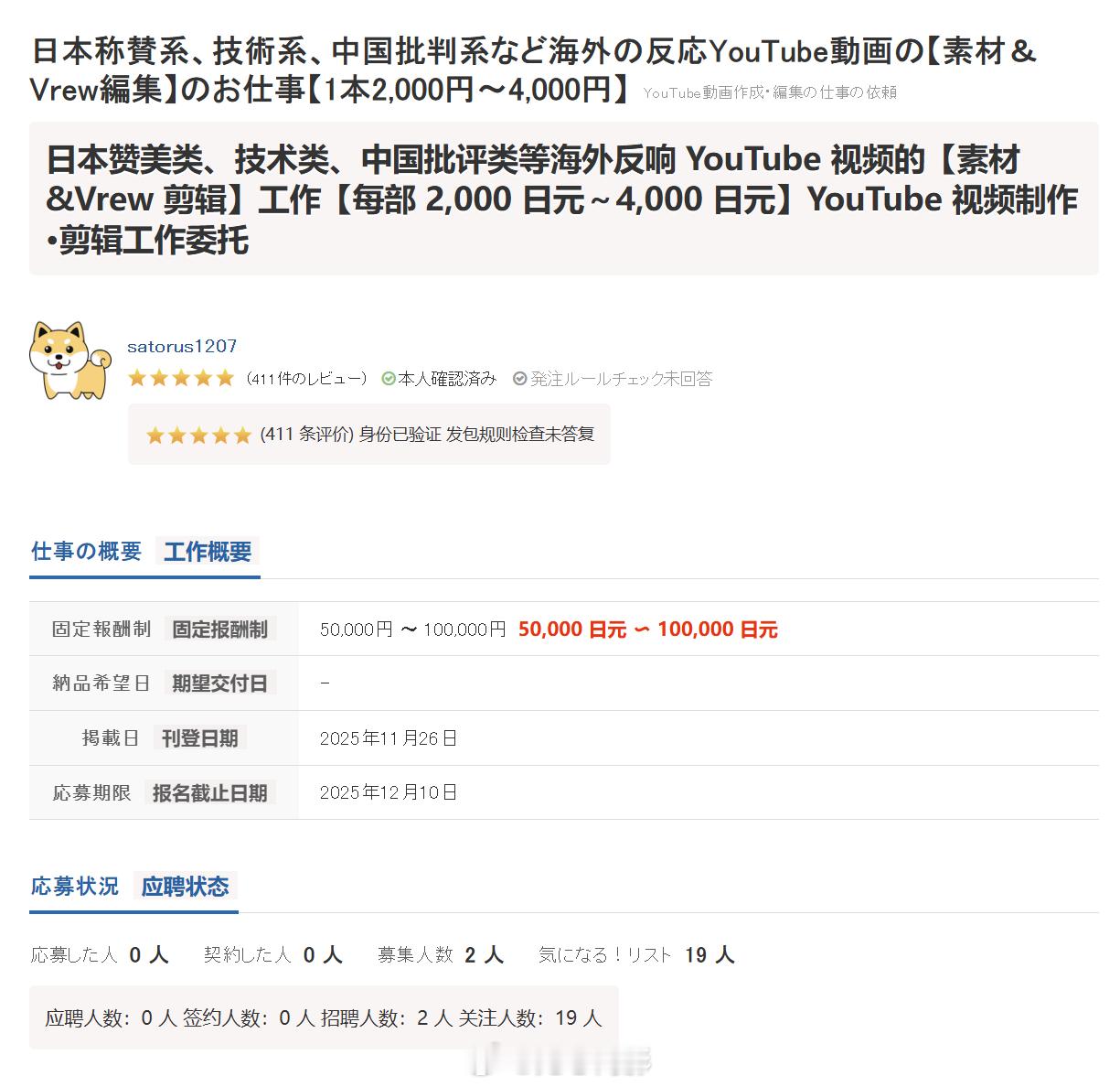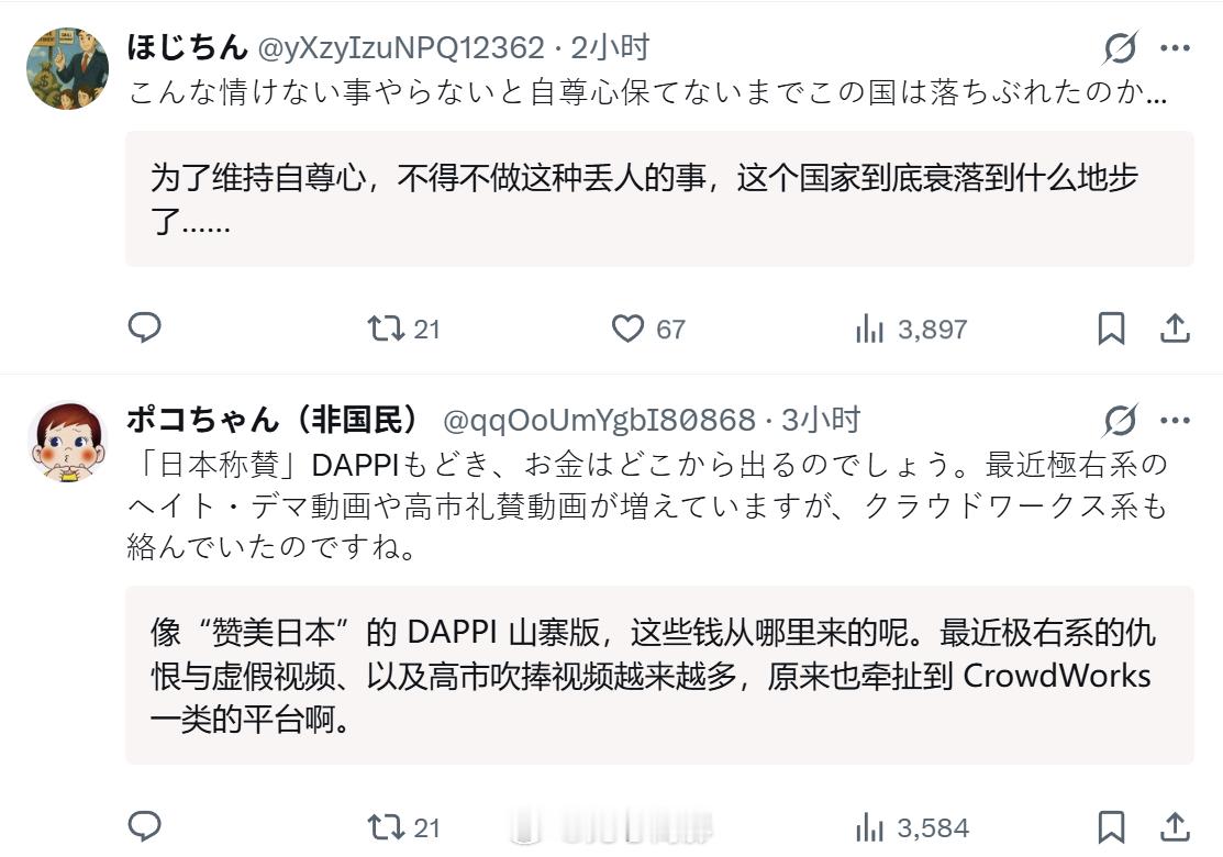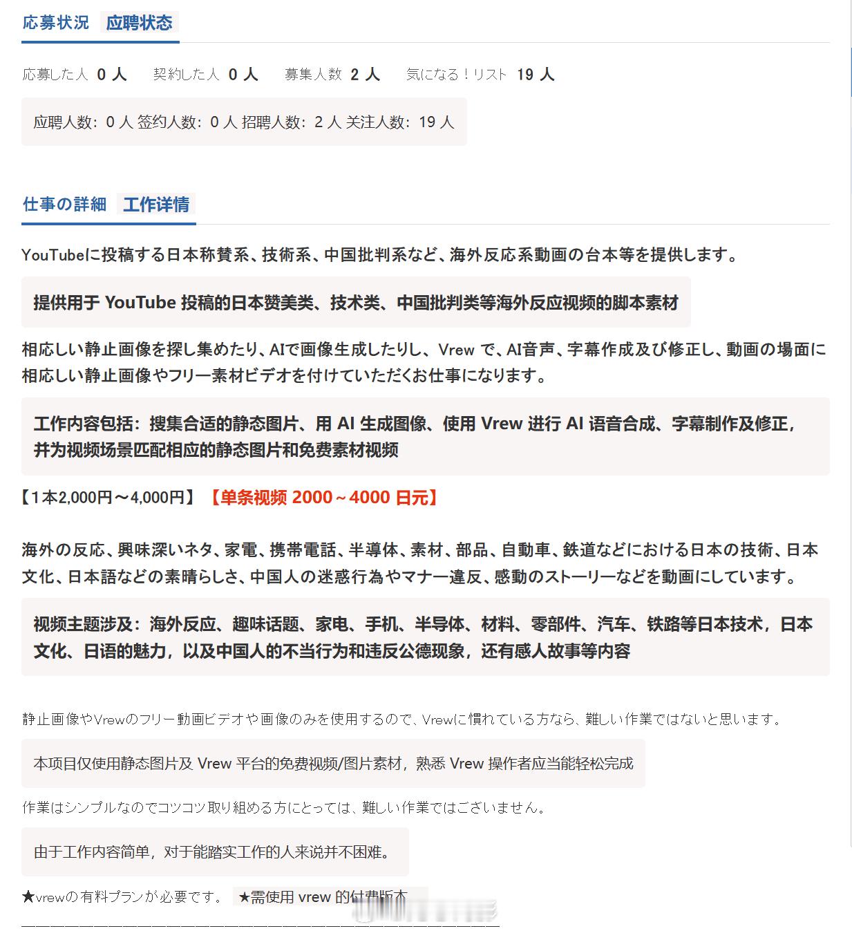 日本网民发现,有人在日本的众包平台上招募制作“赞美日本”“批评中国”的视频的剪辑人员。应聘资格是“非常喜欢日本的人”。看了下价格,一条视频的报酬是2000日元(约90人民币)-4000日元(180人民币),视频时间长度15分钟的2000日元,长度27分钟以上的4000日元。主题要涉及:海外反应、趣味话题、家电、手机、半导体、材料、零部件、汽车、铁路等日本技术,日本文化、日语的魅力,以及中国人的不当行为和违反公德现象。视频要发布在油管上。好家伙,真的好家伙~连基本的掩饰都不掩饰了啊日本两个团体请求访华海外新鲜事
