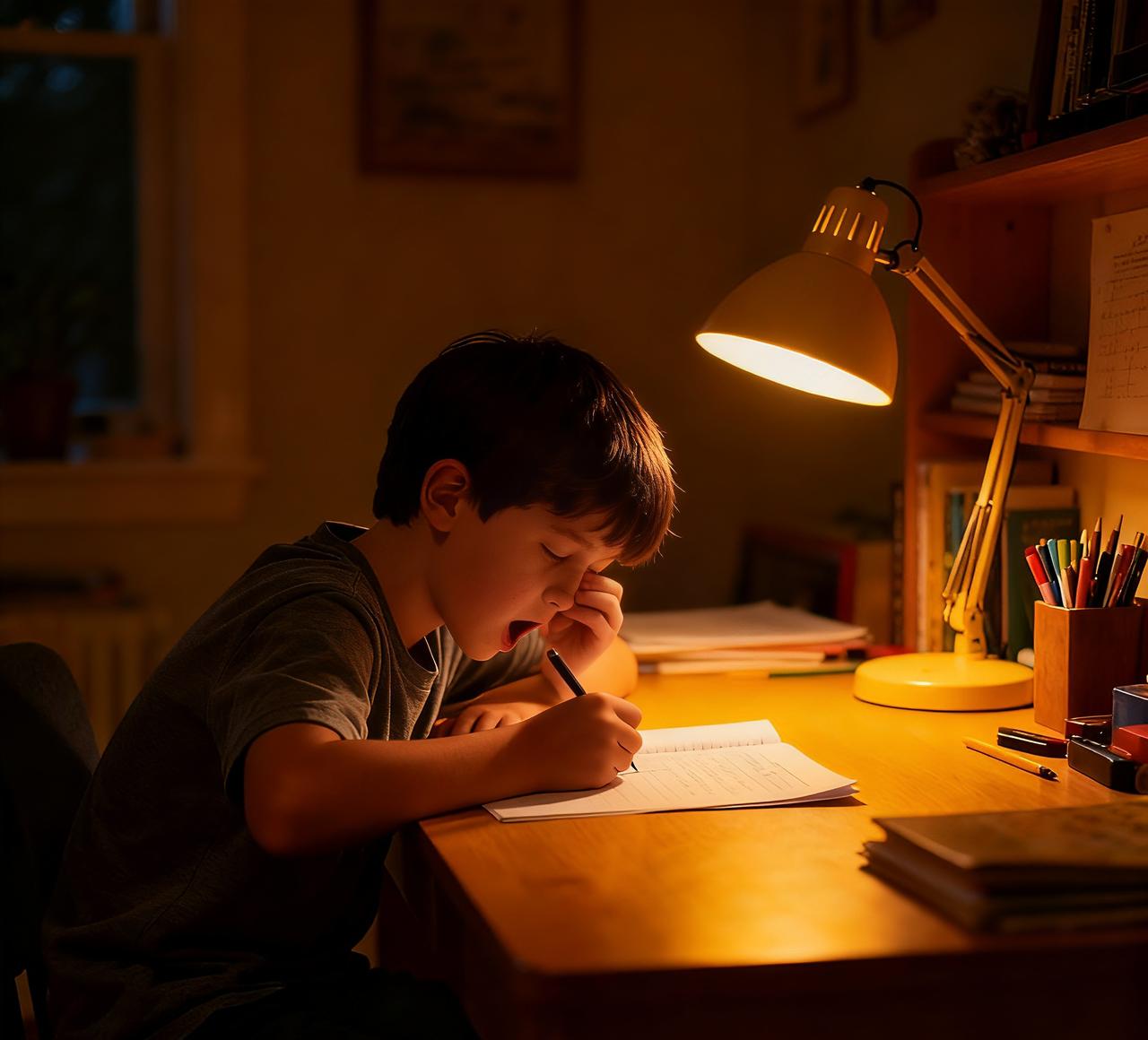 已经晚上10点半了, 儿子还在写作业, 我既心疼又难过😔 他爸早就下班了, 我年幼的儿子还在写作业。 我都不指望儿子将来考名牌大学, 学校又何必布置那么多作业呢! 我真想替儿子写作业, 字体又不一样 , 被老师发现, 儿子又得挨批评 , 一个小学而已, 老师布置那么多作业干什么? 多写点作业就能提高成绩? …… 读万卷书, 不如行万里路, 我有时候真的想让儿子休学, 带着儿子天南地北的去看看。 窗外北方呼啸, 似鬼哭狼嚎,温度骤降, 我儿子还在寒冷的夜晚写作业, 他的小手冻得冰凉🥶 也不知道他的作业什么时候能写完? 你们说,小学生写那么多作业有什么意义呢? 还有谁跟我儿子一样,这个点还在写作业啊? 图片豆包制作
