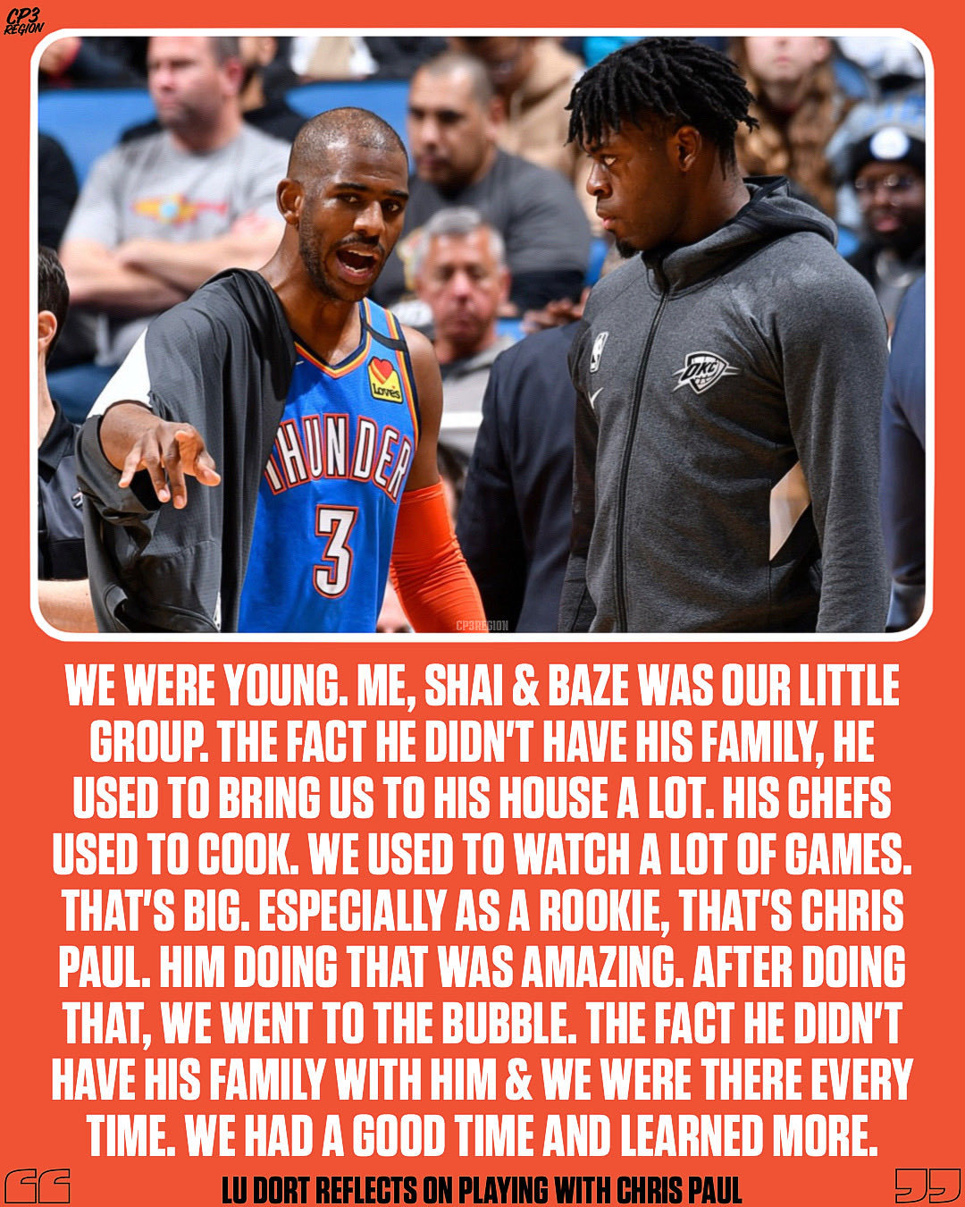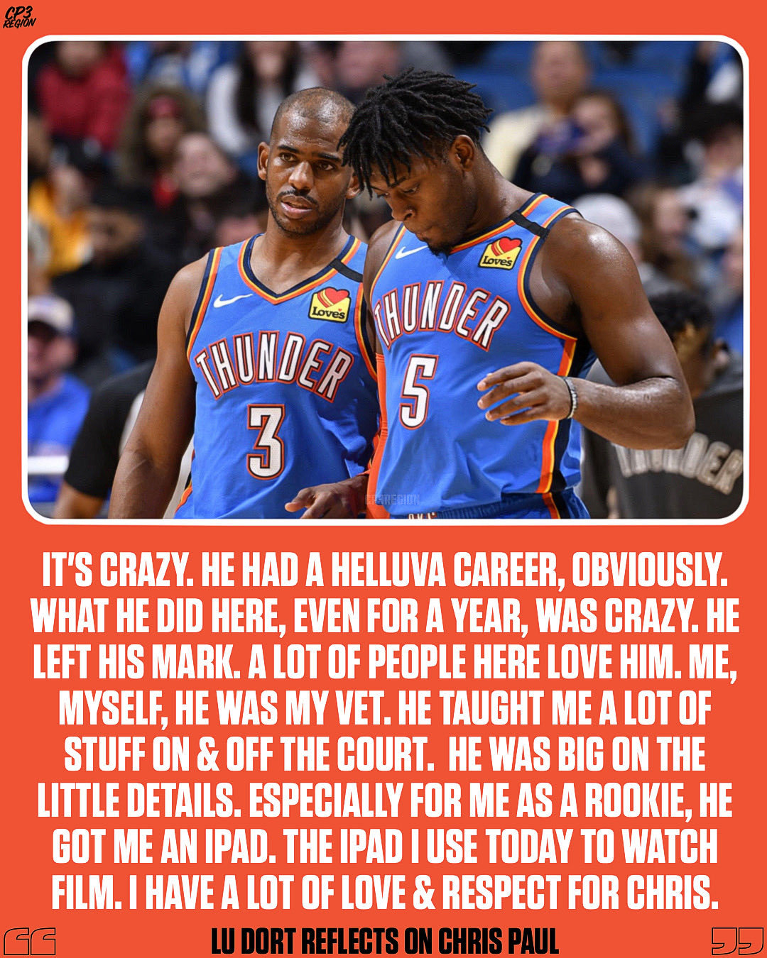 想念5年前雷霆时的保罗多尔特回顾这段经历:“ 我们当时很年轻。 我、SGA,贝兹利我们是小团体。因为他的家人不在身边,他常带我们去他家里。他的厨师会给我们做饭。我们会一起看很多比赛。这非常重要。特别是对于一个新秀来说,那可是克里斯·保罗啊他为我们做这些真是太棒了。在那之后,我们进入了季后赛,在泡泡区。 因为他的家人没有和他在一起,而我们一直都在。我们度过了愉快的时光,并且学到了更多东西。这很不可思议。 显然,他拥有了一段非常辉煌的职业生涯。他在这里的贡献,即使只有一年,也是惊人的。他留下了他的印记。这里的很多人都爱他。就我自己而言,他是我的导师。 他在场上场下都教了我很多东西。他非常注重微小的细节。特别是对于当时还是新秀的我,他送了我一个iPad。就是我现在用来观看比赛录像的iPad。我对克里斯充满了爱与尊重。”也是从那个时候开始,保罗开始成为年轻人的导师,言传身教,雷霆时期,时隔4年重返全明星,关键时刻之王,于他而言,也是重生。5年后的雷霆,已经统治联盟了保罗将在赛季结束后退役新赛季篮不住