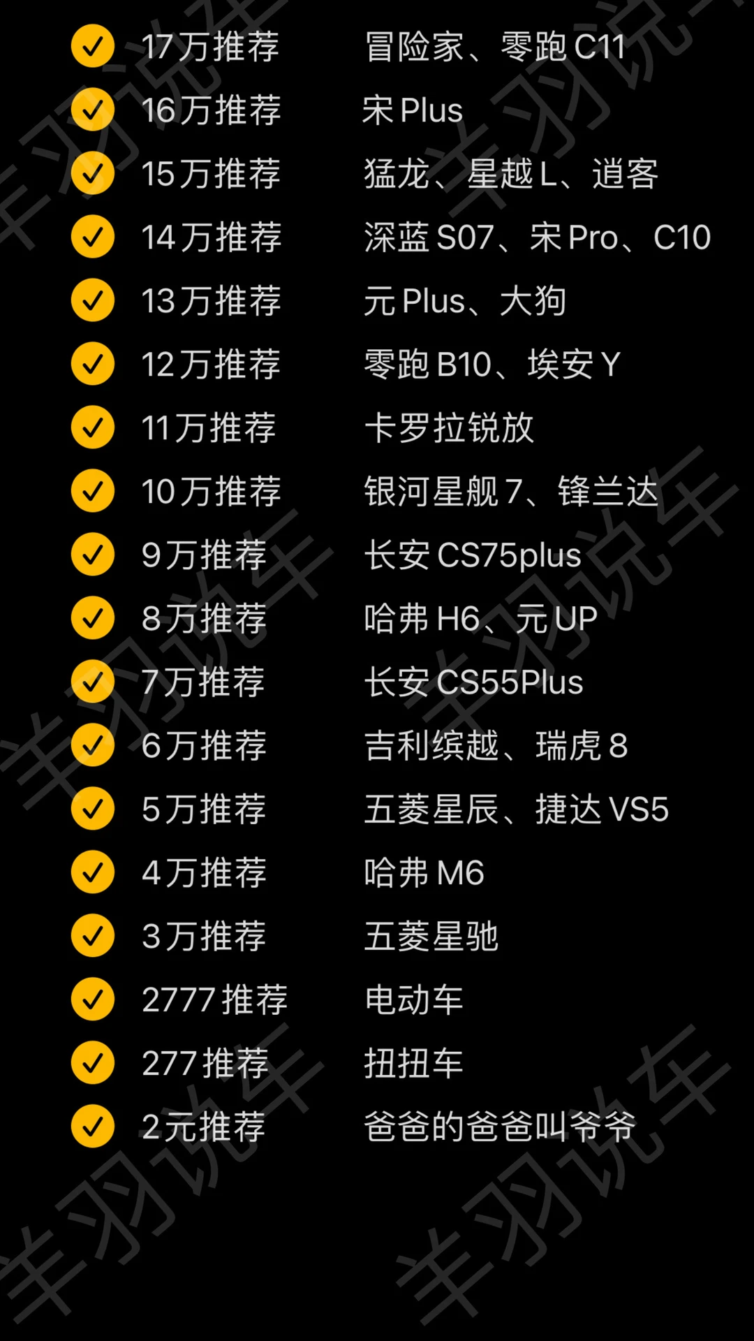 🚗近期很多车企纷纷发布新车,与此同时价格也不断的走低,但打算买车的姐妹,也同时出现了新的问题,就是车太多了,不知道怎么选? ❤️其实买车的底层逻辑很简单,就是看口袋有多少,就选什么车!毕竟群众的眼睛是雪亮的!按照这些表里的选,基本是错不了的!