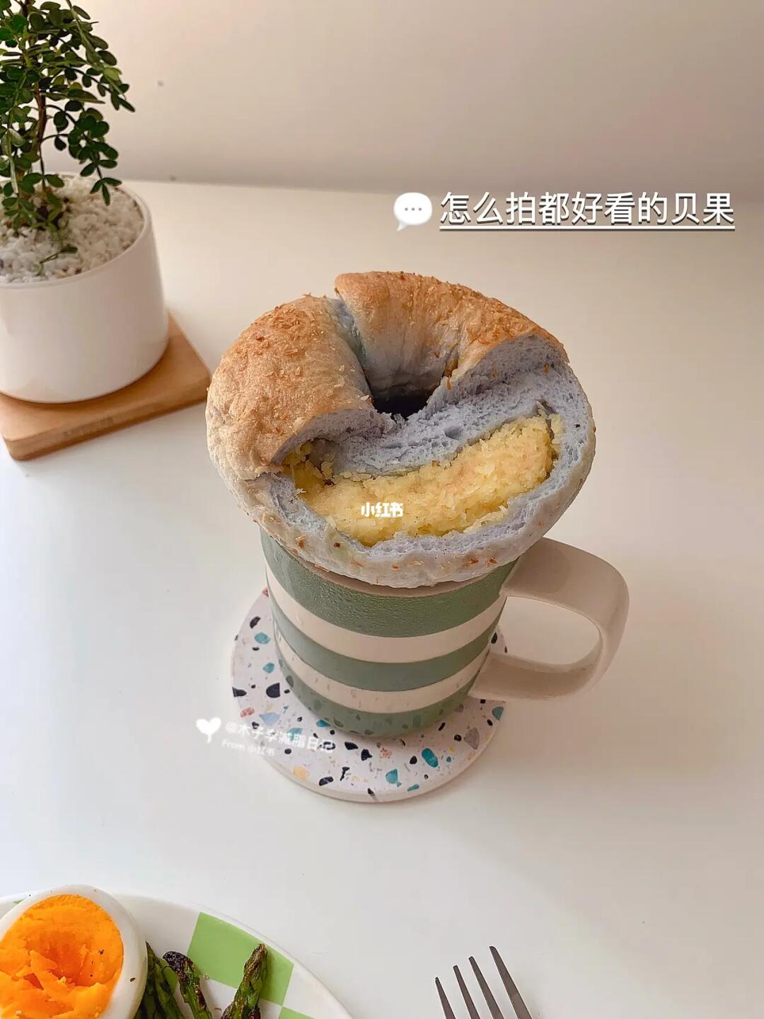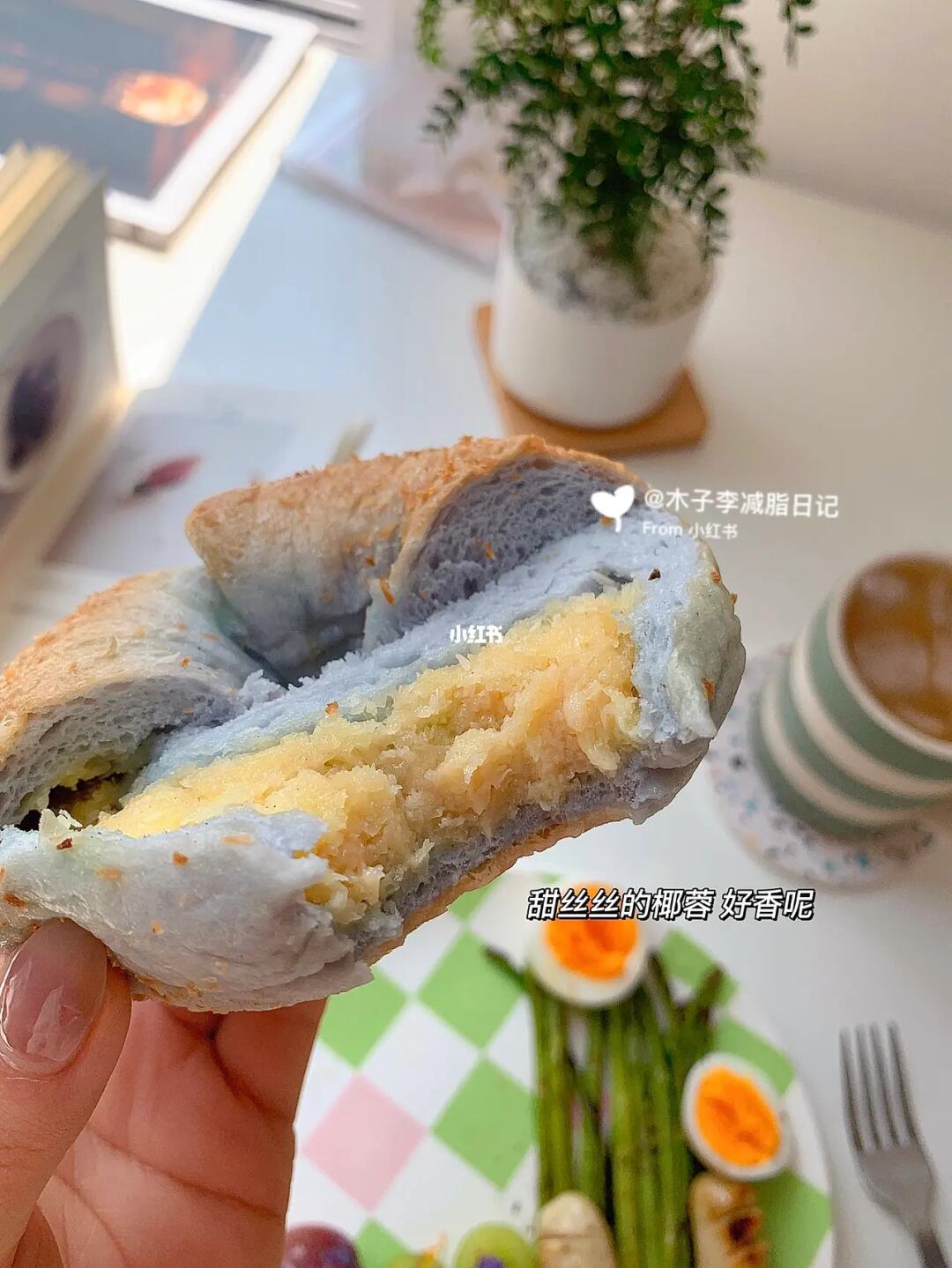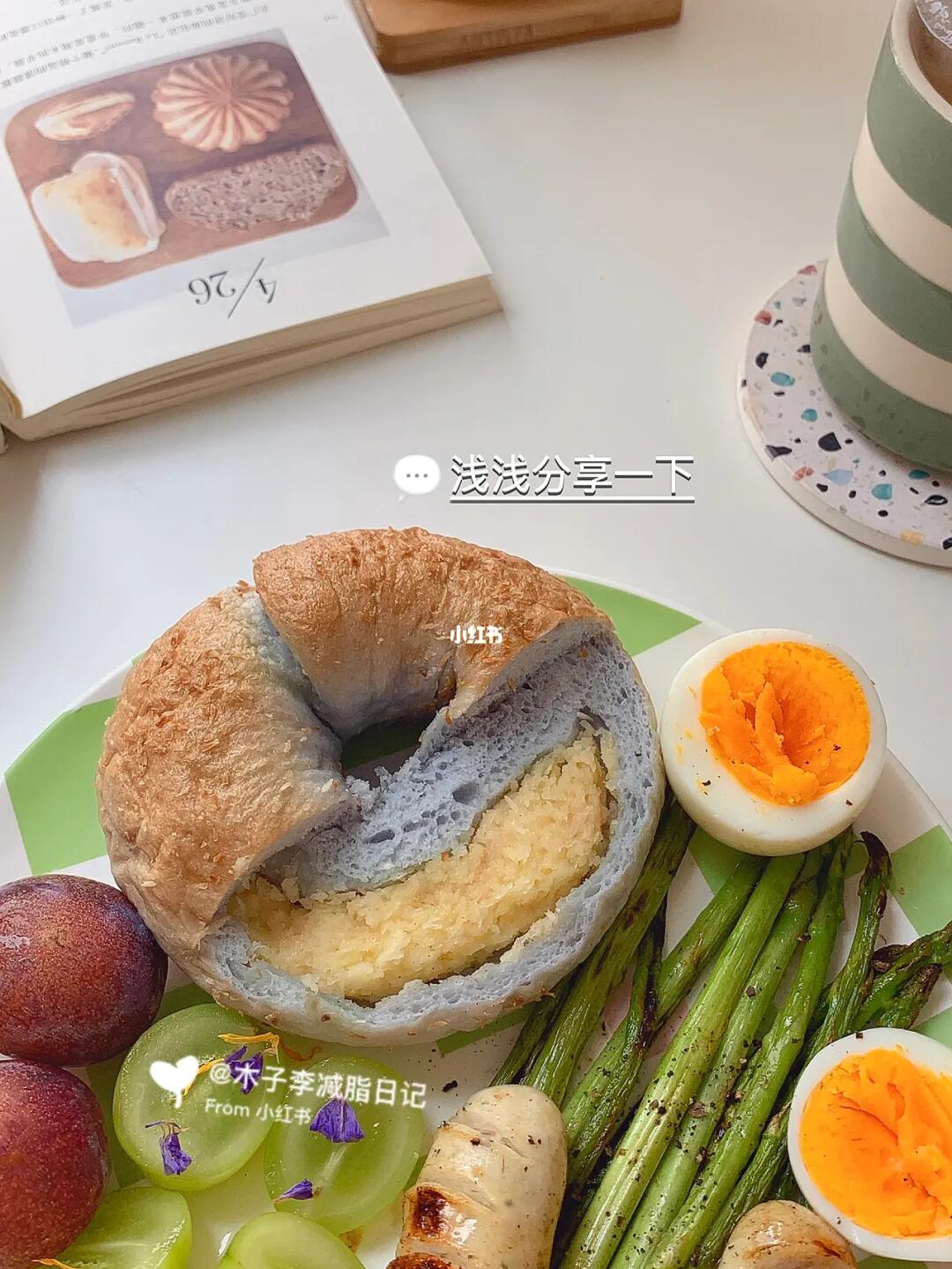 🥯早餐:蝶豆花椰蓉贝果|鸡肉肠|煎芦笋|青提|鸡蛋|西梅|冰咖啡