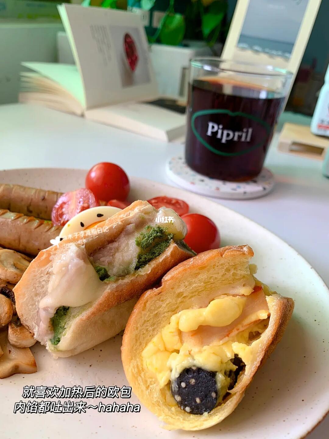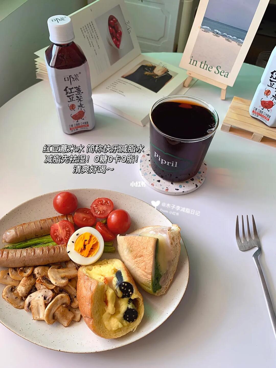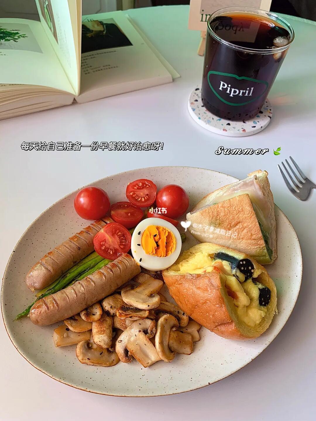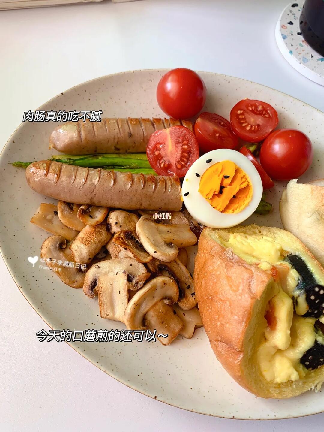 ☀️早餐:双拼欧包|口蘑|肉肠|煎芦笋|千禧果|鸡蛋|红豆薏米水