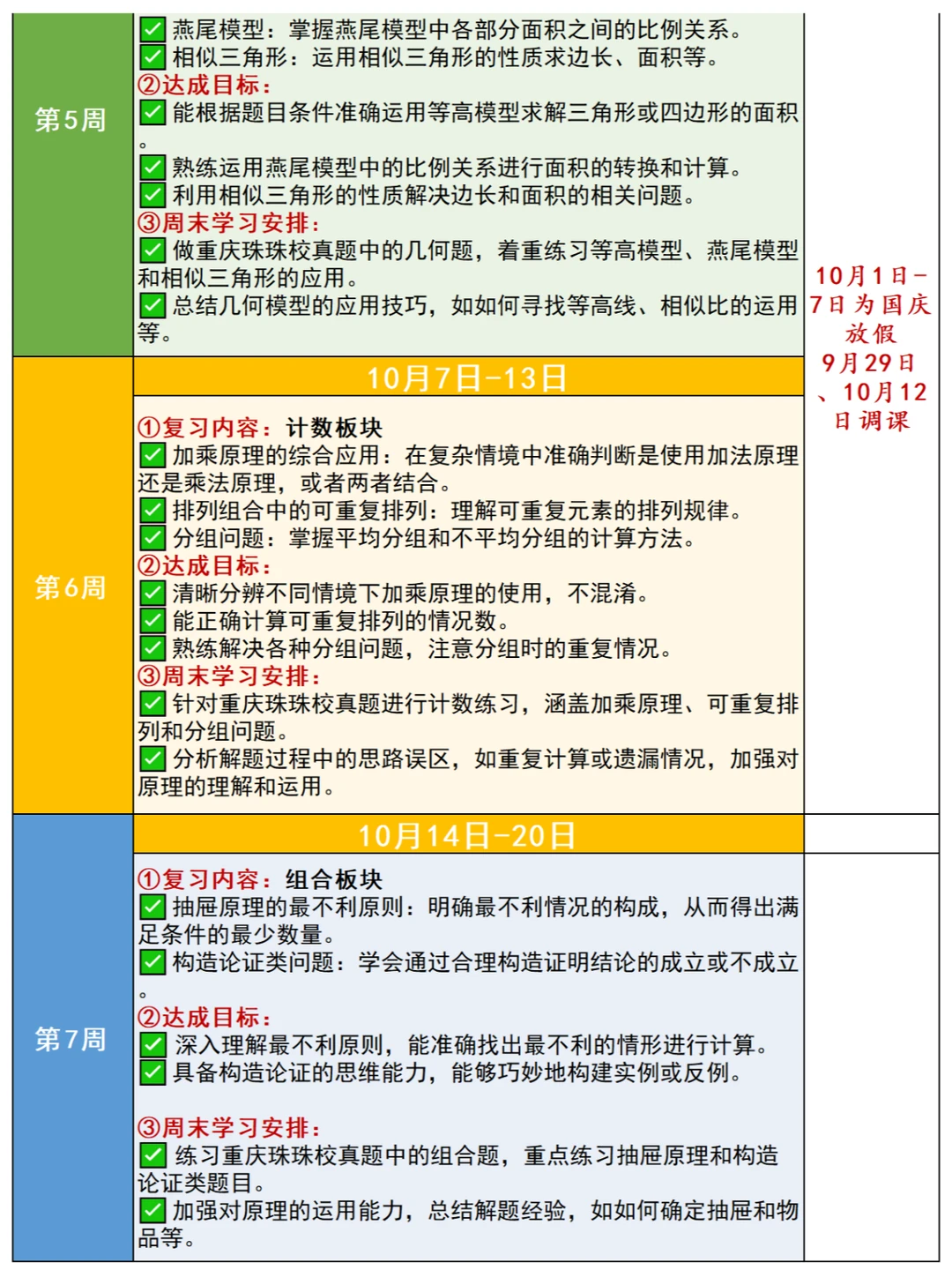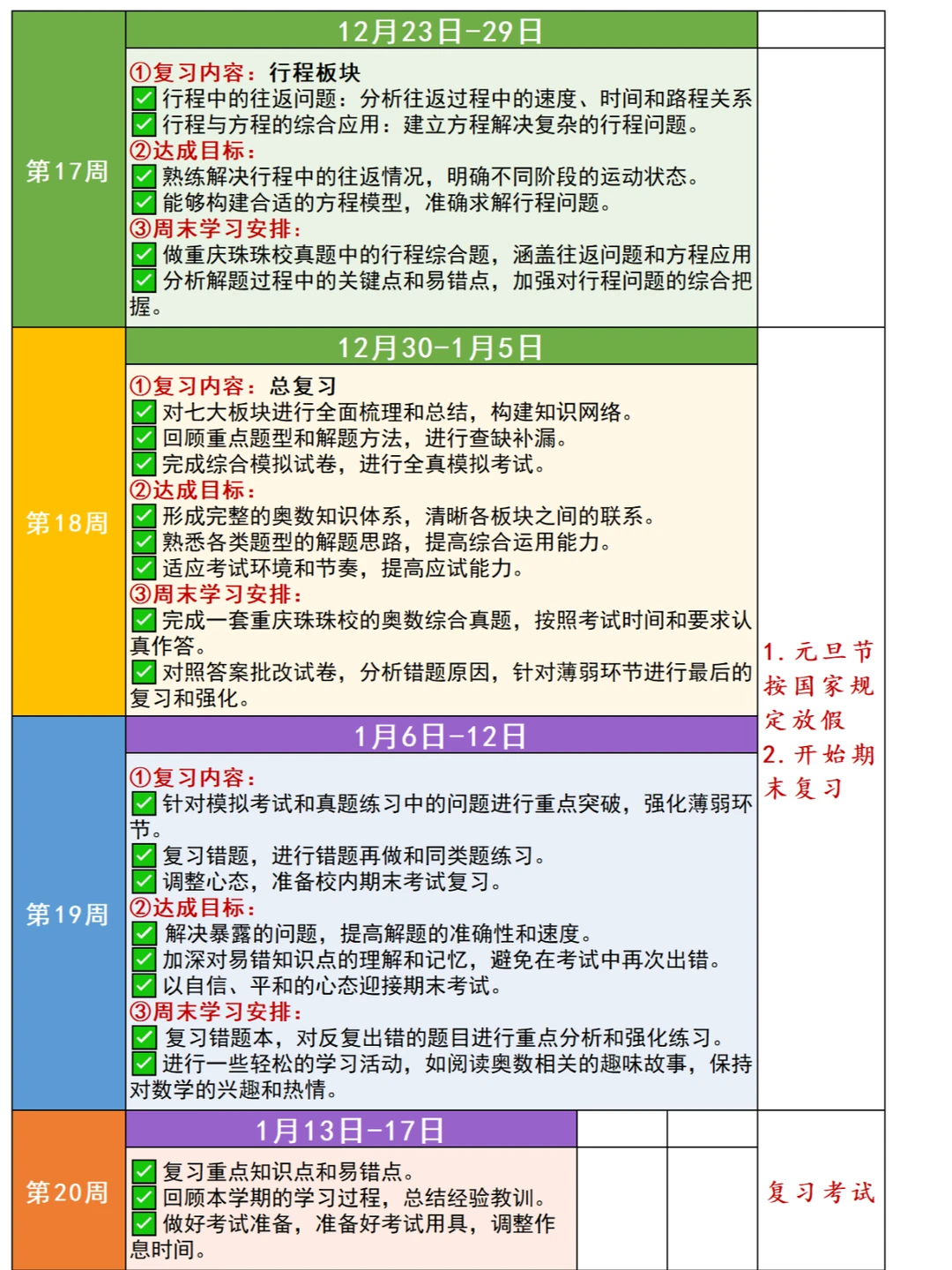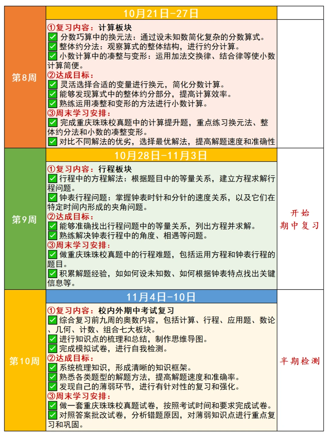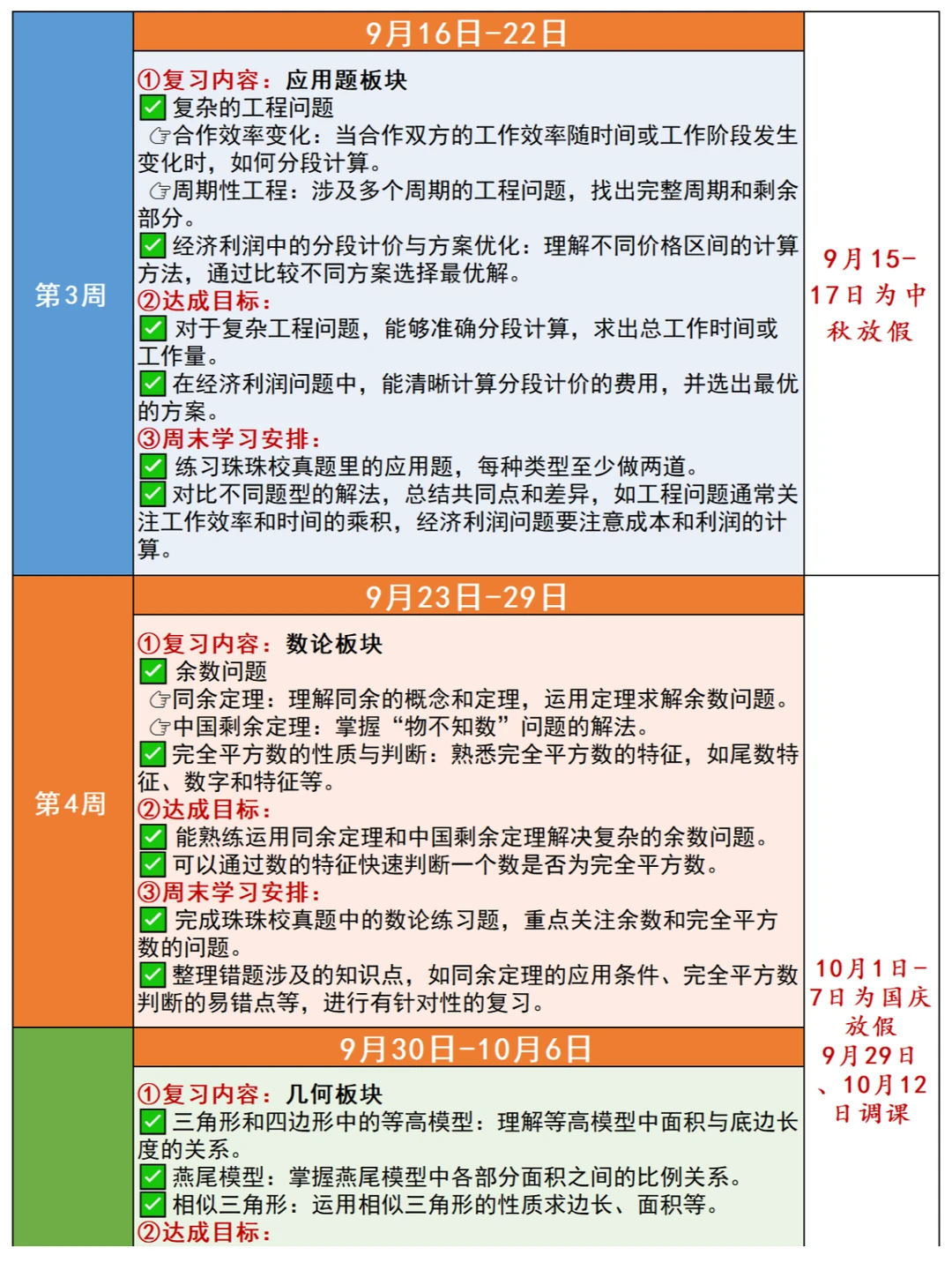 🎈暑假之后,很多5-6年级娃儿学完了奥数七大板块的内容,有关后续如何安排复习?很多家长没有方向,为此,小柏老师根据2024年下半学期的校历情况,出了这份“奥数七大板块复习新学期详细计划”,并且附上七大板块的知识点表格,帮助大家理解、梳理✅ 💥复习过程应该规避以下问题 ✅ 🟠计算板块 1️⃣不要为了快速完成计算任务而草率答题,要在确保准确性的前提下逐步提高计算速度。认真检查每一步计算过程,避免因粗心大意导致的错误。 2️⃣不能仅仅记住计算的公式和法则,要理解其背后的原理,以便在不同的情境中灵活运用。对于一些特殊的计算技巧,要通过实际练习来掌握,而不是机械地记忆。 🟡应用题+行程板块 1️⃣ 仔细阅读题目,理解题意,明确问题的要求和已知条件,避免因误解题意而答错。注意题目中的关键词和隐含条件,确保解题思路的正确性。 2️⃣ 要局限于一种解题方法,要尝试从不同角度去分析问题,运用多种方法解决应用题。培养创新思维,对于复杂的应用题,敢于尝试新的解题思路。 🟢几何板块 1️⃣不能仅凭直观印象来判断几何图形的性质和关系:要通过严格的推理和计算来确定。对于一些复杂的几何问题,要运用几何定理和公式进行准确的分析。 2️⃣注重培养空间想象力:通过观察实物、绘制图形等方式提高对立体几何的理解。多做一些需要空间想象的几何练习题,避免在考试中因空间想象力不足而失分。 🟠 数论板块 1️⃣ 深入理解整数的性质、因数倍数、质数合数等数论概念,不能一知半解。对于数论中的定义和定理,要通过具体的例子来加深理解 2️⃣ 数论知识较为抽象和系统,要进行有计划的复习,建立起完整的知识体系。不能孤立地学习各个知识点,要注重知识点之间的联系和综合运用 🌈复习阶段的刷题策略 ✅ 🟠有针对性地刷题 1️⃣ 根据自己在各个板块的薄弱环节,选择相应的练习题进行针对性训练 2️⃣ 不要盲目刷题,要注重质量而不是数量 🟢总结归纳错题 1️⃣ 做错的题目要认真分析原因,总结解题方法和技巧 2️⃣ 将错题整理成册,定期复习,避免再次犯错 🟡 模拟考试 1️⃣ 定期进行模拟考试,按照考试时间和要求进行答题,提高应试能力 2️⃣ 分析模拟考试的成绩和错题,及时调整复习策略