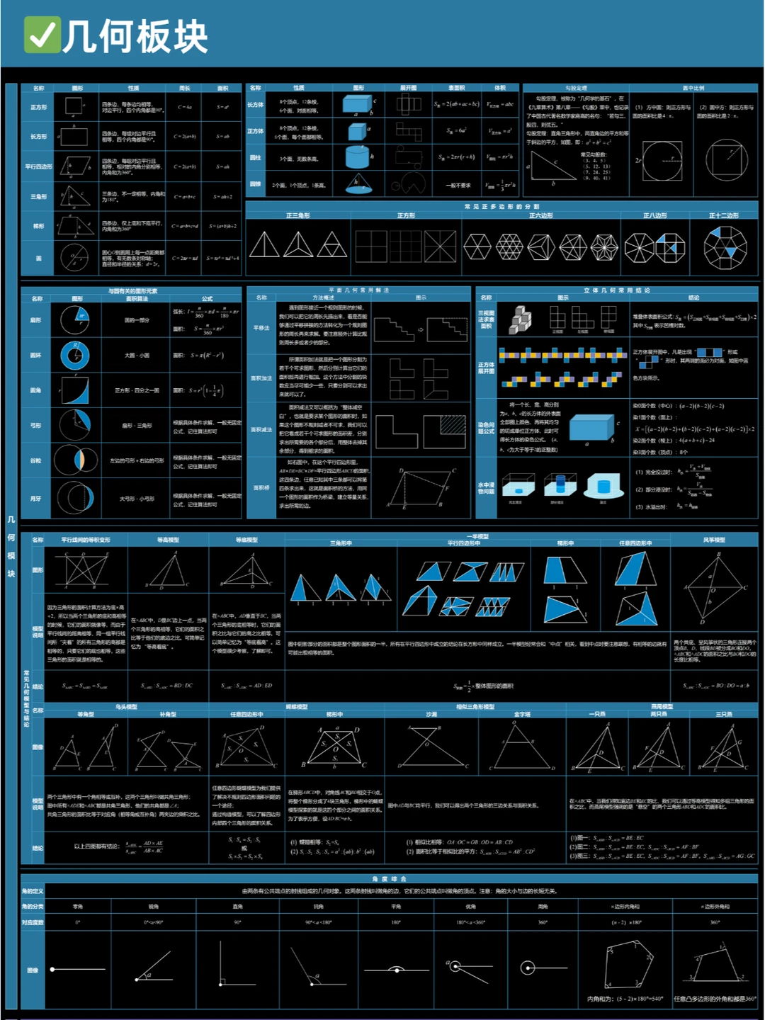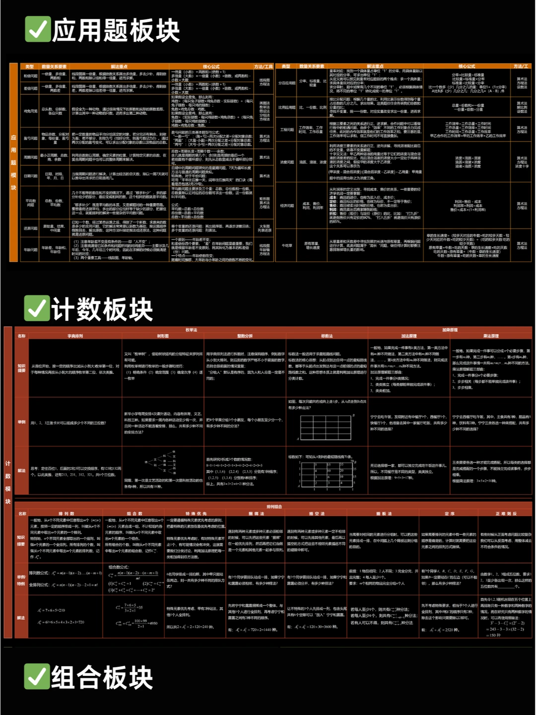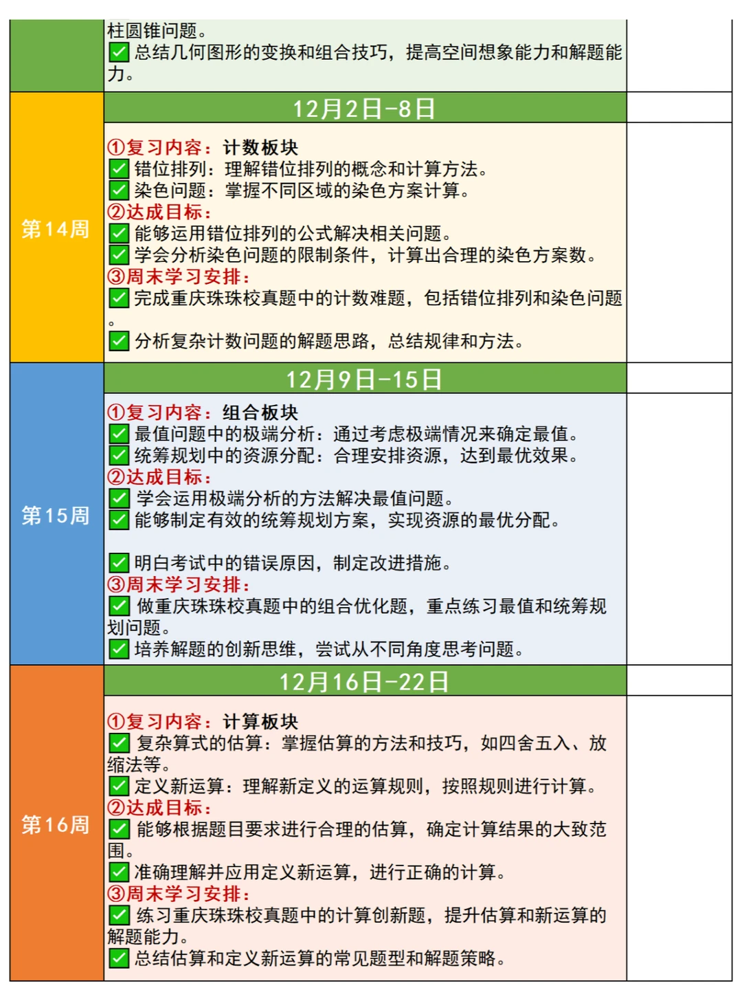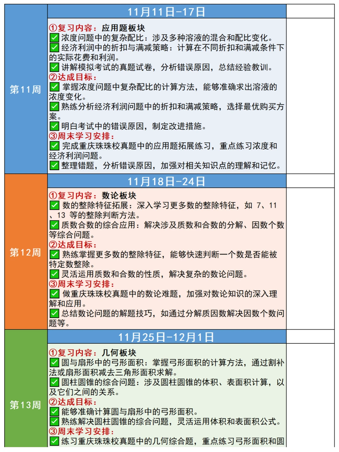 🎈暑假之后,很多5-6年级娃儿学完了奥数七大板块的内容,有关后续如何安排复习?很多家长没有方向,为此,小柏老师根据2024年下半学期的校历情况,出了这份“奥数七大板块复习新学期详细计划”,并且附上七大板块的知识点表格,帮助大家理解、梳理✅ 💥复习过程应该规避以下问题 ✅ 🟠计算板块 1️⃣不要为了快速完成计算任务而草率答题,要在确保准确性的前提下逐步提高计算速度。认真检查每一步计算过程,避免因粗心大意导致的错误。 2️⃣不能仅仅记住计算的公式和法则,要理解其背后的原理,以便在不同的情境中灵活运用。对于一些特殊的计算技巧,要通过实际练习来掌握,而不是机械地记忆。 🟡应用题+行程板块 1️⃣ 仔细阅读题目,理解题意,明确问题的要求和已知条件,避免因误解题意而答错。注意题目中的关键词和隐含条件,确保解题思路的正确性。 2️⃣ 要局限于一种解题方法,要尝试从不同角度去分析问题,运用多种方法解决应用题。培养创新思维,对于复杂的应用题,敢于尝试新的解题思路。 🟢几何板块 1️⃣不能仅凭直观印象来判断几何图形的性质和关系:要通过严格的推理和计算来确定。对于一些复杂的几何问题,要运用几何定理和公式进行准确的分析。 2️⃣注重培养空间想象力:通过观察实物、绘制图形等方式提高对立体几何的理解。多做一些需要空间想象的几何练习题,避免在考试中因空间想象力不足而失分。 🟠 数论板块 1️⃣ 深入理解整数的性质、因数倍数、质数合数等数论概念,不能一知半解。对于数论中的定义和定理,要通过具体的例子来加深理解 2️⃣ 数论知识较为抽象和系统,要进行有计划的复习,建立起完整的知识体系。不能孤立地学习各个知识点,要注重知识点之间的联系和综合运用 🌈复习阶段的刷题策略 ✅ 🟠有针对性地刷题 1️⃣ 根据自己在各个板块的薄弱环节,选择相应的练习题进行针对性训练 2️⃣ 不要盲目刷题,要注重质量而不是数量 🟢总结归纳错题 1️⃣ 做错的题目要认真分析原因,总结解题方法和技巧 2️⃣ 将错题整理成册,定期复习,避免再次犯错 🟡 模拟考试 1️⃣ 定期进行模拟考试,按照考试时间和要求进行答题,提高应试能力 2️⃣ 分析模拟考试的成绩和错题,及时调整复习策略