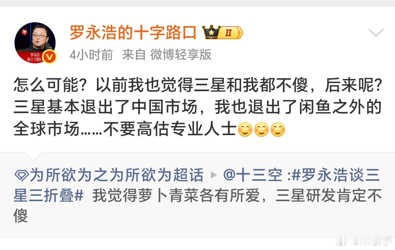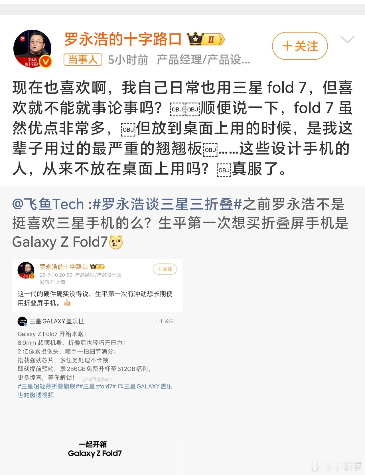 罗永浩自曝日常使用三星折叠屏老罗是三星折叠屏用户,所以许多说法也算是用户真实反馈了,三星在国内市场基本没啥了!
