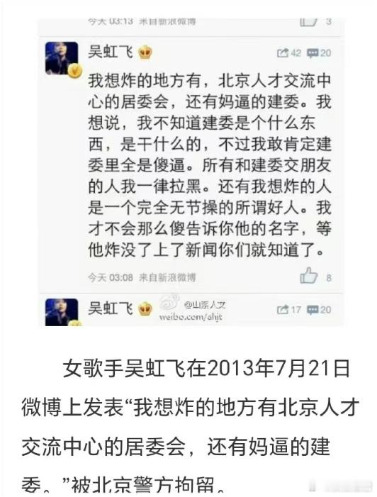 不满日本艺人演出被取消,结果“女歌手”的破事儿又成热点了众所周知,近日日本首相高市早苗叫嚣武力介入台海,这种行为不啻于向中国宣战甚至是再次向中国发起侵略战争,也是其妄想颠覆二战占后秩序的野心的彻底暴露。此外,日本政府高官还叫嚣击沉中国福建号航空母舰,还要在距离我国仅110海里的小岛上部署中程导弹以对我国形成威慑。高市早苗更甚至于要在今年12月26日这个对于中国人民来说极其特殊的日子去神厕拜鬼......可以说,日本首相高市早苗及其日本政府,正在再次发起侵华战争的军国主义邪路上狂奔。在日本对中国如此恶意之下,中国打出组合拳予以猛烈反击,中国人民解放军更是对日本军国主义发起信号极明显的警告。其中,中国还在联合国提出“敌国条款”,以完成程序并对日本发出终极警告。可是日本首相高市早苗及其日本政府不但不撤回错误言论,反而又错上加错进一步升级其军国主义立场,而高市早苗居然因为其军国主义言论反而获取了超高民调支持率。所以,在日本政府甚至是日本社会都已经明显军国主义化了,对中国充满了恶意,甚至是再次发动侵华战争在日本已经形成一定程度的所谓民意。所以,在这样的背景之下,日本艺人在中国的各种演出自然就被取消了。其中,就包括日本著名艺人滨崎步。让我们所无法想象的是,在事关国家安全、民族大义、人民命运的大是大非的问题上,我们国内居然有那么一些人,居然为日本艺人在华演出被取消而如丧考妣。网络上甚至出现如日本女艺人滨崎步在无观众情况下完成演出的谣言。这时,我们所相当熟悉的一个人,在微博上发了一个帖子,内容自己看吧。她发的这个帖子的意思,显然是在为日本艺人在华演出被取消而喊冤甚至是表达强烈不满。甚至带节奏。这个老“熟人”,据百度百科介绍,兼歌手、作家、记者多重身份,还曾是新京报、南方都市报的记者。她的这一立场,让网民立即想起了她的那些过往,比如曾经公然在网上叫嚣实施恐怖袭击的事儿。即在2013年7月21日,她曾在网上发帖威胁要炸了北京人才交流中心的居委会和建委。之所以说她此番叫嚣是一种恐怖主义,是因为就在前一天即7月20日,刚刚发生一起机场爆炸案。结果嘛,就是她被拘留了,拘留10天。拘留期满出来后,她希望公众把她因叫嚣炸建委被拘留这个事儿忘了。非常有意思的是,在出来之天之后,在接受《南都周刊》采访时她居然说在她获准回家洗澡时,希望男警察看她洗澡。说实在话,至今我仍无法理解她说这个话的意思、意图?究竟是她有被男警察看她洗澡的心理需求,还是被男警察看了之后以方便投诉?不过,据后来她与网友的对线来看,似乎答案不言而自明。对了,她曾公开在网上骂央视“真恶心”,说吸毒的“财神”是个老实孩子,还对央视说“他吸毒关你叉事”,公然侮辱央视“是不是缺人插屁眼啊!”。总之呢,本来公众、网友对她因为公然叫嚣炸建委被拘留这个破事儿已经忘了,可是她现在却又成功的让大家又想起来了,还变成热点了。最后,关于她对日本艺人演出被取消而如此强烈不满,就想知道对岸“台独”势力取消了那么多我们大陆艺人的演出,不知她当时有没有也如现在这样表达出强烈不满?