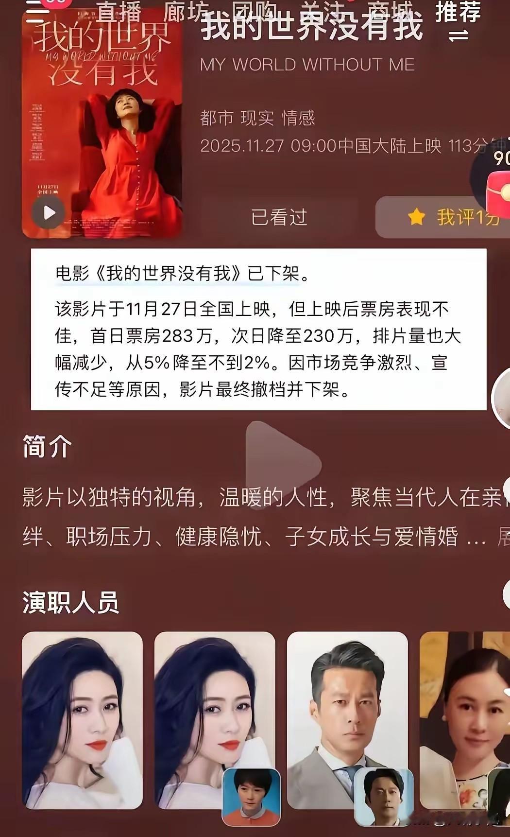 田海蓉的新电影因排片不足,上映一个星期后匆忙撤档,让人始料不及。 记得前几天还刷到过场场爆满,一票难求,当时就有人说有刷票的嫌疑,现在看来这个嫌疑几乎是真的,如果场场爆满的一票难求的话,影院不可能有钱不赚,不给电影拍片,排片跟上去了,票房自然就有保障,根本就不可能提前撤档。 不过现在回头看,提前撤档似乎也在意料之中,11月27日上映的电影,在11月26日预售票房才5万,在猫眼上也只有几千人表示想看,哪怕是一部小众电影,这个成绩也差强人意。 田海蓉在首映礼上大呼我爱你们,也没能让多少观众心甘情愿掏钱去看这部电影。 田海蓉今年似乎有点流年不利,前段时间被陈青松连累,口碑受损,现在执导的电影又提前撤档,妥妥亏钱的节奏。