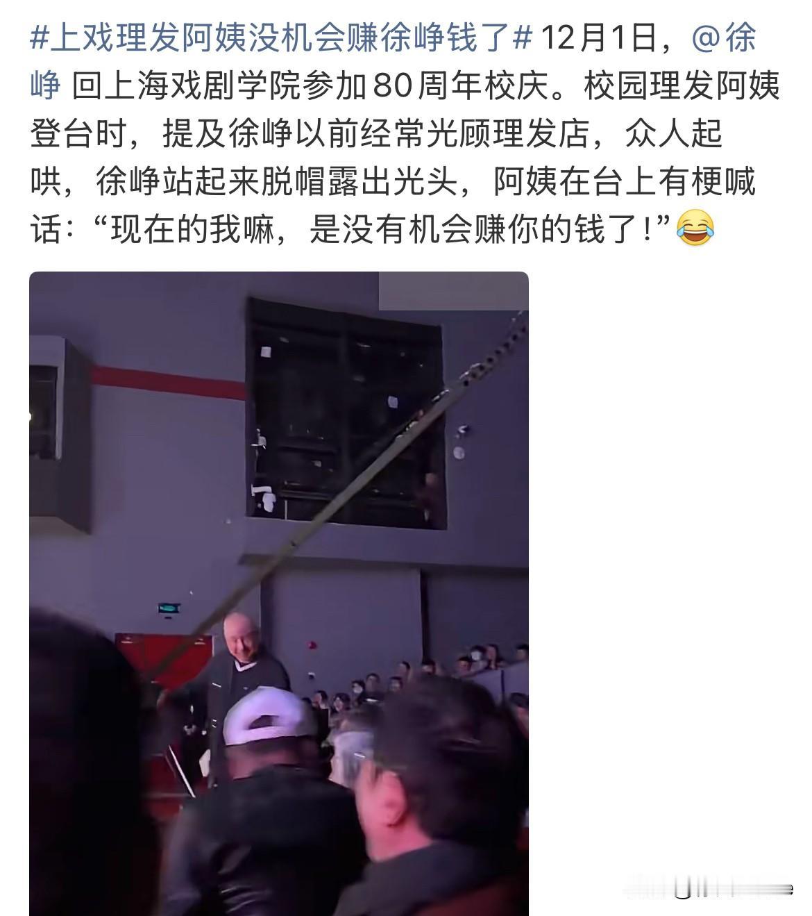 12月3日,徐峥现身上戏校庆,上戏剪头阿姨对徐峥说的一句话,引发全场哄堂大笑! 徐峥坐在第一排,王传君,雷佳音,江疏影,郑恺及其妻子苗苗坐在第二排大笑鼓掌! 在上戏,剪头阿姨也是可以登台的,她回忆起徐峥上学时经常到她那里剪头,徐峥脱帽示意,阿姨笑着说,以后赚不到他剪头钱了