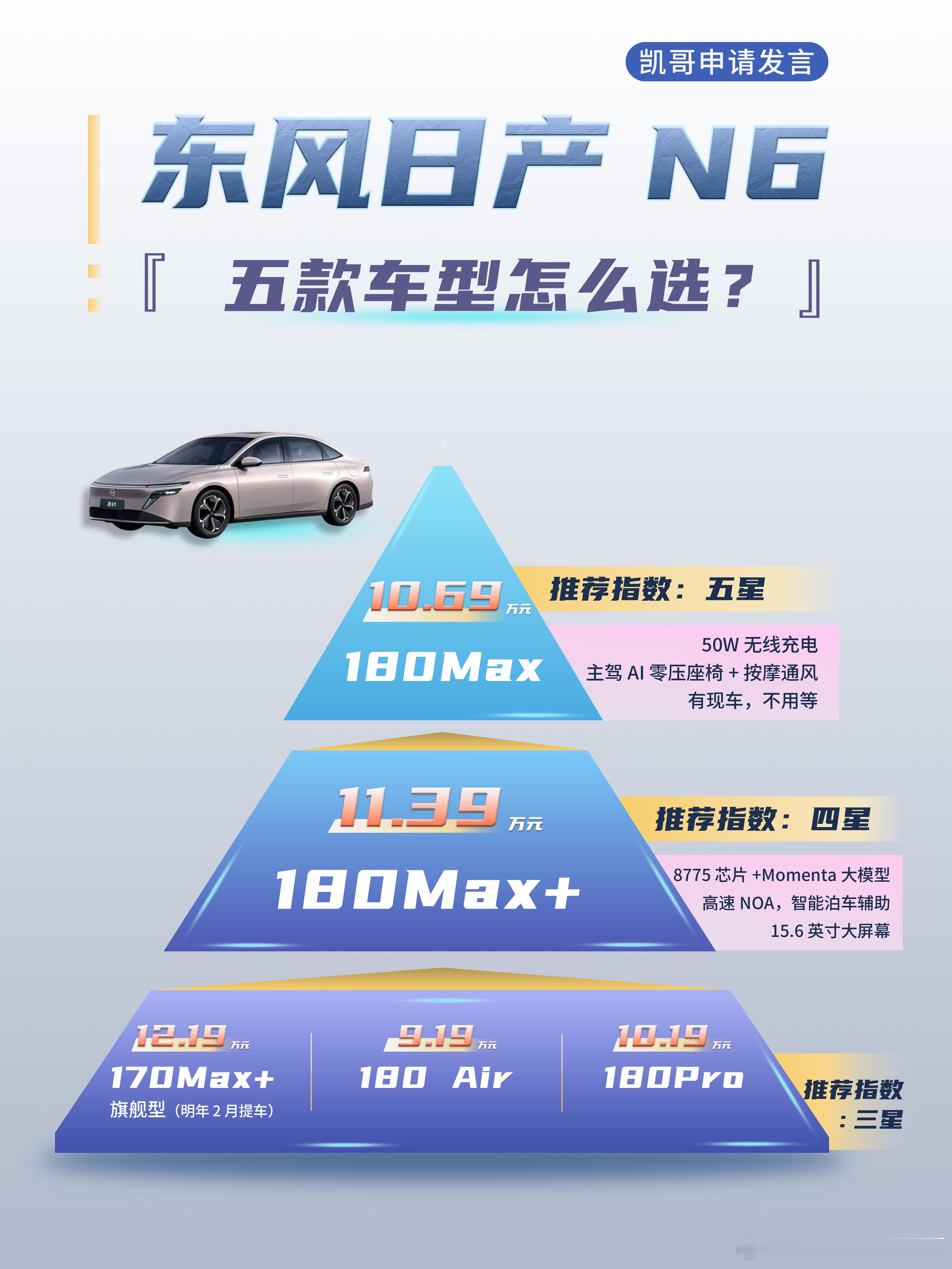 东风日产N6央企合资插混N6上市9.19万起一张图看懂,东风日产N6选哪款最划算!昨天价格出来后,后台很多网友就问选哪款,180Max+性价比挺高的,但要明年2月才交车,要等着过年的还是选180Max版吧!有现车。如果不差钱,170max+旗舰型就是“全都有”那款了!