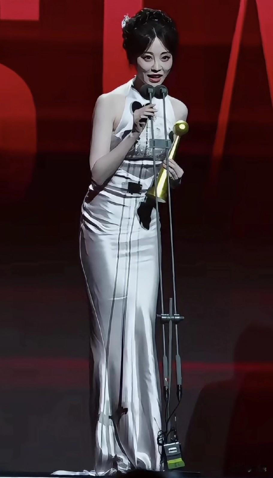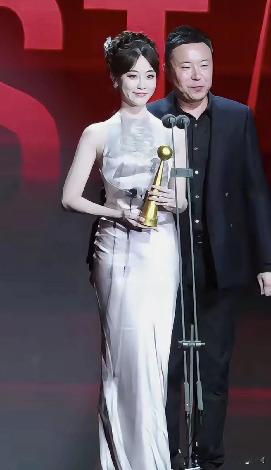 在颁奖舞台的聚光灯下,祝绪丹身着一袭优雅的浅色系长裙,手持金色奖杯,温婉气质。