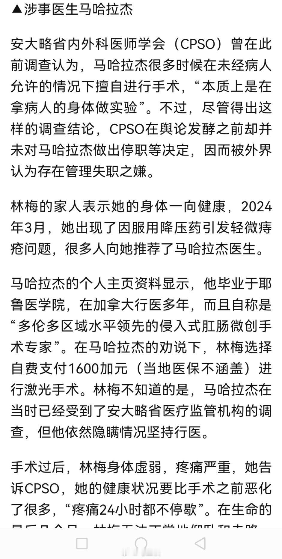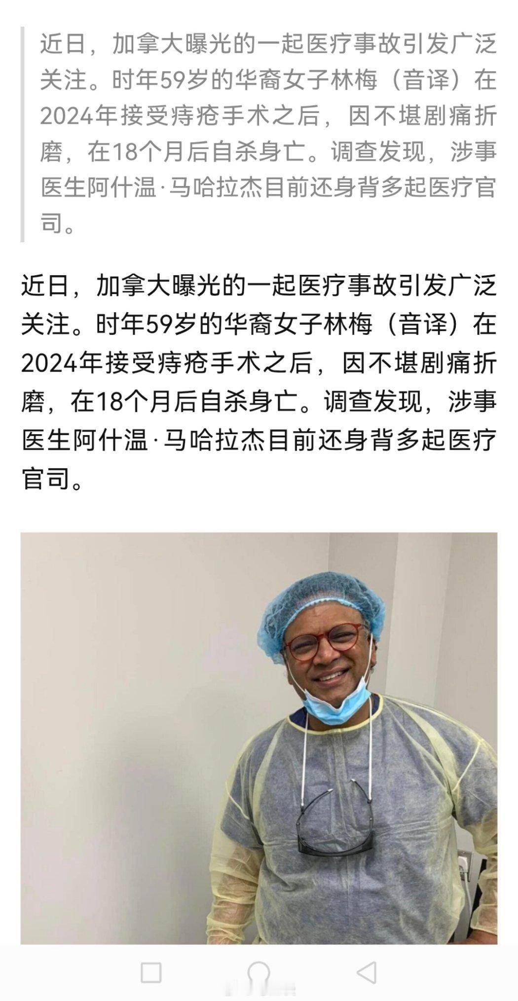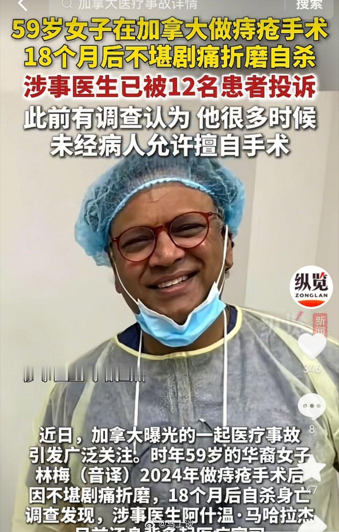 华裔女子痔疮手术后不堪剧痛自杀 一看印度裔医生,一看是加拿大…说不定,这家伙的耶鲁医学院证书都是假的。他胆还贼大,多次不经病人同意给人做手术,已被多人投诉调查。在加拿大的华人自求多福吧…
