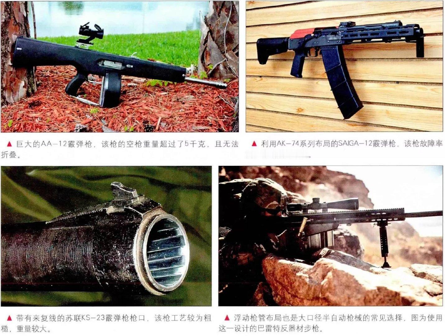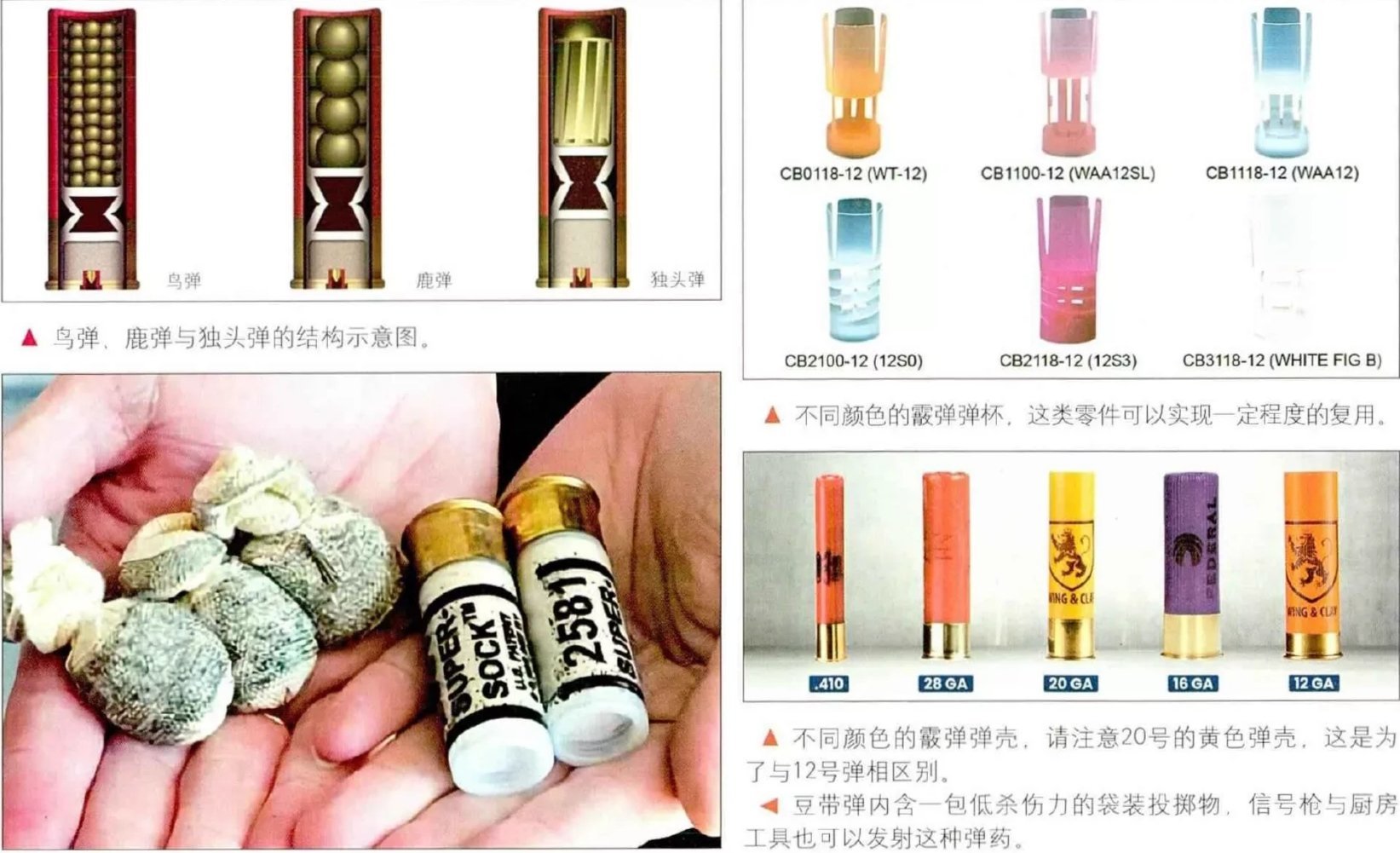 很多人认为,让霰弹枪管内有膛线并不是个好选择,因为这会让弹丸因为自旋导致密集度增加,反而违背了霰弹枪的最初目的。但是总有人想这么干,并且实现方式还有很多种。 首先就是为霰弹枪管增加膛线。例如苏联的KS-23就是这样的。这是一款4号霰弹枪,口径23毫米。之所以要为枪管增加膛线,主要是因为该枪的特殊需求。这个枪是上世纪70年代苏联内务部招标的用干控制监狱暴动的防暴武器,要求把催泪弹准确地投掷至100-150米远。所以中央科研精密机械设备建设研究所在设计时增加了膛线。第二种方式就是使用喉缩管。所谓喉缩管是在枪口处缩小枪管直径,让弹丸更加密集的一种枪管配件,外观是一截直径略小于枪管的小圆筒,通过螺纹拧进枪管口,当然也有在枪口处额外加装的,例如Saiga-12.在喉缩的作用下,弹丸射出枪管时的距离更加紧密,在远距离的扩散也随之减小。这样一来就能更准确的命中远距离目标。特别是在射击鸟类或飞盘靶时,喉缩管是一种极为重要的配件。由于喉缩内径大小可以调节,所以通过安装不同内径的喉缩甚至可以多次改变某一种霰弹枪的弹道,这个是膛线做不到的。更重要的是喉缩加工和安装相对比较简单,可按需装卸。这种零件并不是现代枪械设计师的独创,它的设计思路来自于二十世纪的锥膛炮。 Pancor Jackhammer霰弹枪是这类枪械创新设计的代表。这款枪采用了预装转轮弹巢。该枪的设计师是约翰·安德森。他是一名参加过朝鲜战争的美军老兵,因此他十分关注载弹量与精度之间的关系。安德森在设计这款沉重的霰弹枪时采用了浮动枪管。这种结构是将枪管除了紧锁于机匣一端外,其余部分跟护木及其他零件都不接触,以便增加射击精度。巴雷特狙击步枪就采用这个技术。当然了,该枪的后续发展并不顺利,在美国军方的测试中,该枪复杂的结构导致枪械重量过大不说,由于设计极为精密,制造工差稍大就不能实现自动射击,最终被淘汰。 霰弹枪的口径复杂,配用弹药其实更复杂。它的弹头由金属弹丸、弹杯和外壳组成。弹丸由金属铅、钢或者铋制成。由于霰弹打出去的是多个散装弹丸,因此弹丸大小和数量不同。大家很可能听说过独头弹、鹿弹和鸟弹这样的分类。其实霰弹的种类远比这个复杂。 通常来说,鸟弹用于打击鸟、松鼠或者兔子一类小型目标,一般装填大量直径较小的颗粒状弹丸,或者理解成铁(铅)砂。鹿弹一般装填颗粒较大的弹丸,杀伤作用较为明显,一般打击像中型体量目标,民用领域的看家护院也多使用鹿弹。独头弹则是一个大型弹丸,一般打击野猪、熊等大型体量目标。在民用狩猎领域,鹿实际上属于大型体量目标,要打鹿的话,需要用独头弹。 独头弹就是在弹壳内就装上一个弹丸,所以没什么标号。这种弹药按照重量分类,以盎司为单位,通常在0. 875盎司到1. 125盎司之间。1盎司大约是28. 35克,或者是接近6钱。有的独头弹弹壳内就刻槽,能够产生轻微自旋,提升射击精度,但是一般射击距离不超过100米。 鹿弹的标号包括0000\000\00\0\1-4号,中间还有半标号。数字越小弹丸越大,一般弹壳内装填8-12颗。不同标号的弹丸以重量为依据,以美制格令为单位,0000号重量为82格令(约5. 31克),最小的4号为20. 7格令(约1. 3克)。鹿弹射击距离一般在40米以内。 鸟弹的标号包括BBB\BB\B\1-9号,中间也有半标号。这种弹药也是数字越小弹丸越大,弹壳内填充25-900颗不等。不同标号的弹丸以重量为依据,以格令为单位,BBB号重量为10. 2格令(约0. 7克),最小的9. 5号为0. 63格令(低于0. 1克)。另外也有称7. 5号至9. 5号为碟鸟弹的特种弹药。鸟弹射击距离一般也在40米以内。 其实比鸟弹还小的弹药也存在,就是标号10号至12号以及DUST(“粉末”)弹。这种弹药的弹丸最大的为10号,重量为0. 51格令,最小的DUST只有0. 1格令或者更小,这类弹药也被称为除虫弹,用处很少。 有些国家和地区的法律规定不允许使用铅弹,因此又诞生了钢珠弹。用于在水迹打击水禽。钢珠弹只有FF、F(或TTT)、TT、T四种标号,不同标号的弹丸以重量为依据,以格令为单位。最大的FF号重量为18. 2格令(约1. 18克),最小的T号为12格令(0. 8克)。其威力大体上位于鹿弹和鸟弹之间。 除了标准杀伤性霰弹外,还有一些特种霰弹枪弹药。第一类是非杀伤性的,例如豆袋弹或岩盐弹。前者是尼龙薄布抱起来的塑料球,后者则是使用岩盐作为弹丸。这两种弹丸侵彻力都很低,但是命中人体后会产生剧烈疼痛,所以停止效果比较好。还有一些化学弹药也属于非杀伤霰弹,例如催泪瓦斯弹等。第二类是反器材霰弹。例如破拆弹用于破门,该种弹药弹丸易碎,不会穿透门后杀伤门后人员。第三类则是强杀伤弹药。比较典型的有脱壳弹与箭头弹。脱壳霰弹与坦克滑膛炮发射的脱壳弹理论完全相同,其弹头外有弹托,配合喉缩管可以增加弹药的射程和精度,箭头弹则发射金属制的箭头,破甲能力较强,多用于反恐以及射击表演。 霰弹枪的弹壳也被称为弹杯,它一般为塑料件。主要有两个作用,一是承装。也就是将大量弹丸牢固固定在弹壳里。再就是增加气密性。 另外霰弹枪弹药的弹壳长度和颜色也有区别。无论何种标号的霰弹枪,其子弹全长一般就三种,2. 75英寸(70毫米),3英寸(76毫米)和3. 5英寸(89毫米)。其中2. 75英寸长度霰弹适用于10, 12、16、20、28、.410号霰弹枪。3英寸的适用于10、12、20、28、.410号霰弹枪。3. 5英