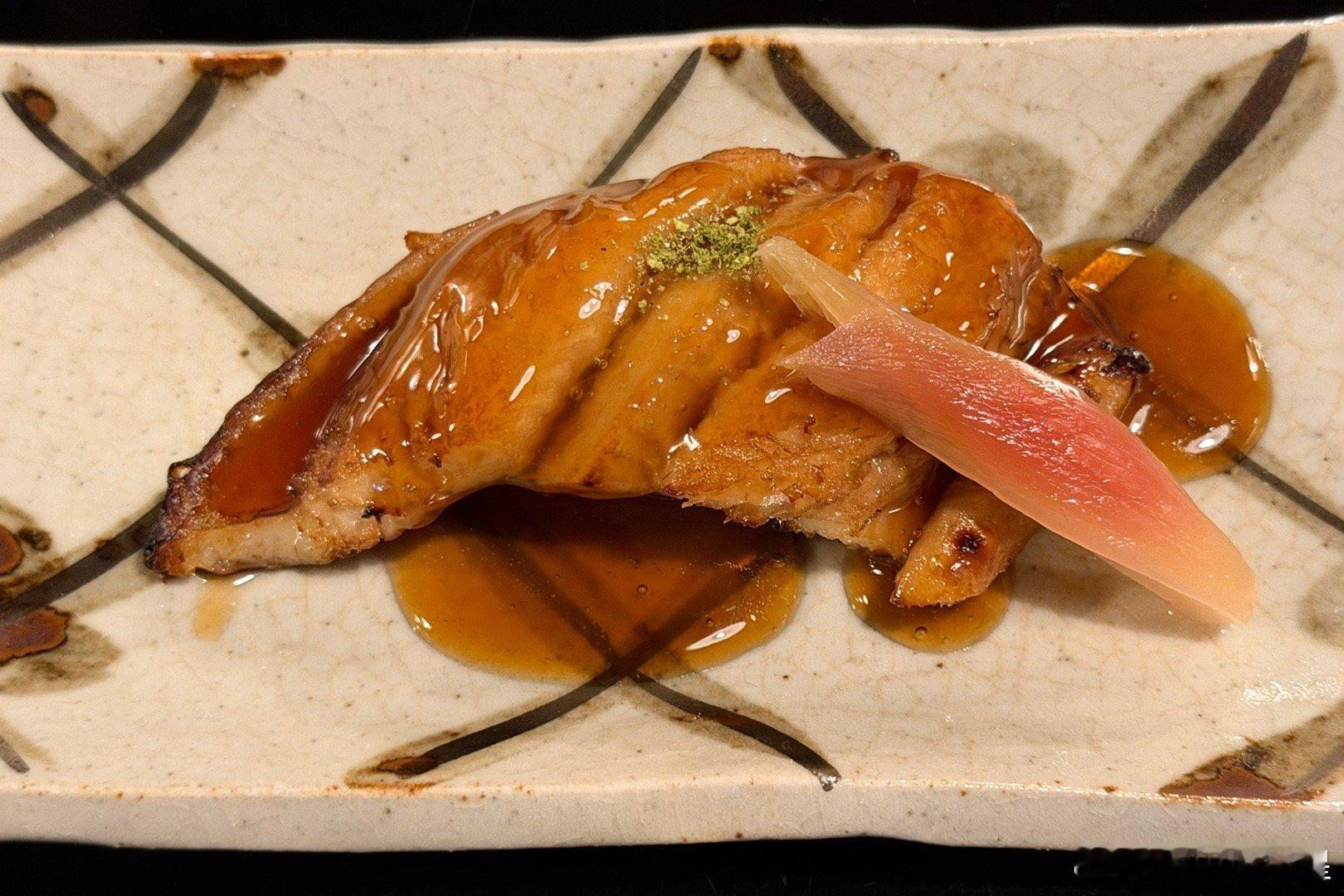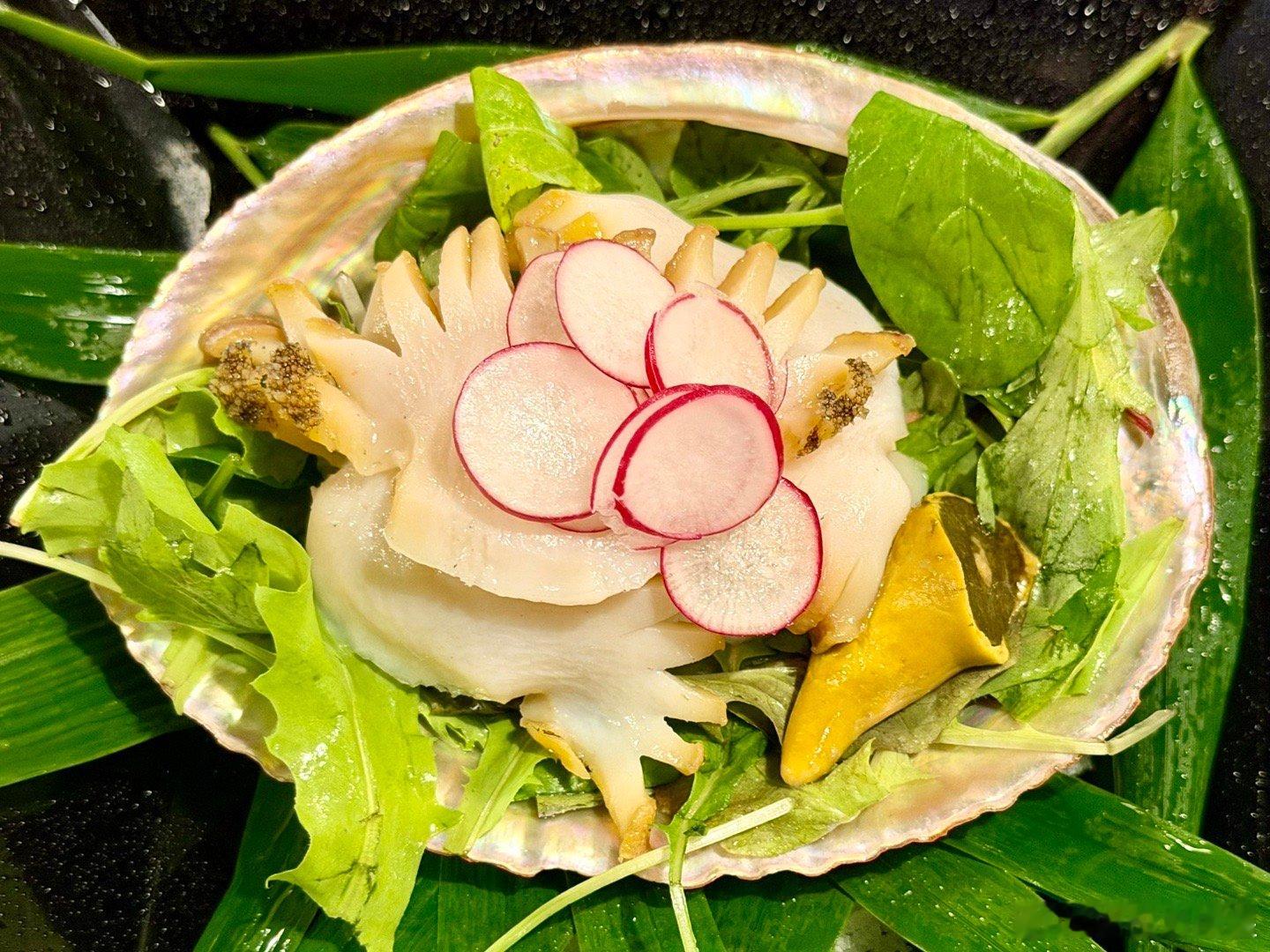 万龟楼,京都米其林二星,三十代传承的御膳,有职料理。首先是欢迎酒和先付(图1),内容是雪蟹肉,菠菜,柚子醋。然后是鲜美的椀物,内容是松茸,鱼糕裹方头鱼(甘鲷丸子,图2),菠菜,胡萝卜,柚子。都很好吃,用外套降魔封印的柳木筷子。刺身造里(图3)是金枪鱼,真鲷和乌贼,里面的山药和梨一样。然后是一盘鲍鱼(图4),鲍鱼口感好,旁边的鲍鱼肝很香。图6的八寸也叫“嶋台”,一个味道可以的方形皿中是豆腐沙拉配胡萝卜、麸朴、蟹味菇、甜椒、杏仁。一个小碗里是白虾和鱼子酱,很好吃。前面三道是土豆丝裹炸虾、厚煎蛋和银杏馅丸子,淡香口。图7是強肴,鳗鱼寿司和甜醋茗荷,真好吃。图8是浓香的烤物,烤伊势龙虾配海胆,松茸,酢橘。之后是煮物,金目鲷配虾芋、水菜和柚子,甜美润嫩。图5是海胆炊饭,配赤味噌汤和酱菜,好吃。图9甜品是江户柿,配白葡萄酒冻和石榴。最后是栗子金团和宇治抹茶。上乘的美食,果然是世界非物质文化遗产“和食”的传承地。谢田的米其林之旅