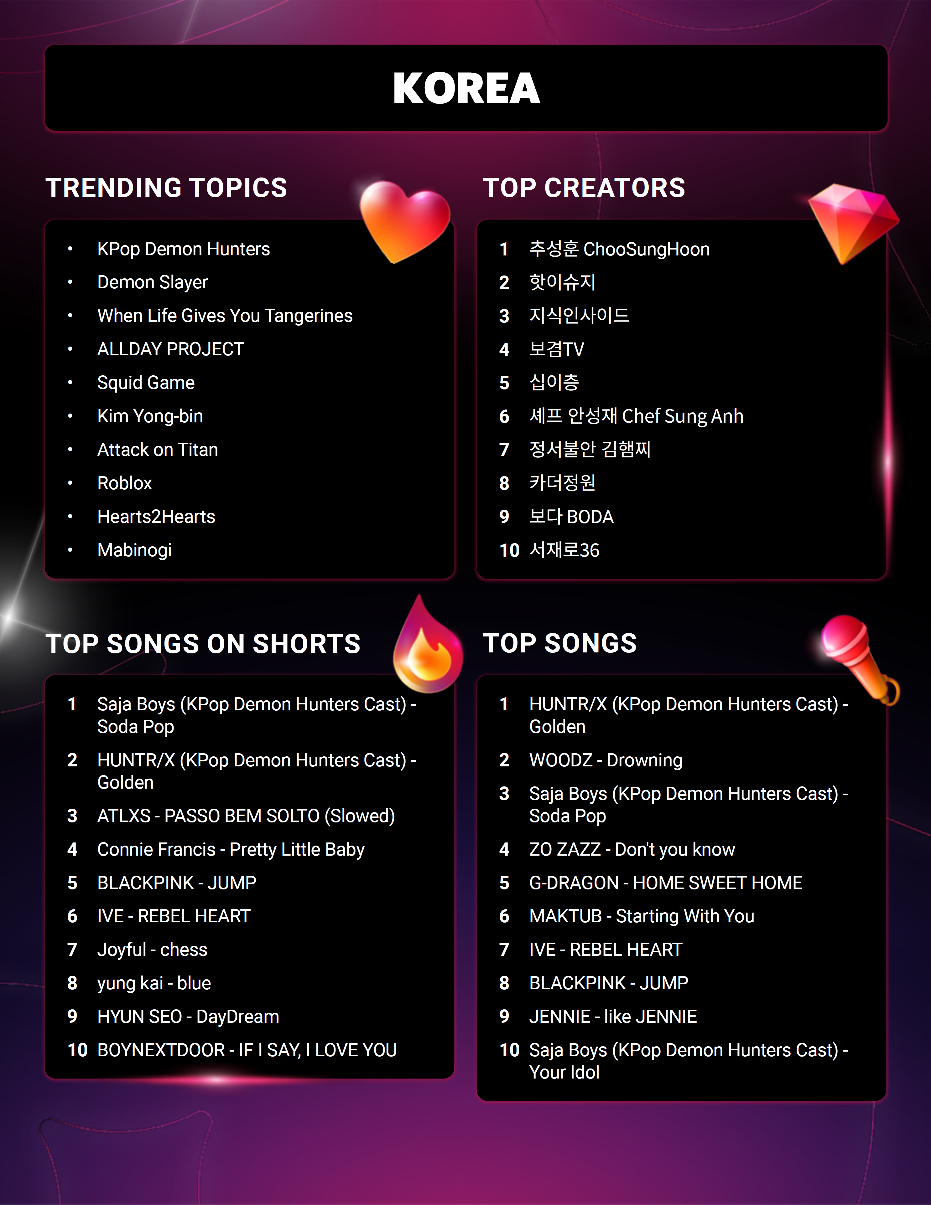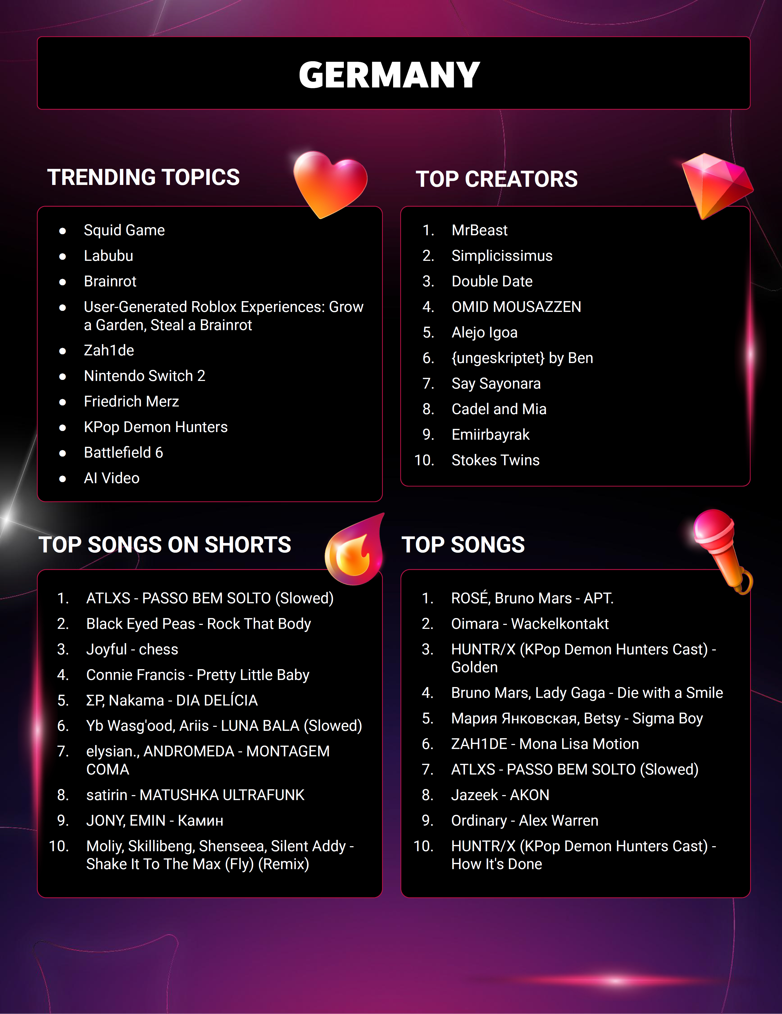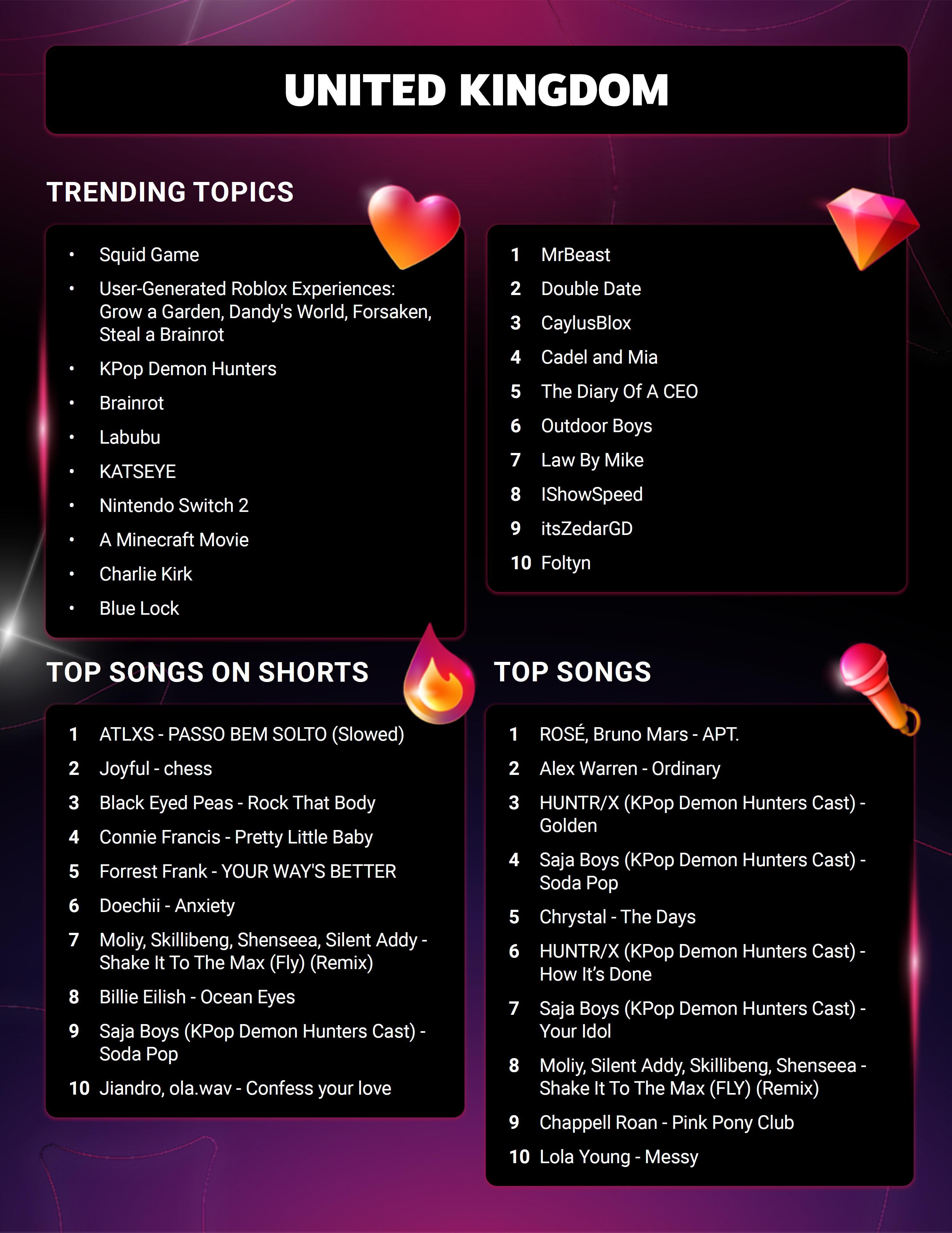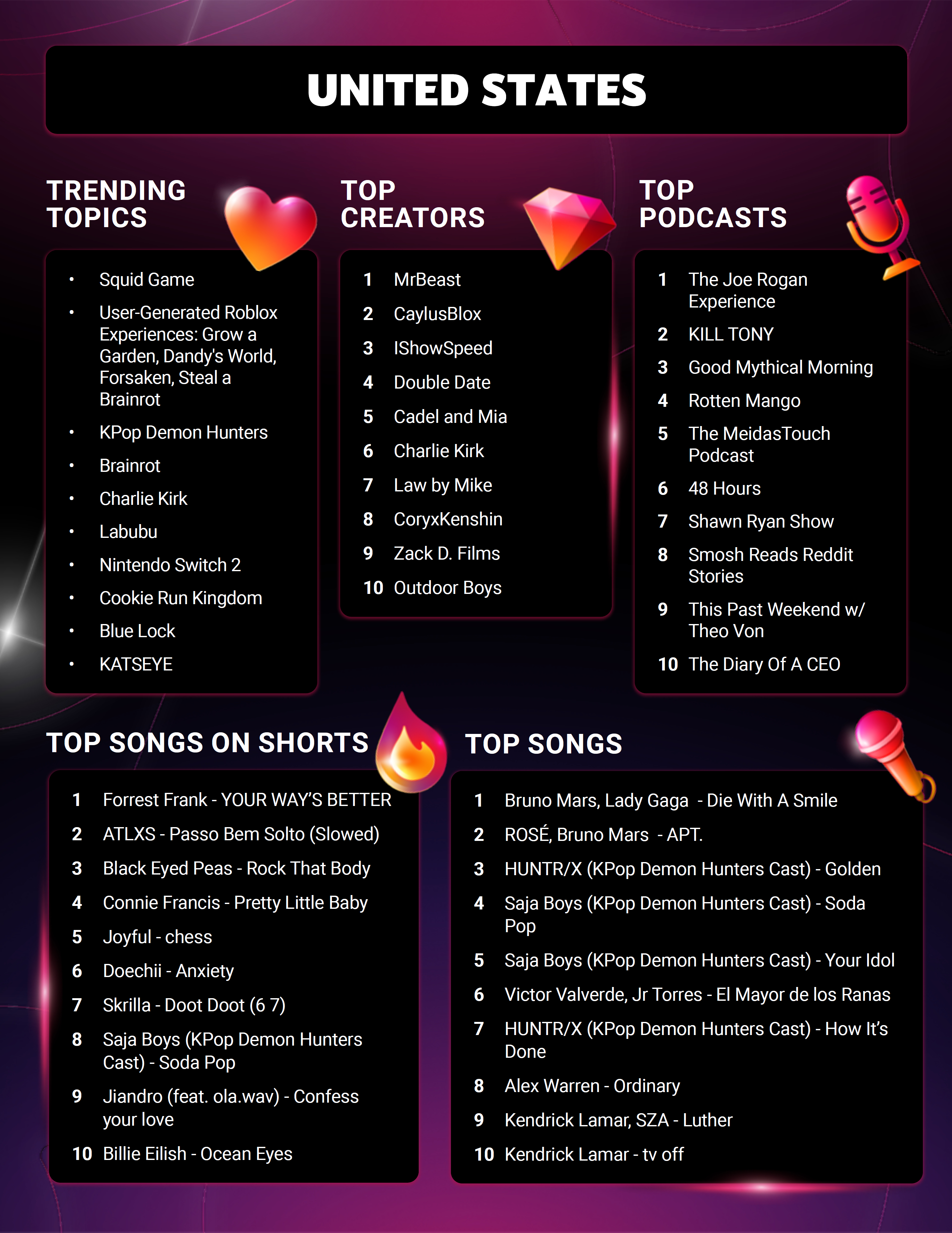 YouTube公布2025年全球十二国年榜!Labubu和《鱿鱼游戏》《Kpop猎魔女团》等横扫各国年度热门话题Top 10!美国十大最热门歌曲里,Lady Gaga联手火星哥Bruno Mars爆单Die With A Smile获得年冠!ROSÉ朴彩英联手火星哥爆单APT.获得年亚!《Kpop猎魔女团》三首金曲包揽第3-5名!来看各国榜单!美国2025年度十大热门歌曲:1. Bruno Mars, Lady Gaga - Die With A Smile2. Rosé, Bruno Mars - APT.3. HUNTR/X (KPop Demon Hunters Cast) - Golden4. Saja Boys (KPop Demon Hunters Cast) - Soda Pop5. Saja Boys (KPop Demon Hunters Cast) - Your Idol6. Victor Valverde, Jr Torres - El Mayor de los Ranas7. HUNTR/X (KPop Demon Hunters Cast) - How It’s Done8. Alex Warren - Ordinary9. Kendrick Lamar, SZA - Luther10. Kendrick Lamar - tv off
