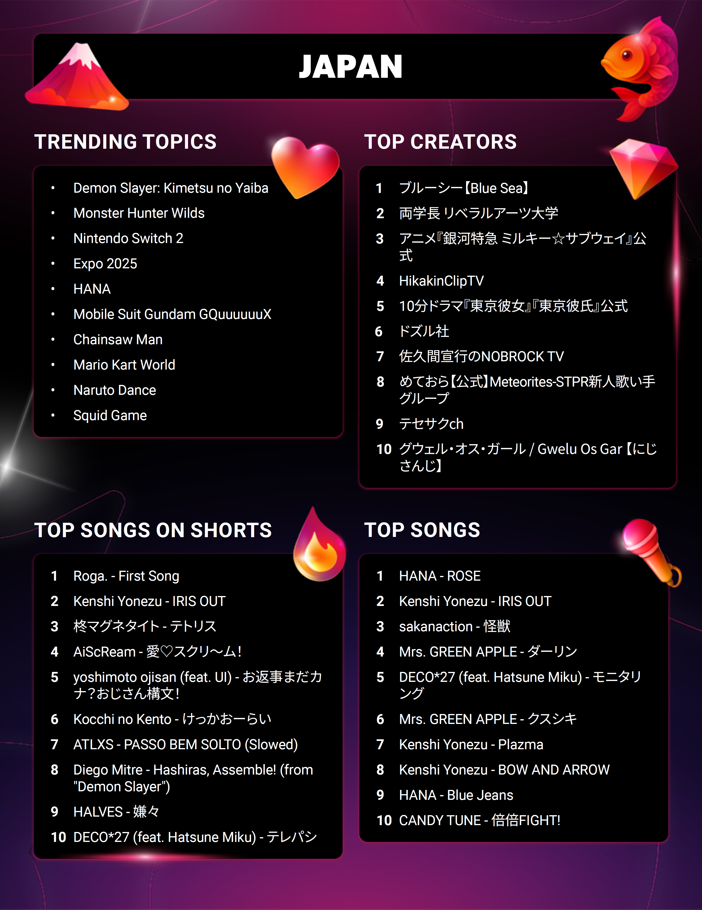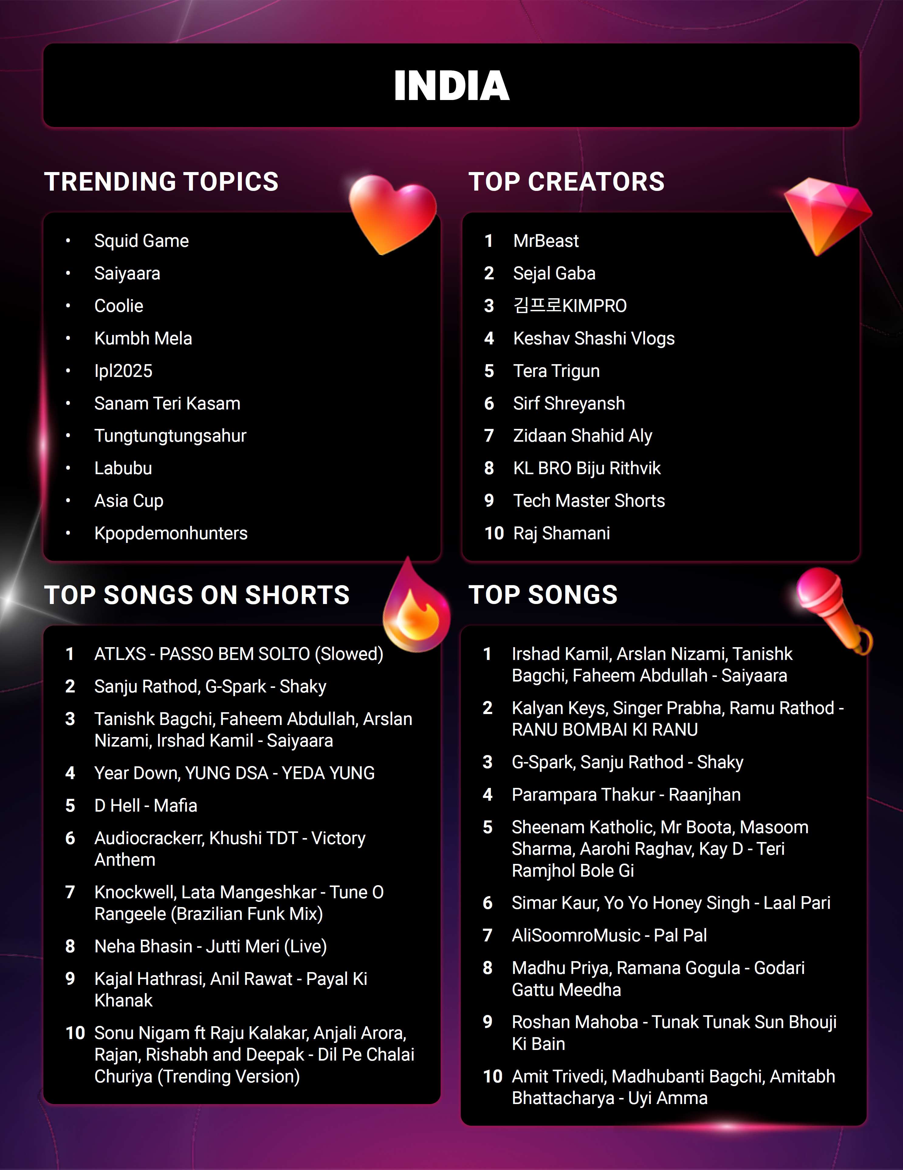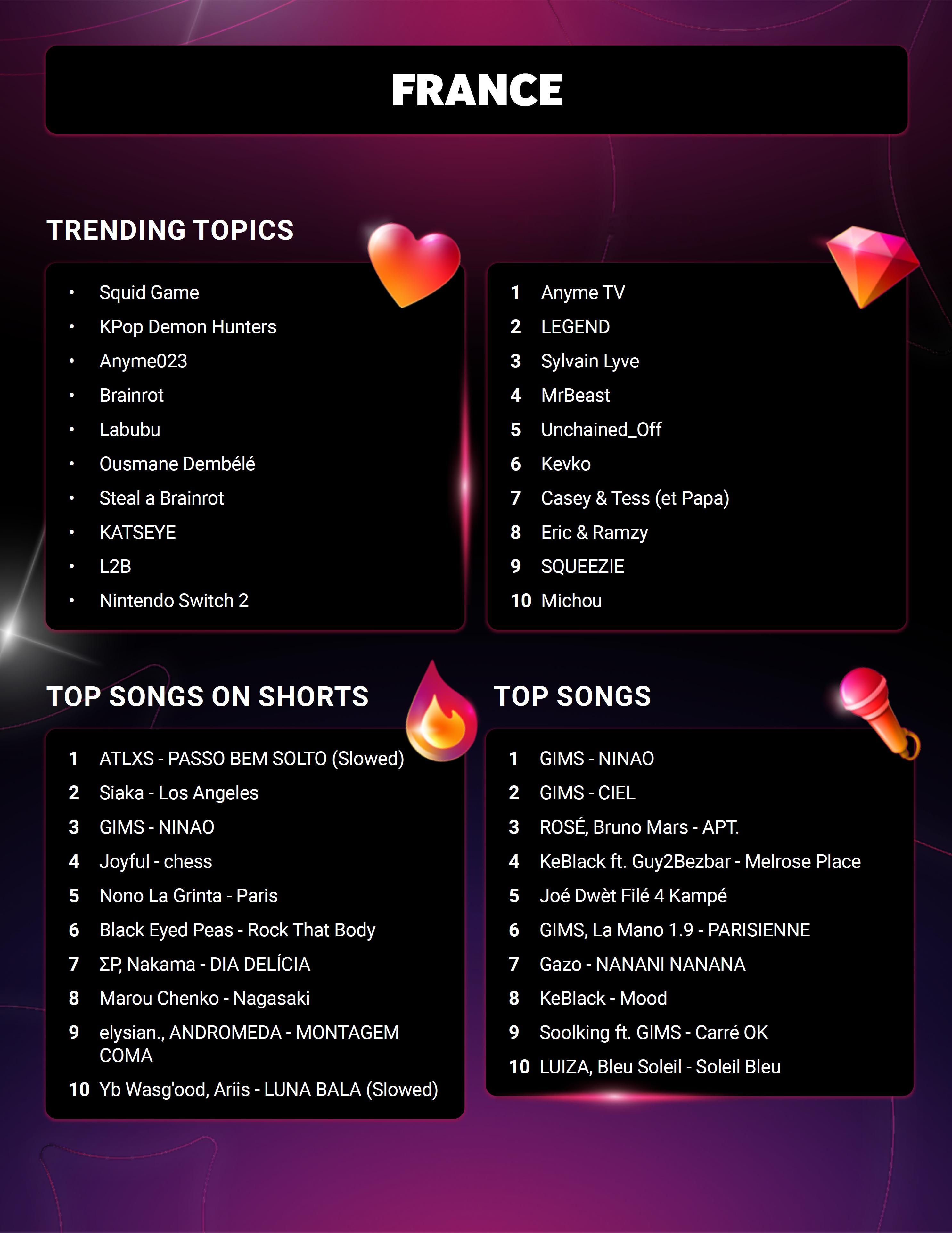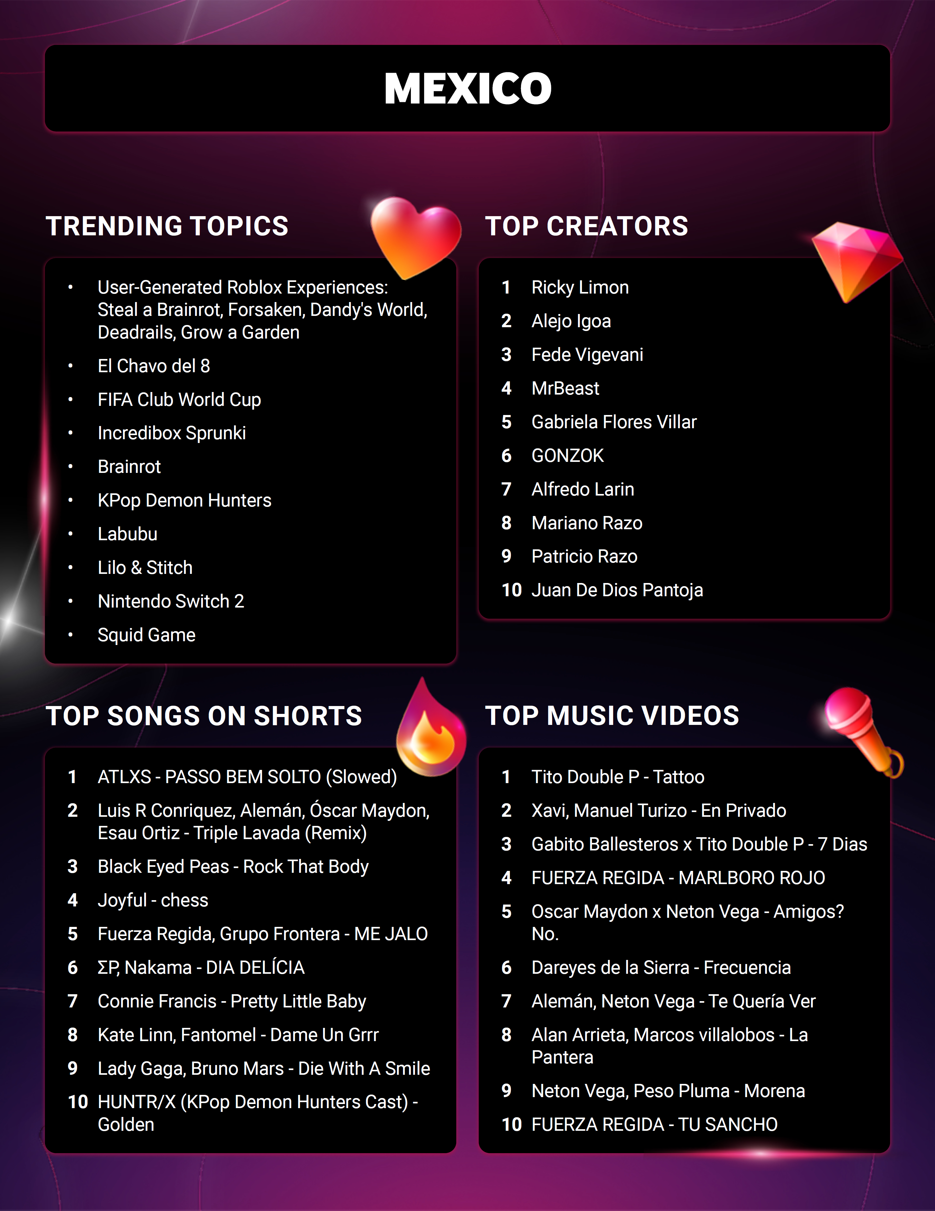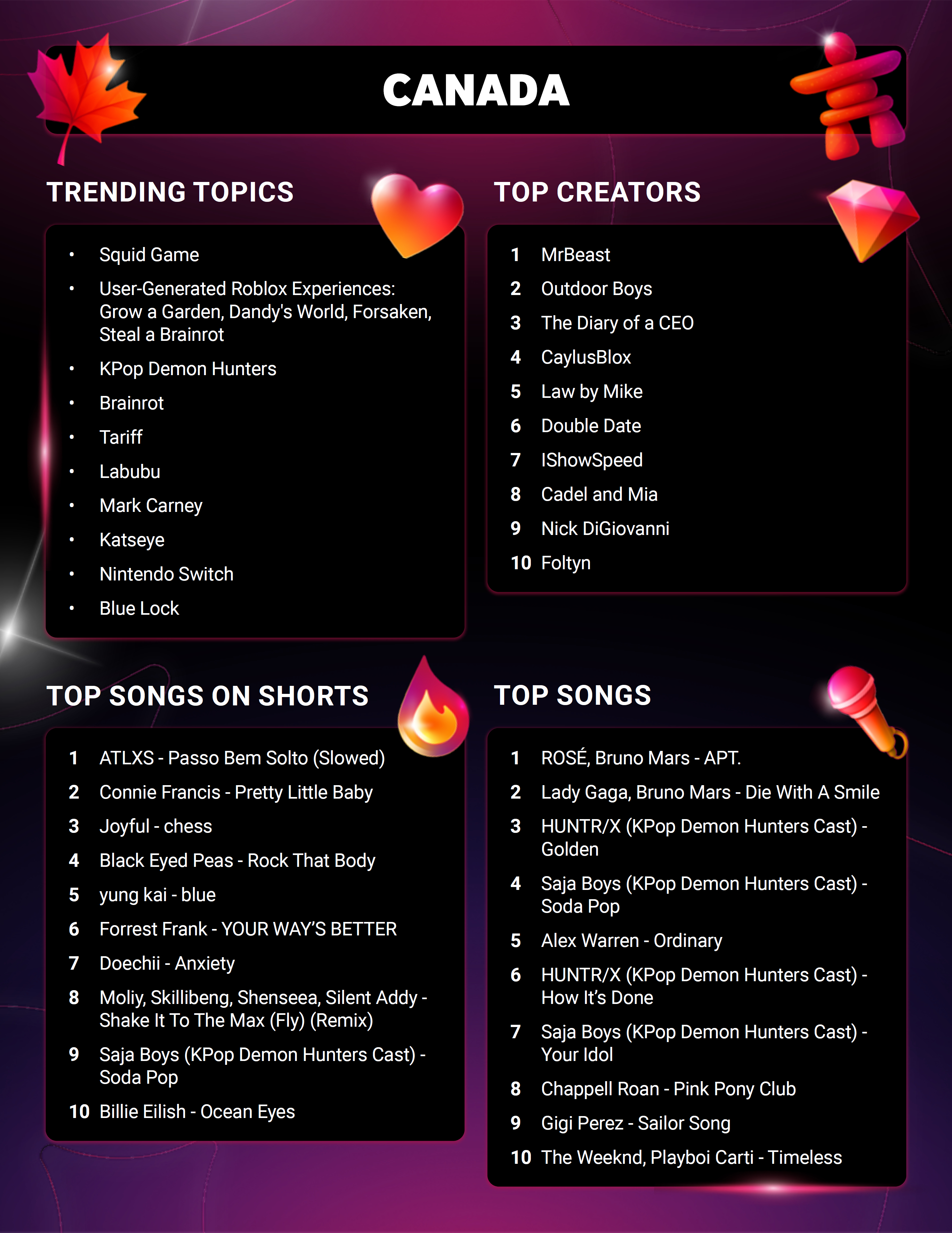 YouTube公布2025年全球十二国年榜!Labubu和《鱿鱼游戏》《Kpop猎魔女团》等横扫各国年度热门话题Top 10!美国十大最热门歌曲里,Lady Gaga联手火星哥Bruno Mars爆单Die With A Smile获得年冠!ROSÉ朴彩英联手火星哥爆单APT.获得年亚!《Kpop猎魔女团》三首金曲包揽第3-5名!来看各国榜单!美国2025年度十大热门歌曲:1. Bruno Mars, Lady Gaga - Die With A Smile2. Rosé, Bruno Mars - APT.3. HUNTR/X (KPop Demon Hunters Cast) - Golden4. Saja Boys (KPop Demon Hunters Cast) - Soda Pop5. Saja Boys (KPop Demon Hunters Cast) - Your Idol6. Victor Valverde, Jr Torres - El Mayor de los Ranas7. HUNTR/X (KPop Demon Hunters Cast) - How It’s Done8. Alex Warren - Ordinary9. Kendrick Lamar, SZA - Luther10. Kendrick Lamar - tv off