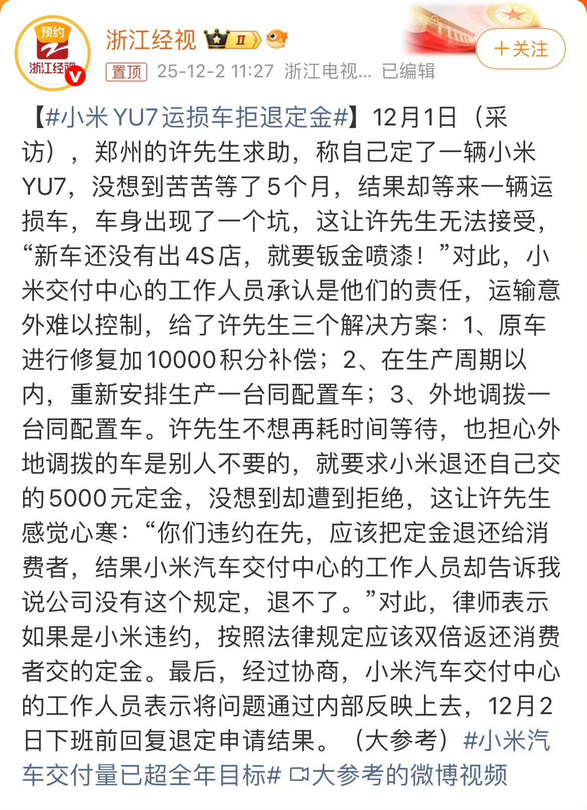 小米YU7运损车拒退定金我在想凭什么不退定金?你这三个解决方案消费者就是不满意啊,而且是小米违约在先,小米不是不愁卖吗?怎么搞这种事情