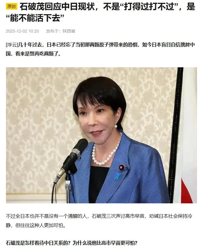日本前首相一句话戳穿真相,中日会不会打?答案藏在历史里! 高市早苗还在炒作 “台湾有事”,石破茂在电视节目里的反问太清醒:当年国力差美国十倍都敢偷袭珍珠港,现在难道要重蹈覆辙? 要知道,偷袭珍珠港的结局是两颗原子弹、全国废墟,这种赌国运的冒险主义,如今竟还在日本政坛抬头。现在中国的实力早已不是当年的美国可比,日本经济更是离不开中国市场,从稀土到日用品,命脉都绑在一起。 最讽刺的是,明明历史已经把“挑衅=毁灭”刻在骨子里,极右翼却还在煽风点火。石破茂的清醒发言,更像给狂热敲警钟:现在的冲突不是打不打得赢,而是敢不敢赌国家存亡。 和平从不是求来的,而是实力撑起的底线。你觉得日本政坛能听进这份忠告吗?